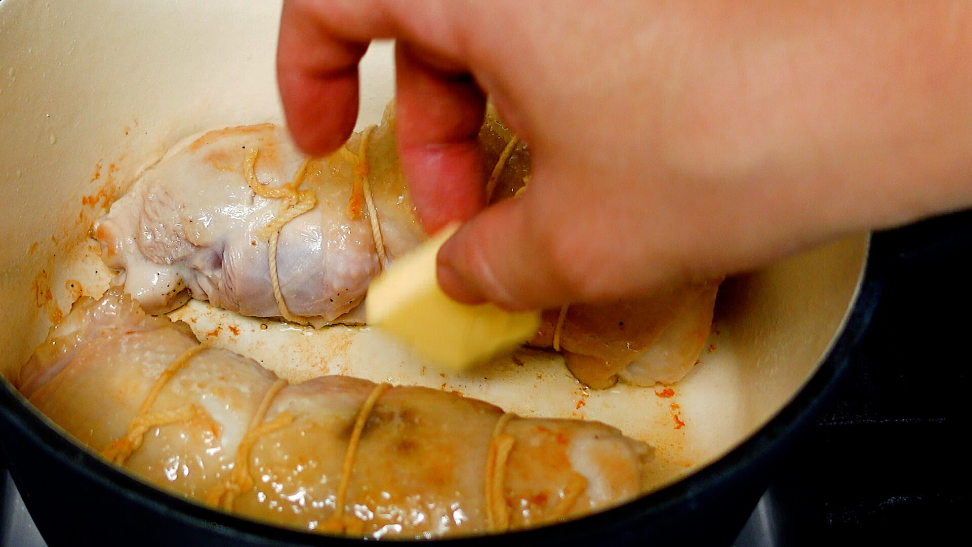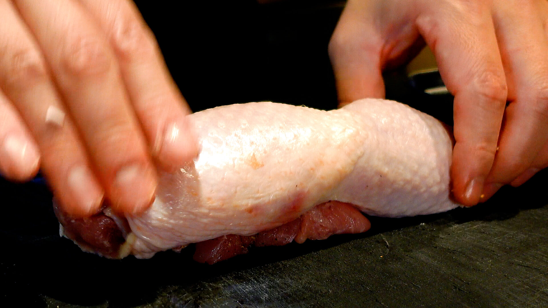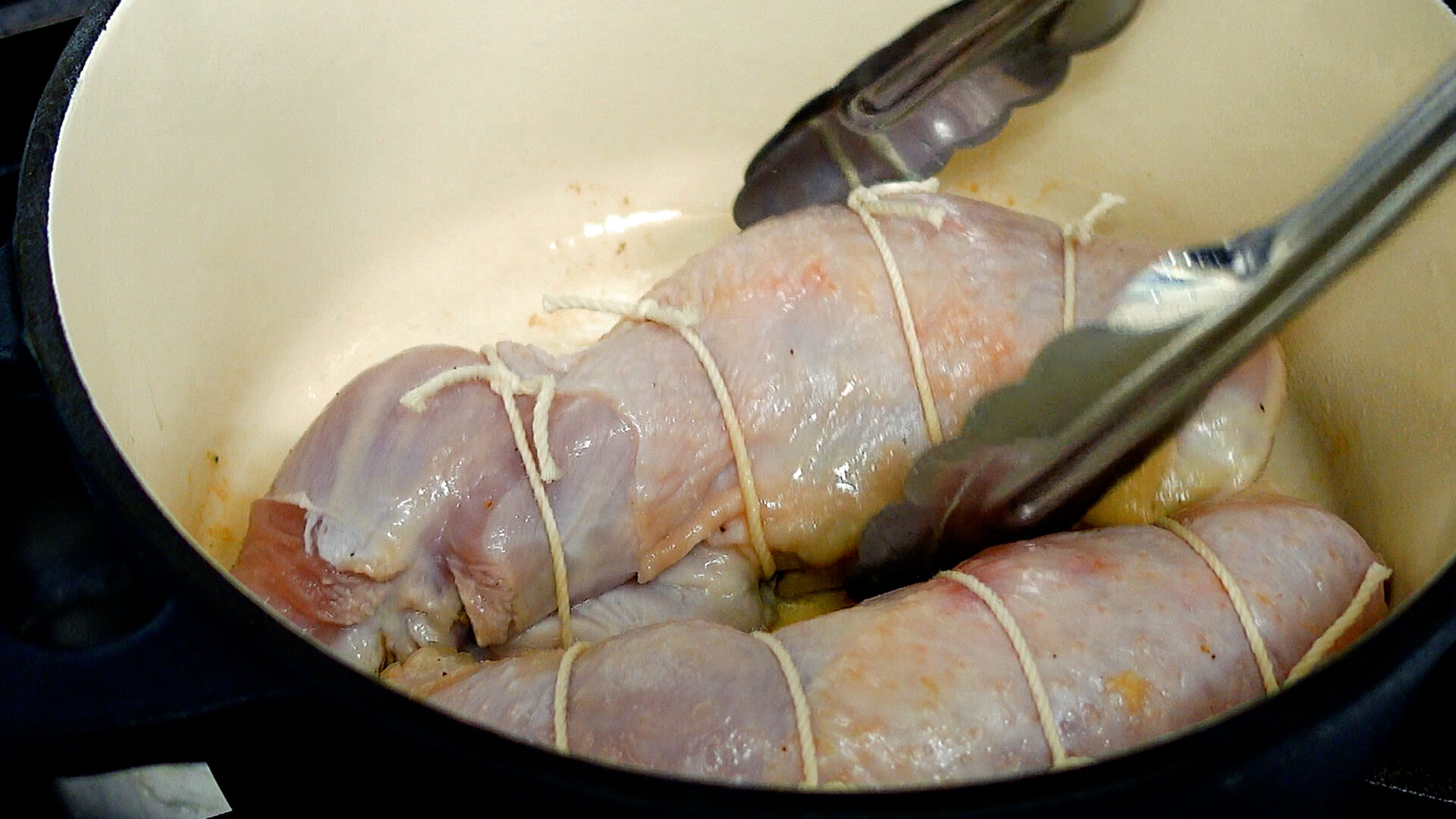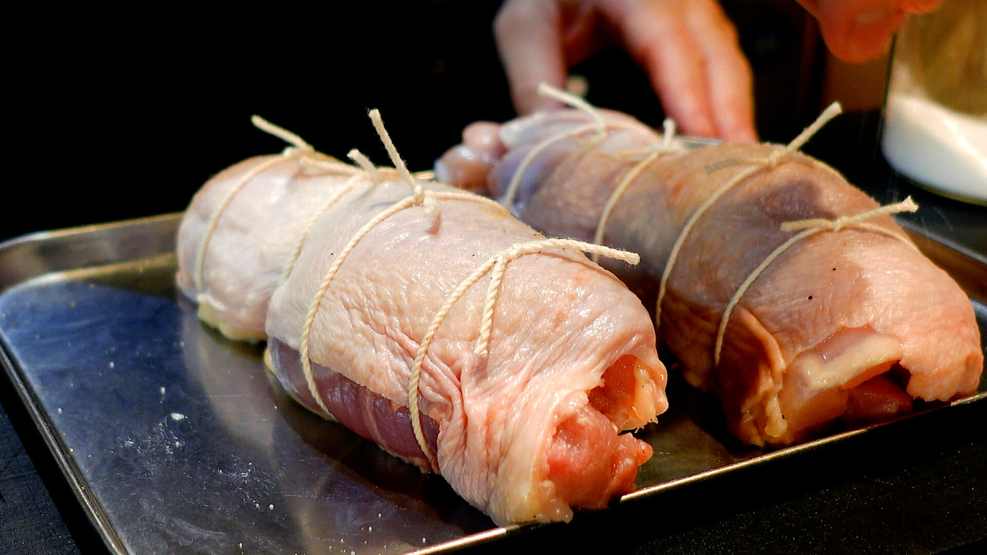 💡肉は火を通すと膨張するため、タコ糸で結ぶときは指1本入るぐらいのゆとりをもたせるのがポイント。余分なタコ糸は切っておきましょう。小さい鶏もも肉だと巻きにくいので、1枚300g以上がベター。