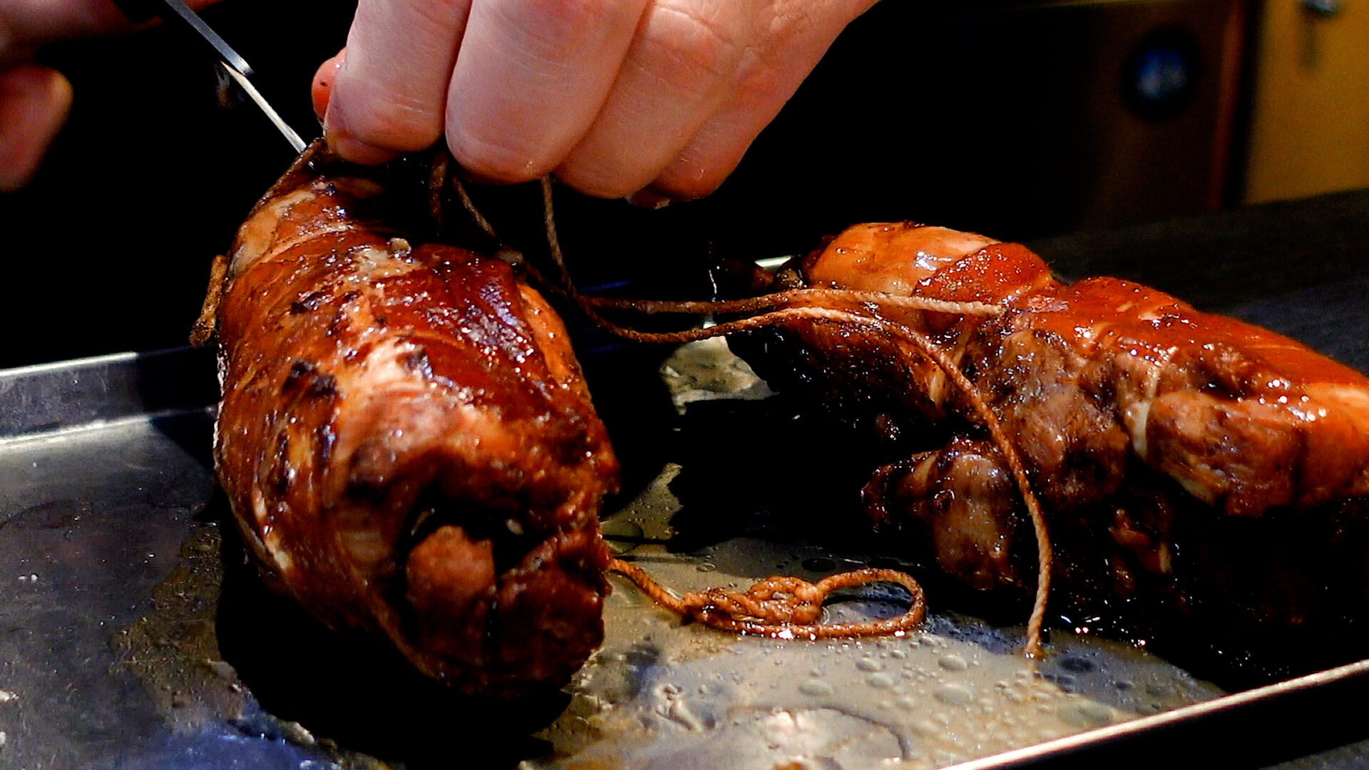 鶏肉のタコ糸を外し、好みの大きさに切る。