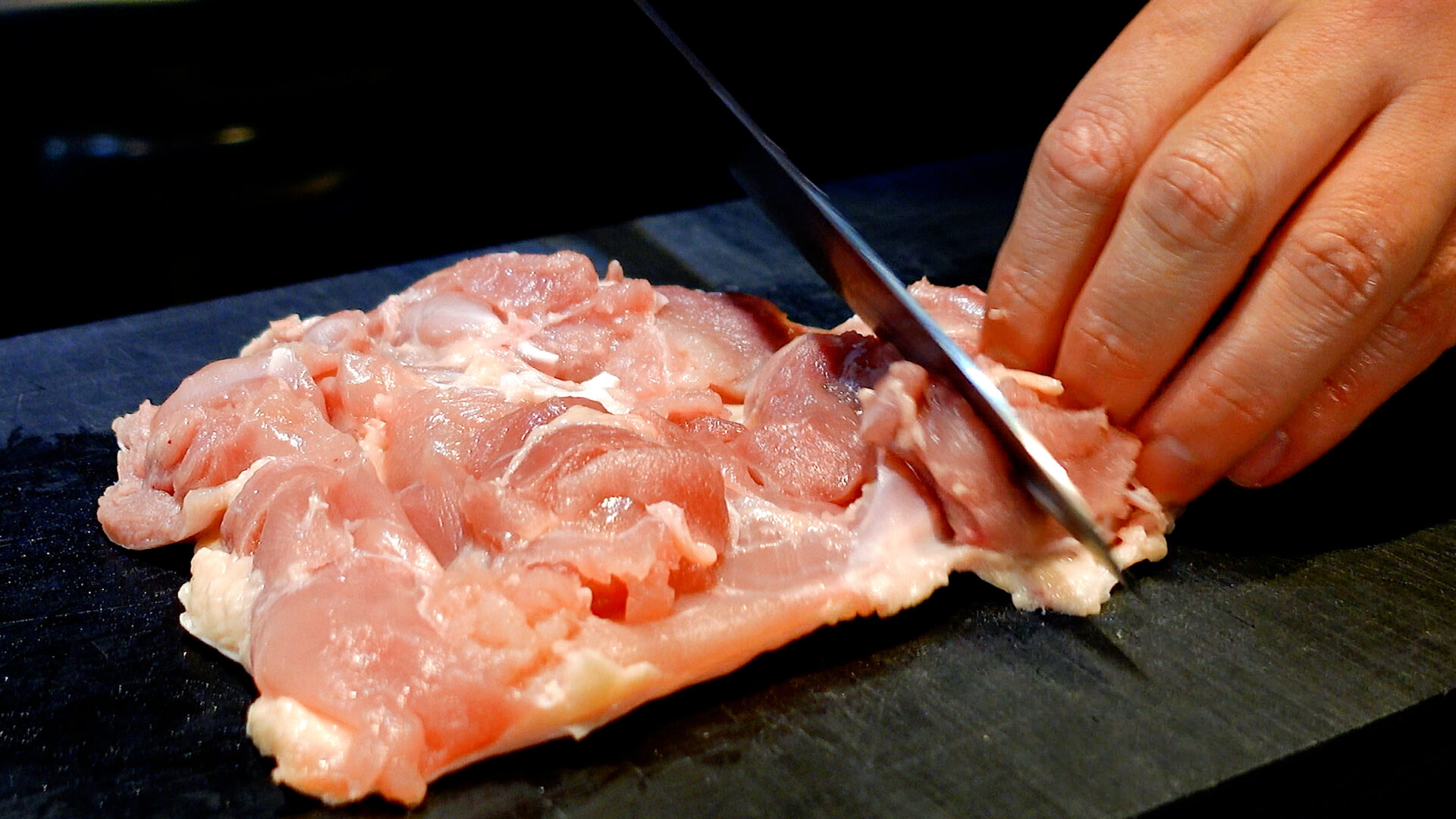 鶏もも肉は余分な皮や筋を取り除き、厚みのある部分には切り込みを入れる。包丁の先またはフォークで穴をあける。