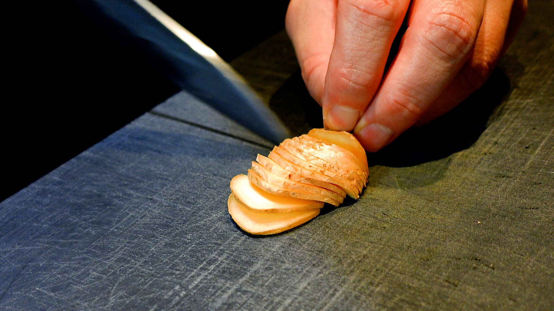 生姜は皮付きのまま薄切り、にんにくは包丁でつぶす。
