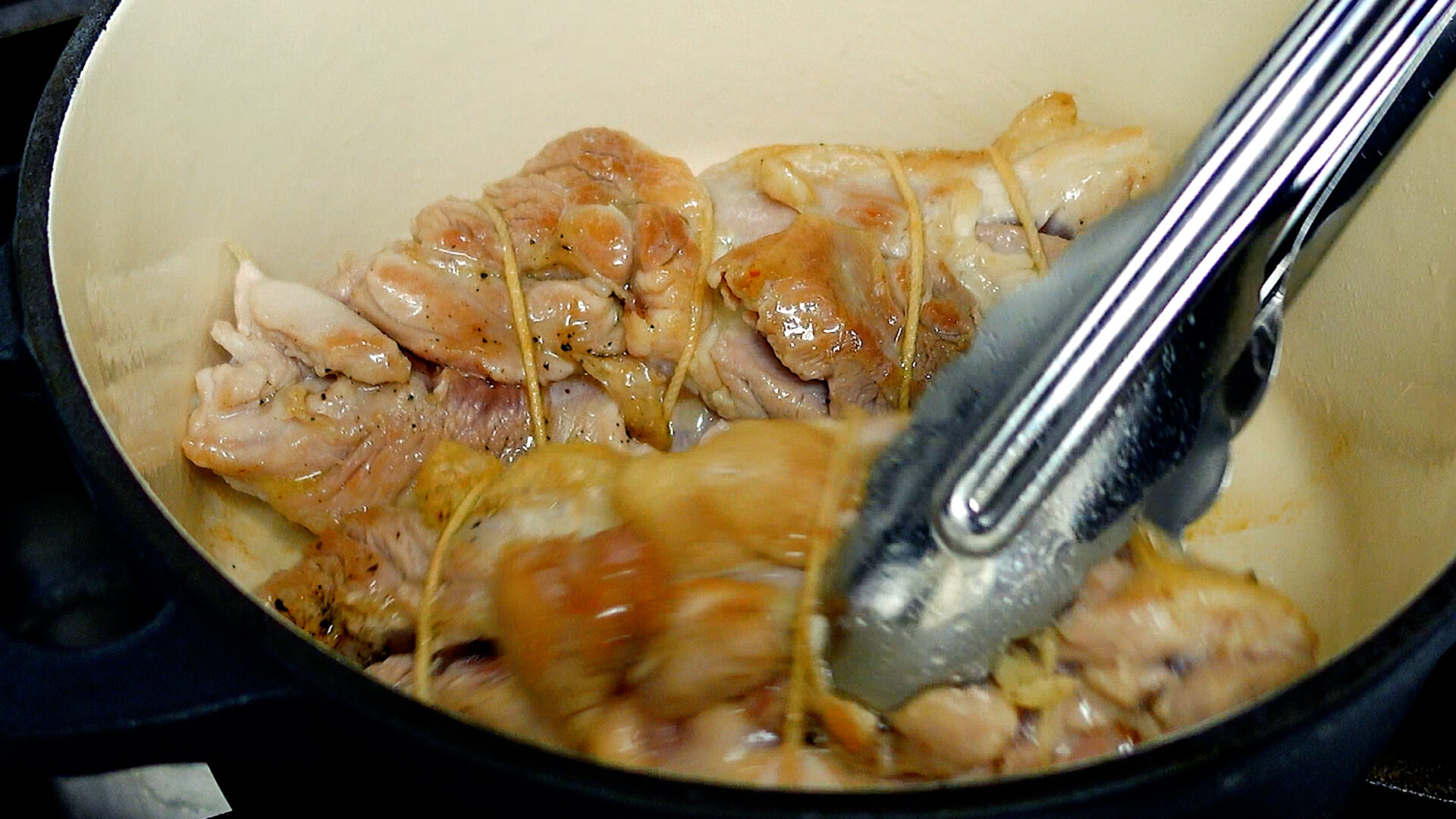 厚手の鍋にオリーブ油を入れ中火にかける。鶏肉を入れ、転がしながら全面にかるく焼き目をつける。