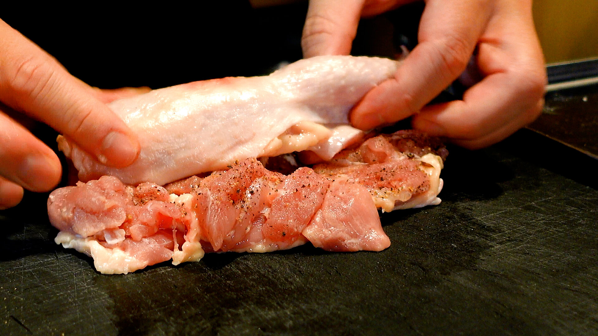 1枚につき塩 1つまみ、粗挽き黒こしょう 少々をし、皮面を下にして手前から巻く。