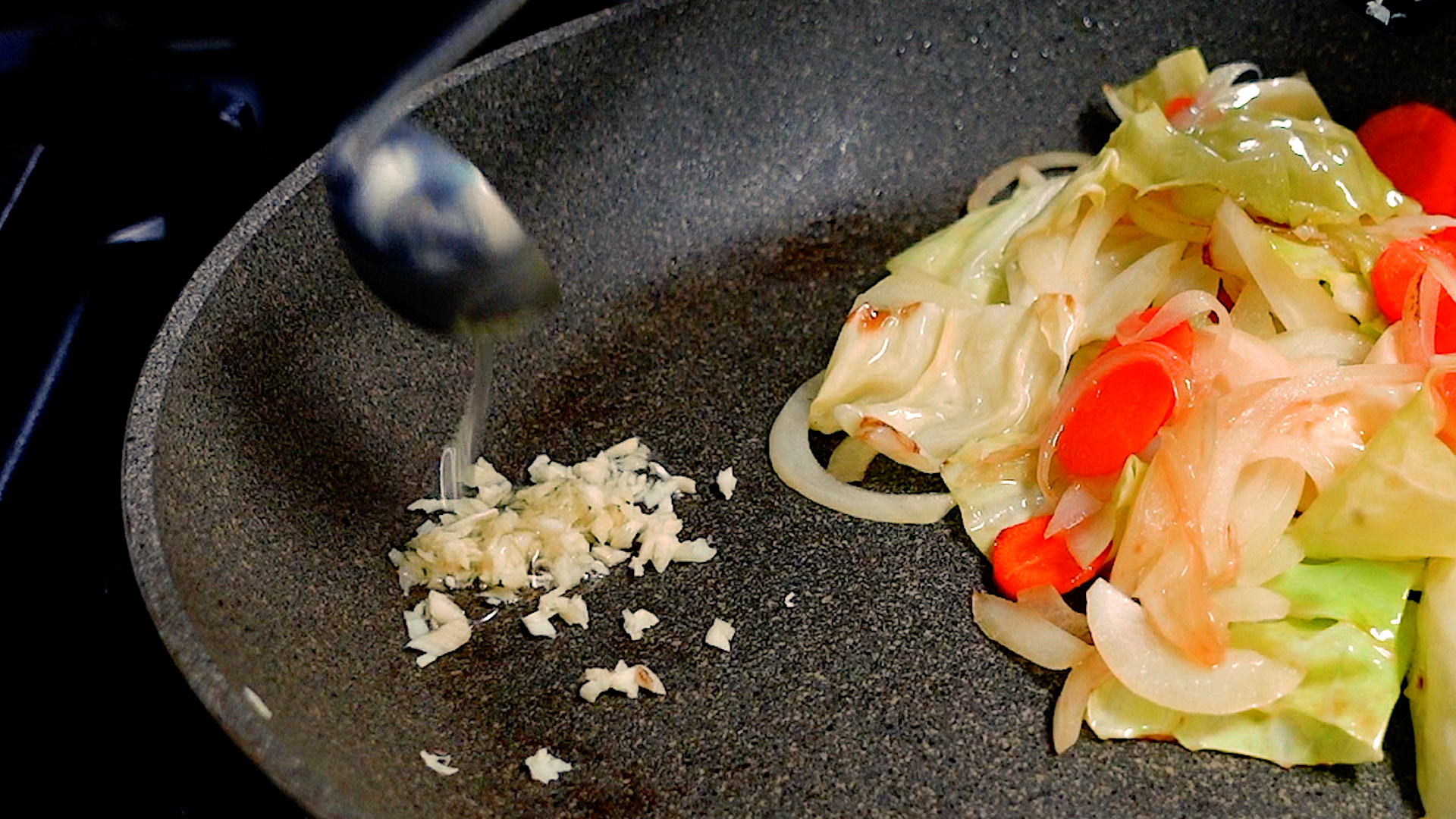 しんなりしてきたら弱火にし、フライパンにスペースをあけにんにくを加える。にんにくに少量のサラダ油(分量外)をかけ炒め、香りが出たら野菜と合わせる。