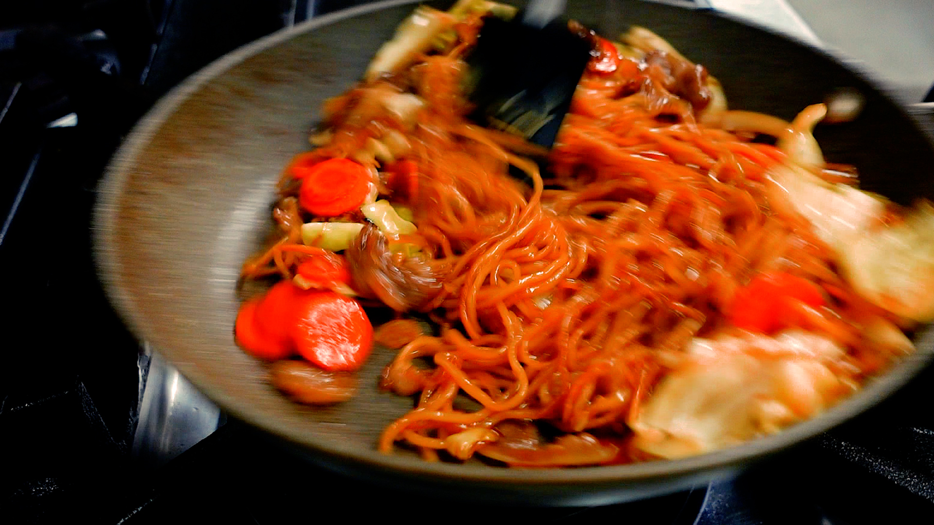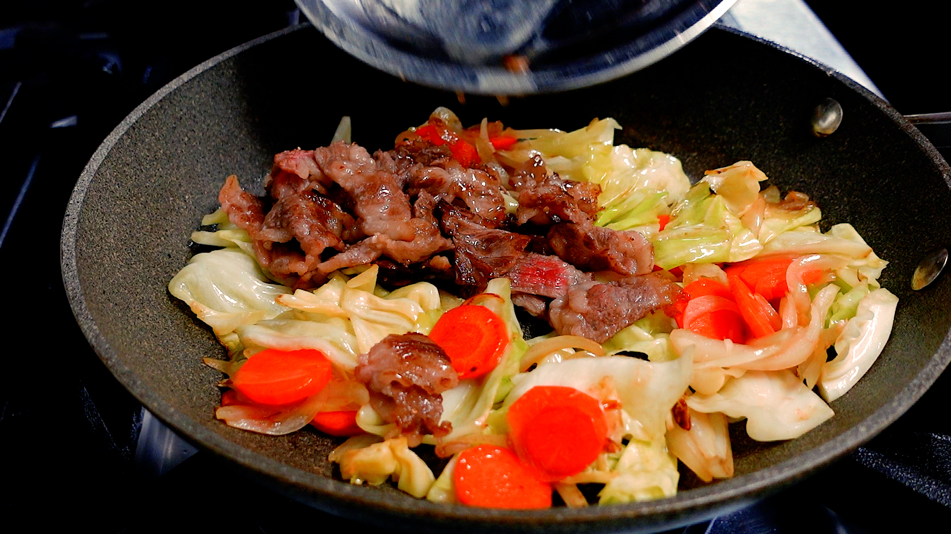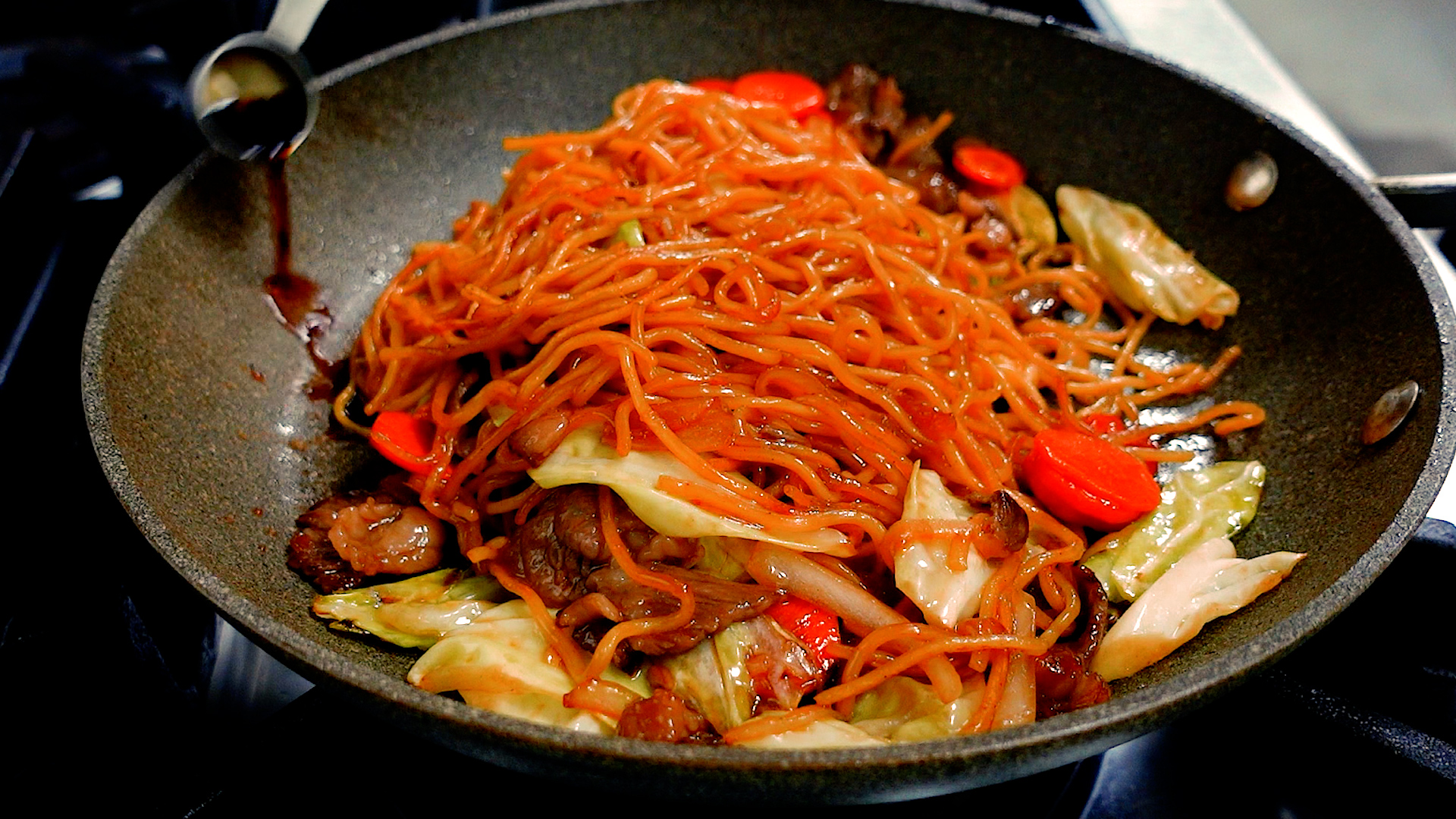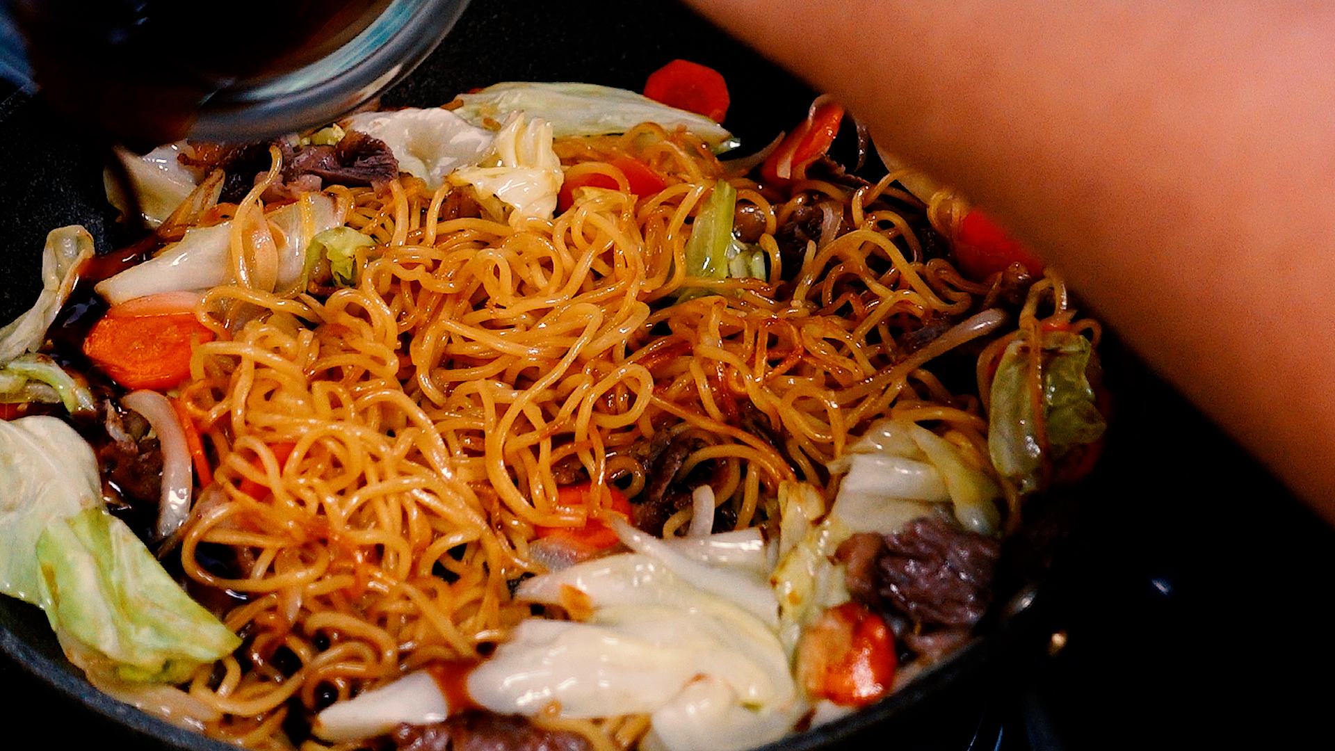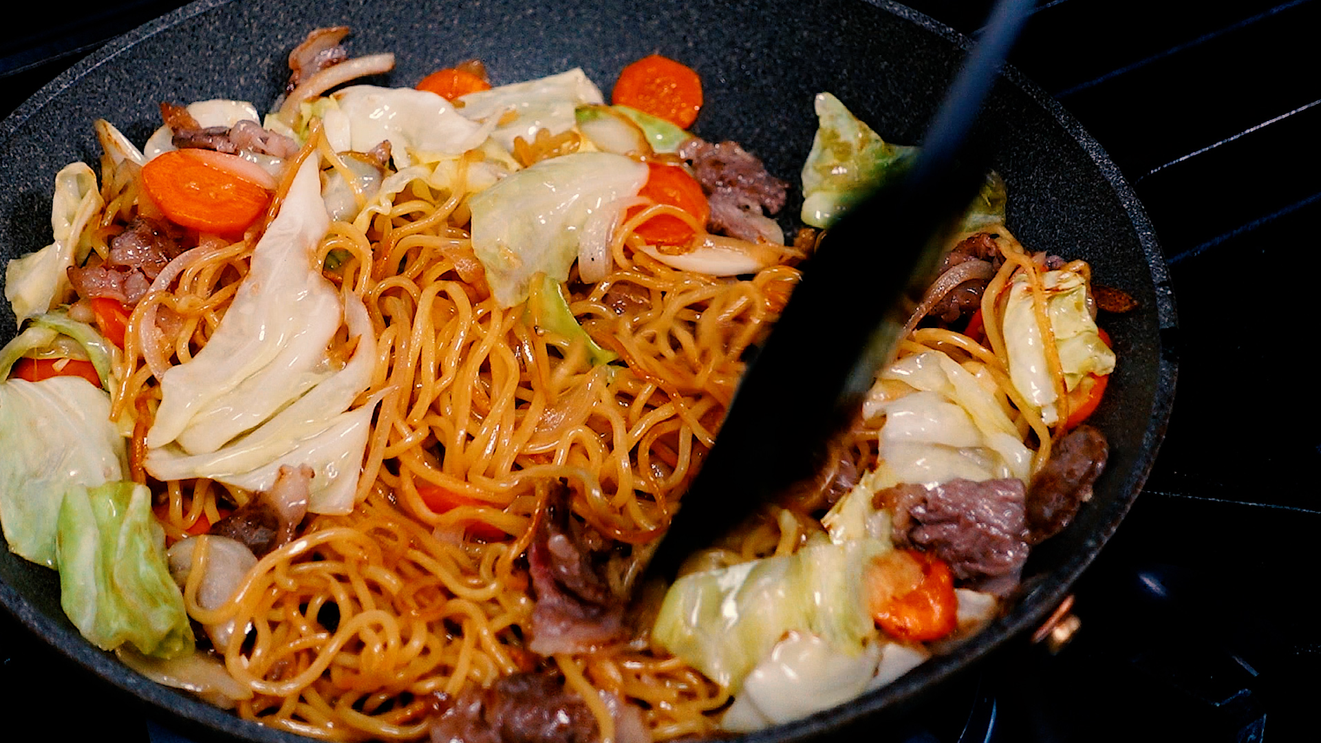 取り出しておいた牛肉と麺を加え中火にし、全体を炒め合わせる。