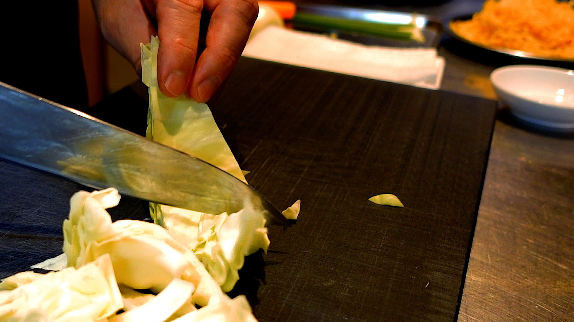 キャベツは食べやすい大きさのざく切り、玉ねぎ、にんじんは薄切り、青ネギは小口切りにする。にんにくは中の芯を取り除き、みじん切りにする。