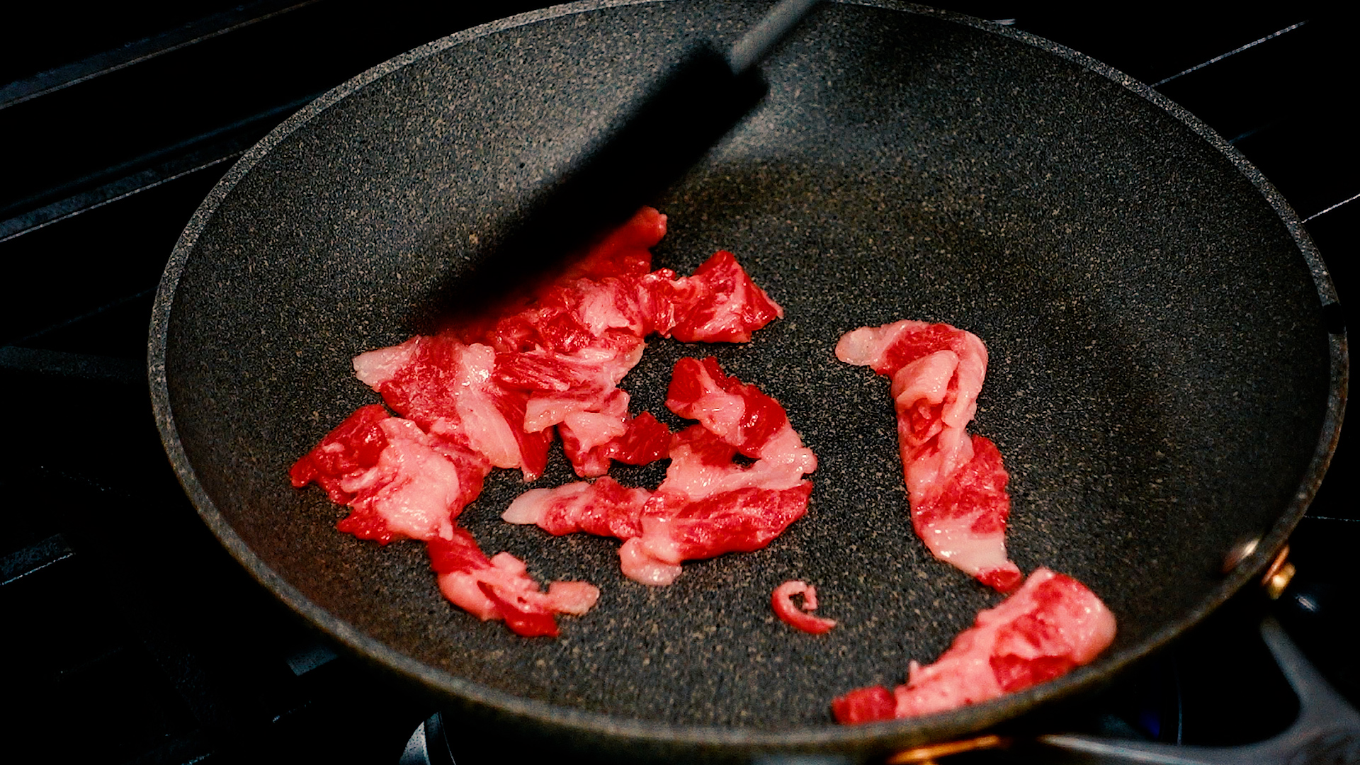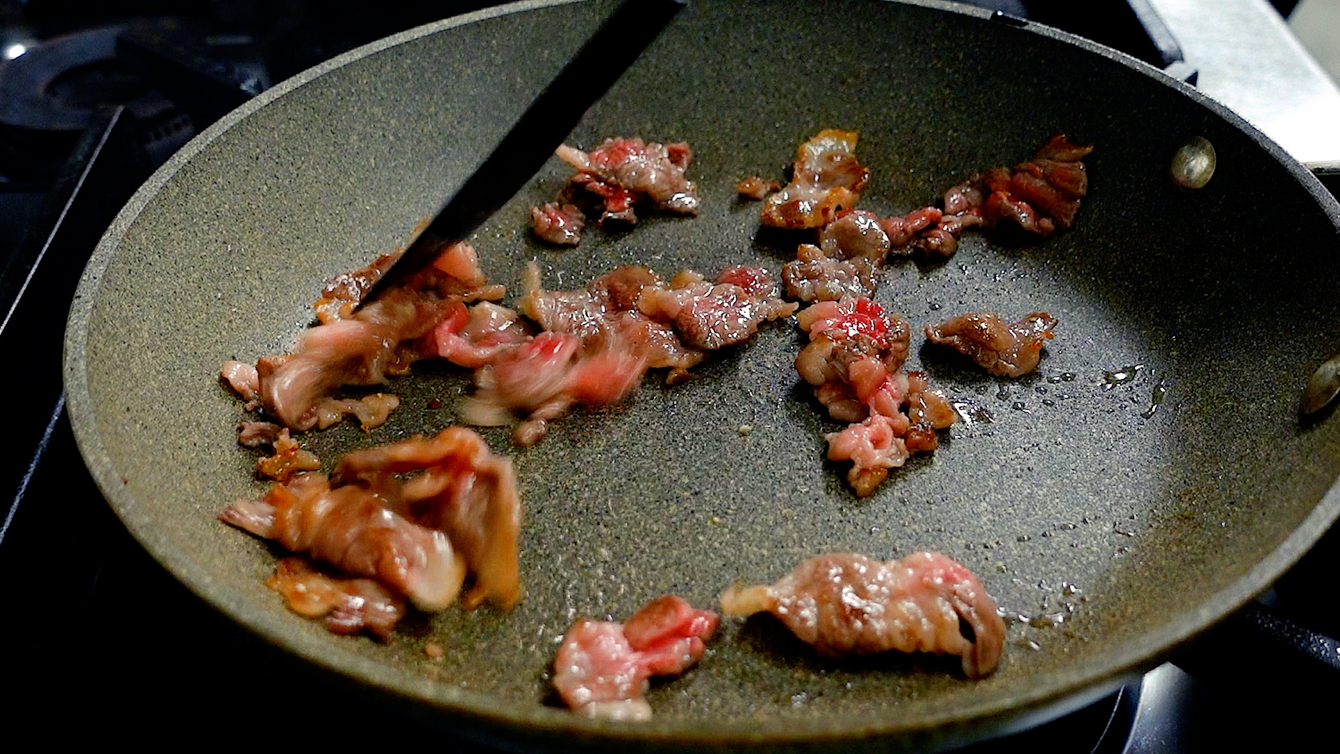 フライパンは洗わずに中火にかけ、牛こま切れ肉を8割ほど火が入るまで炒め、一旦取り出す。