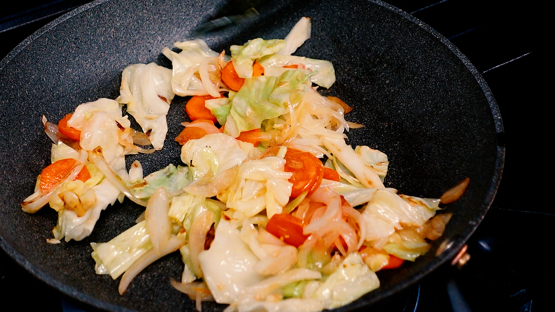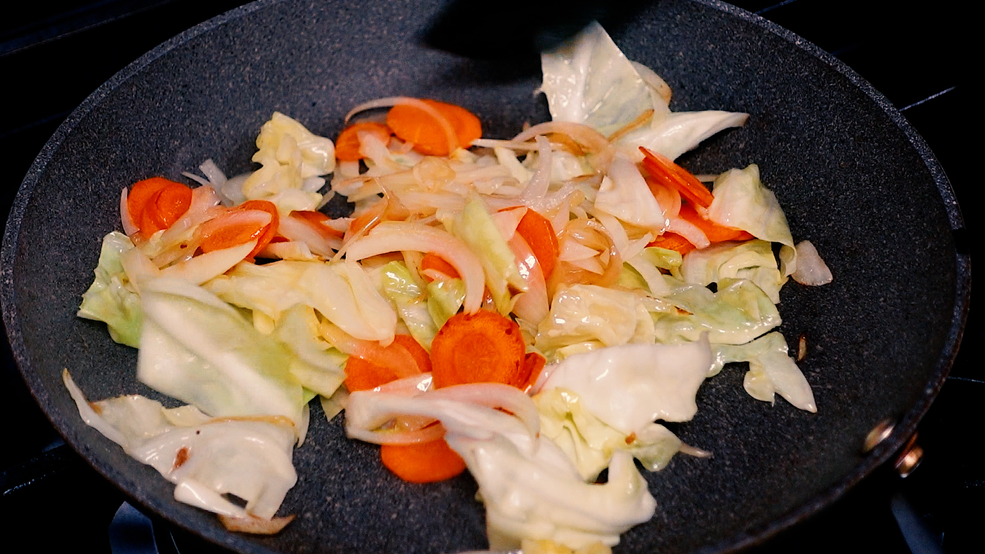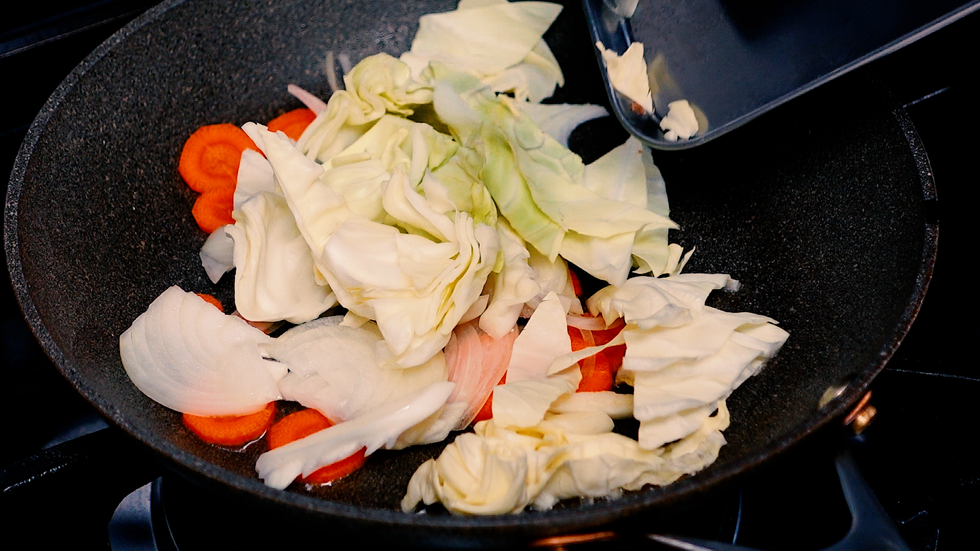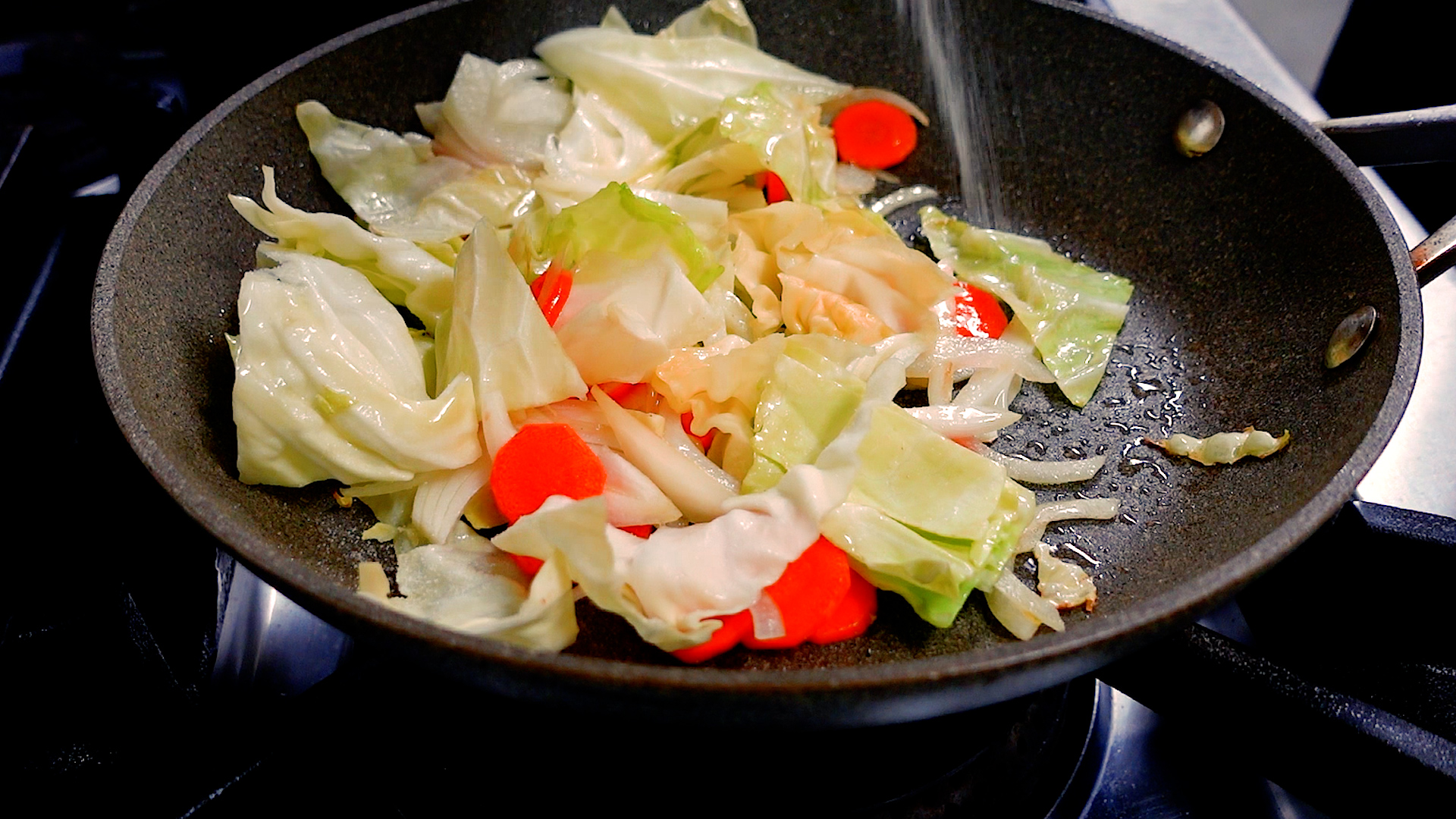 フライパンは洗わずにサラダ油 大さじ1をひき、中火~強火でキャベツ、玉ねぎ、にんじんを炒める。ある程度炒めたら塩 1つまみ、こしょう 少々をする。