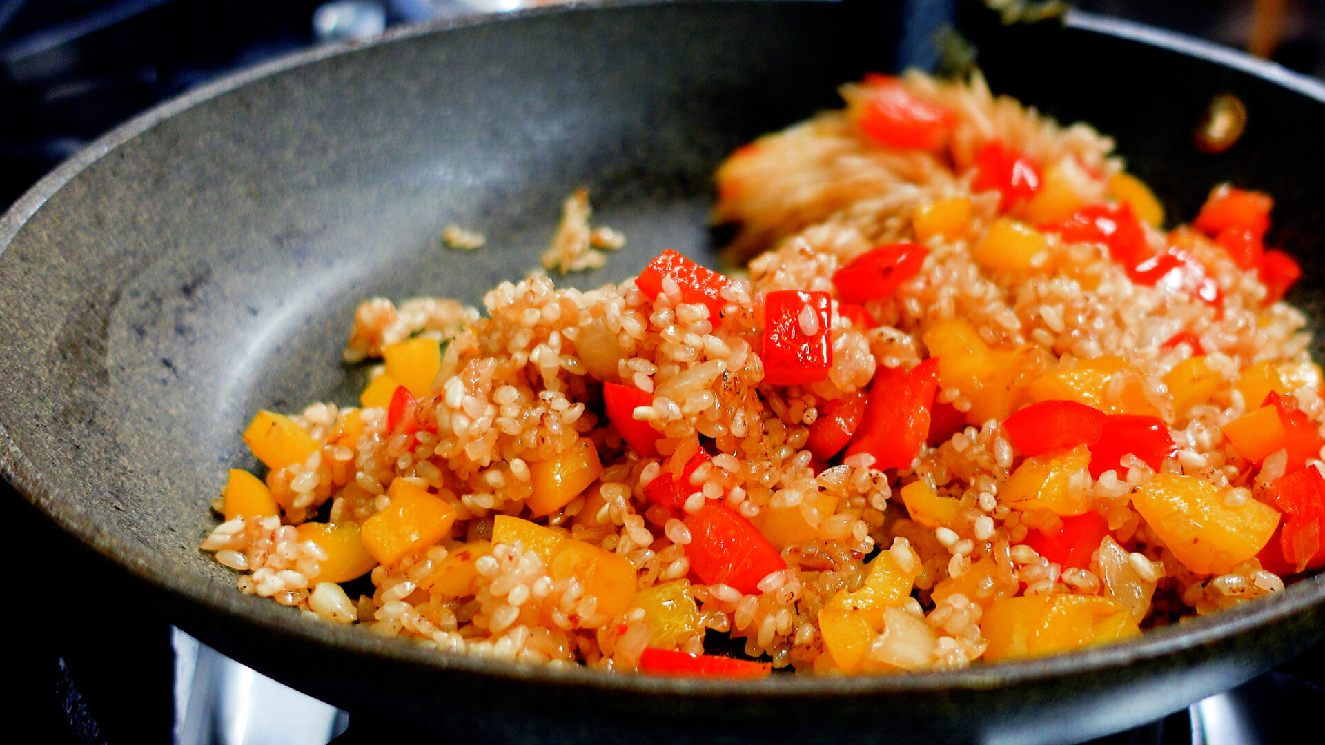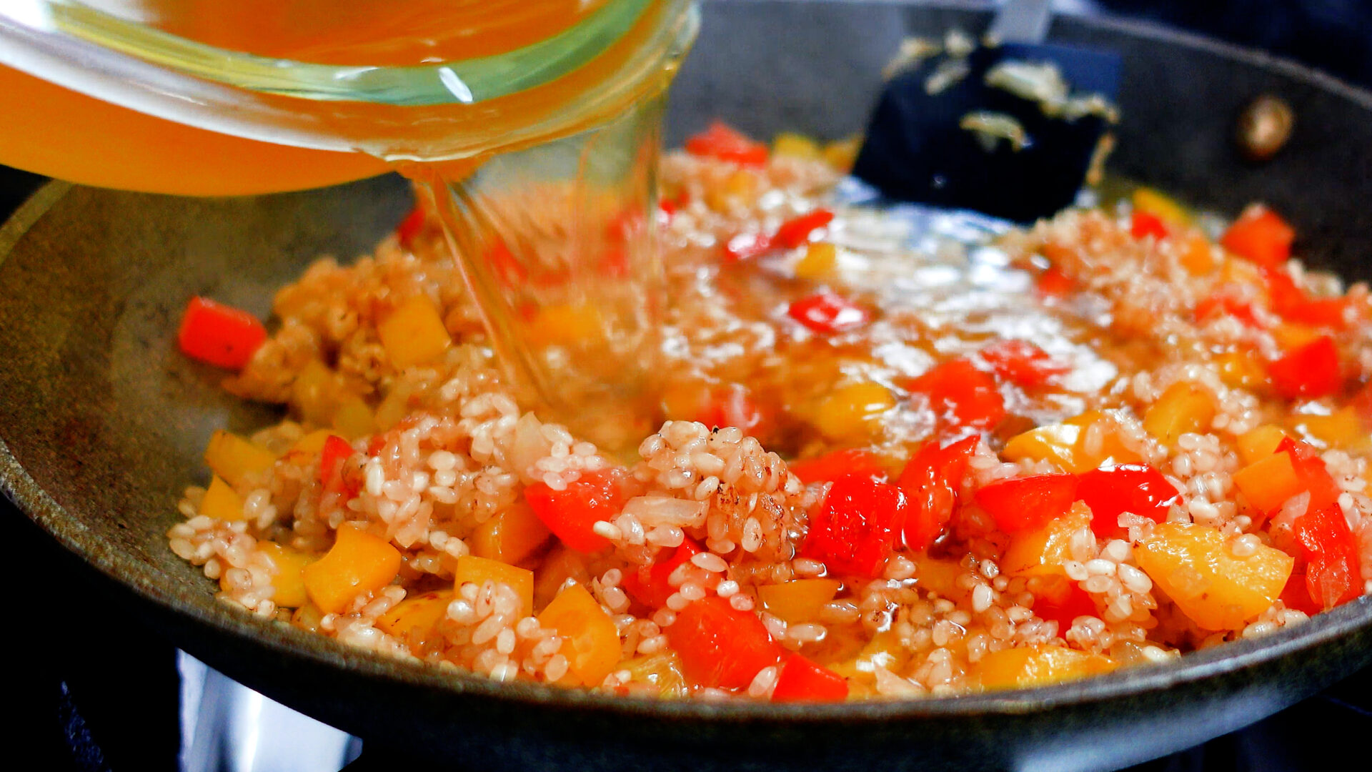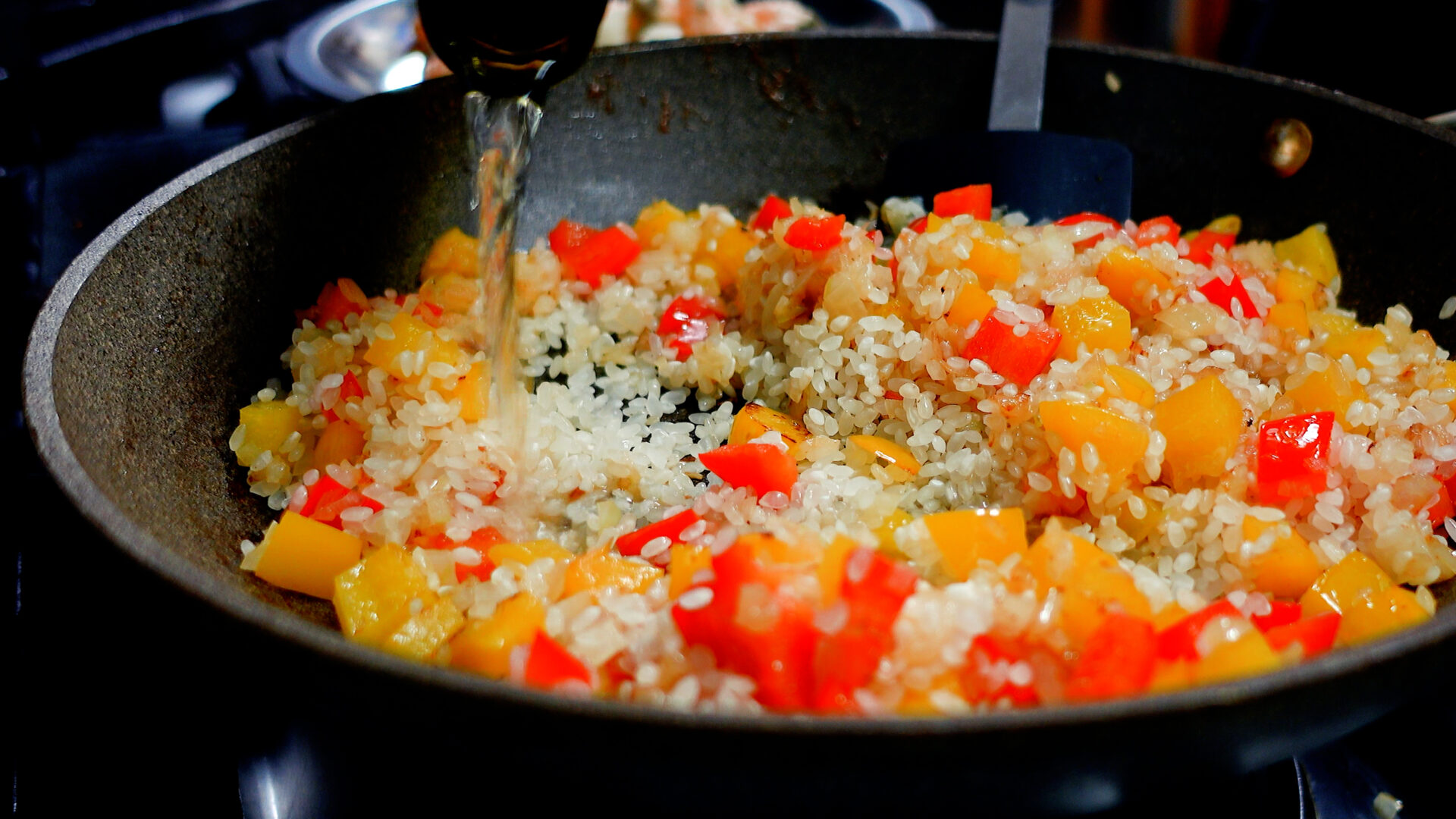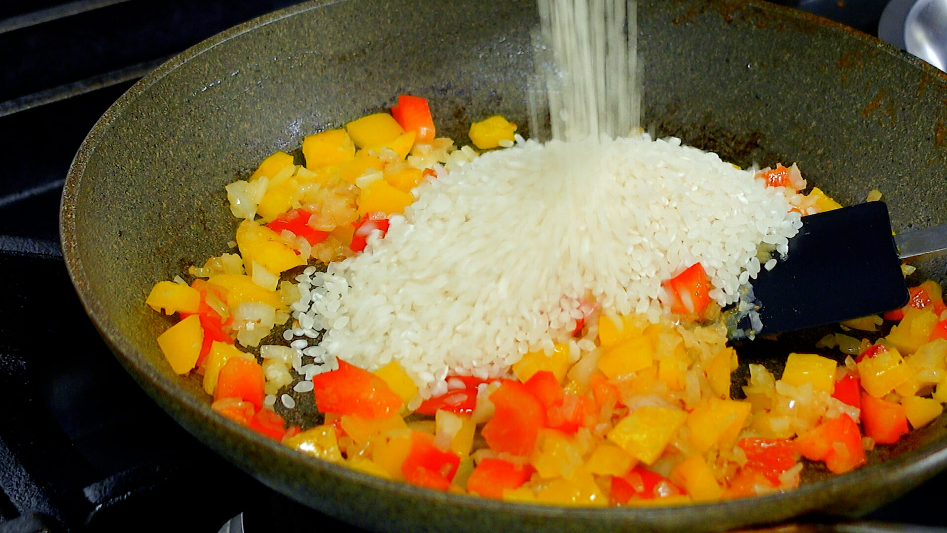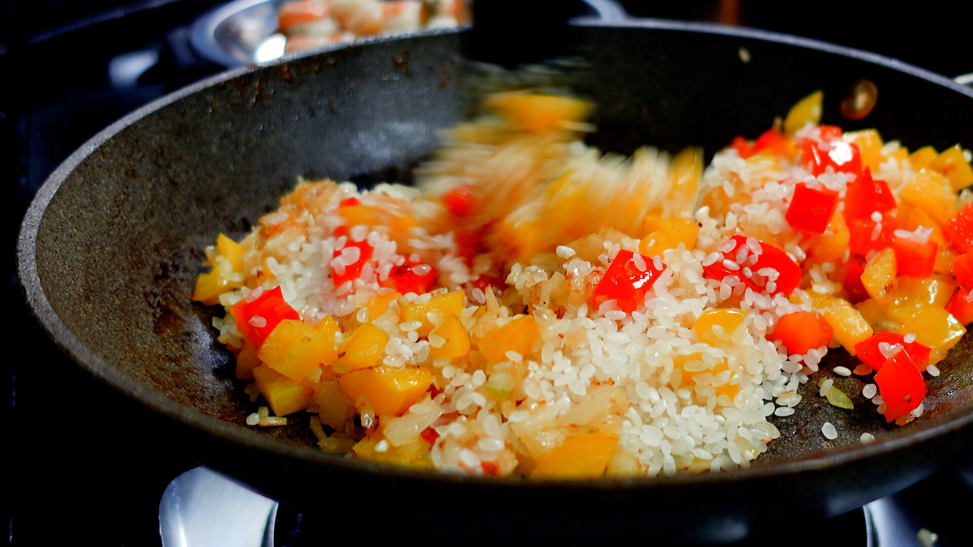 玉ねぎがしんなりしてきたら米を加え、米に油がまわるように炒める。