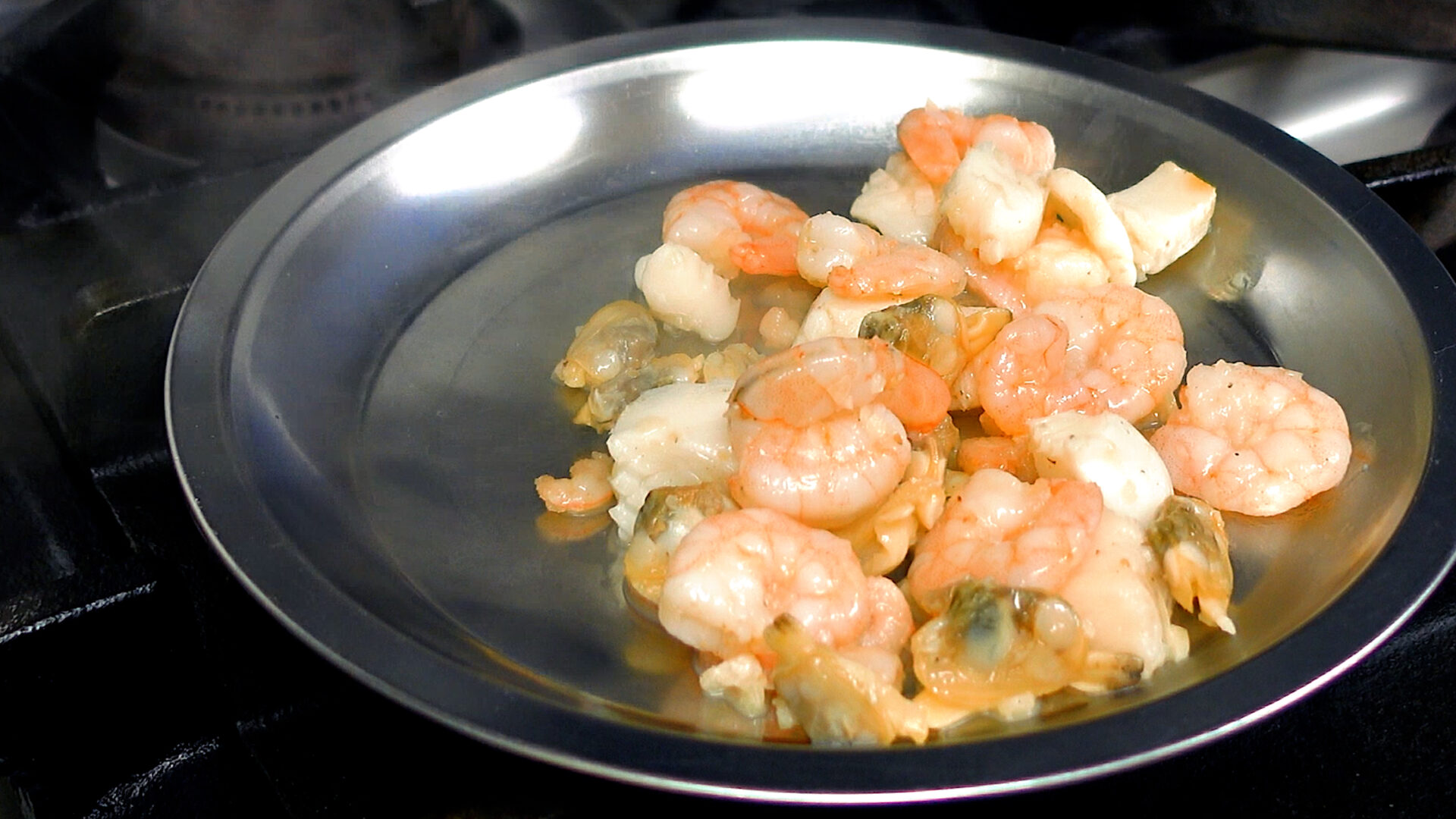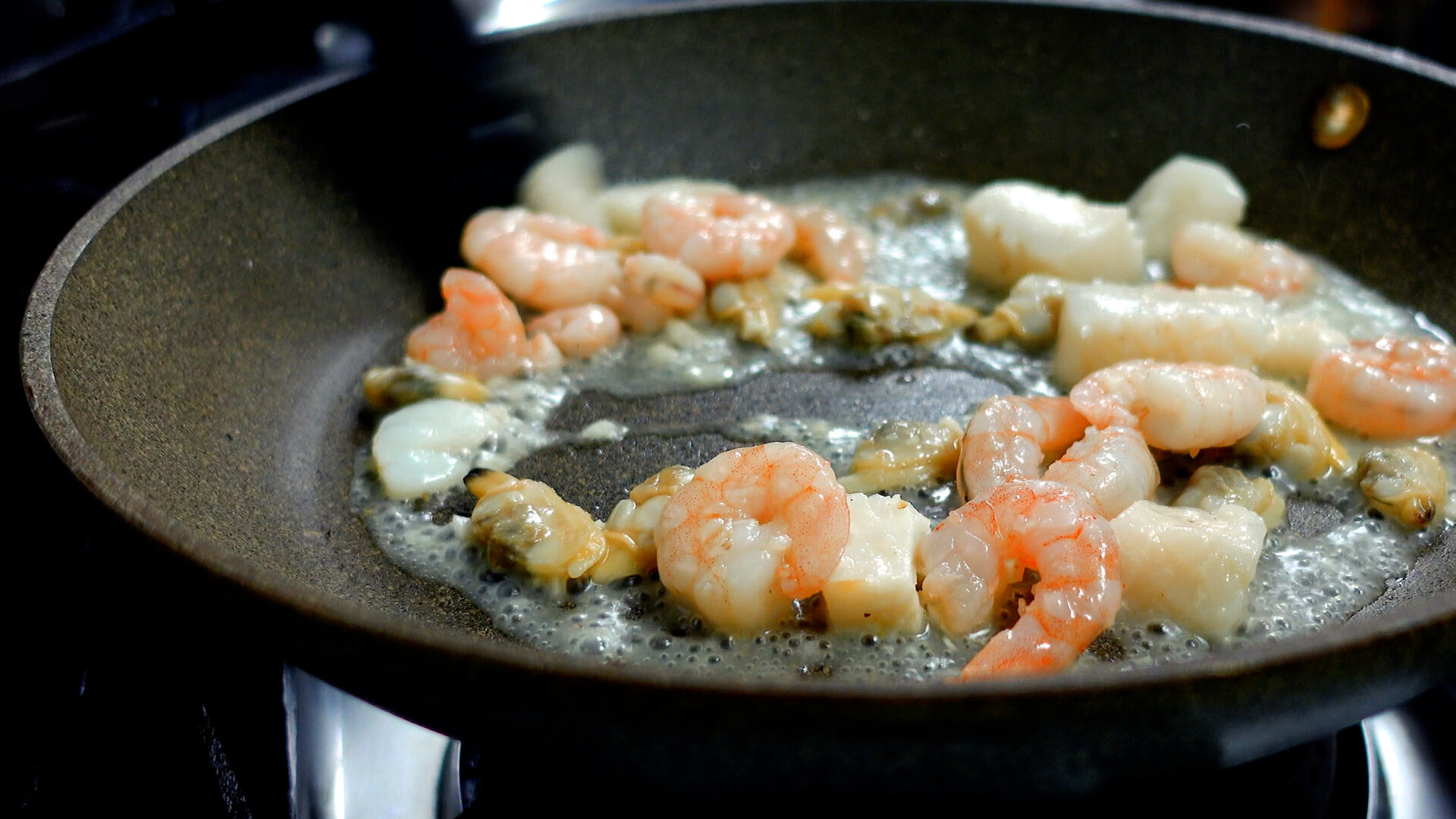 フライパンを中火にかけ、漬け込んでおいたシーフードミックスを加え炒める。7~8割ほど火が入ったら取り出す。