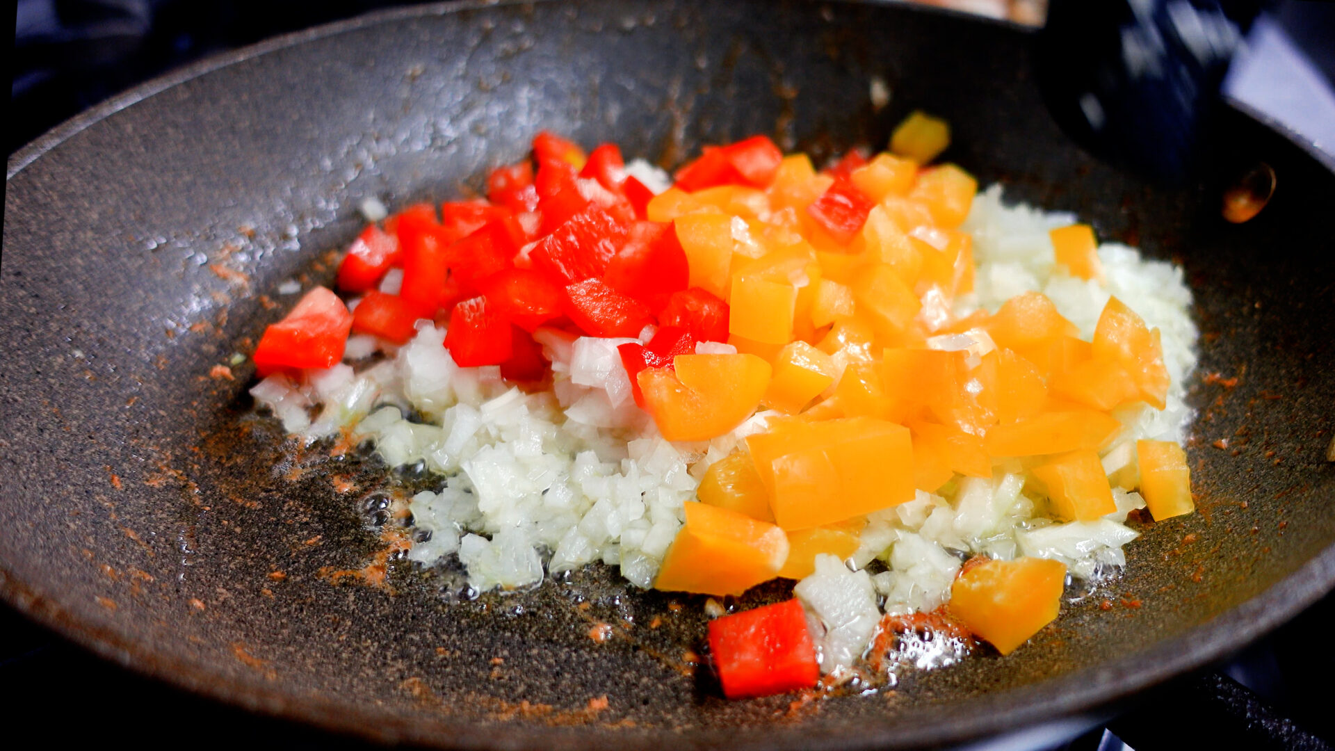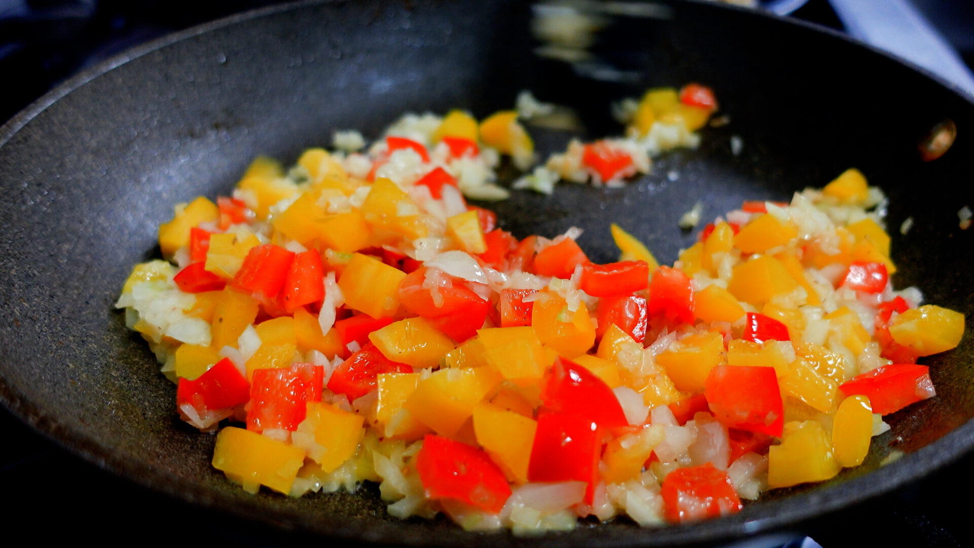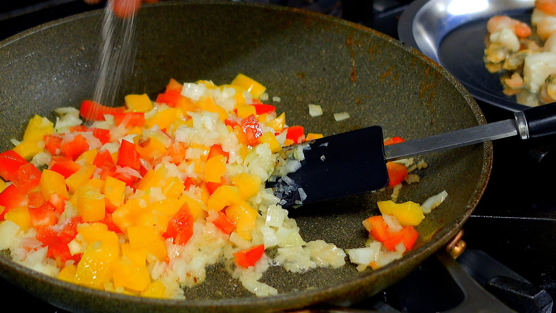 フライパンは洗わずにオリーブ油 大さじ1、バターを加え中火にかける。バターが溶けてきたら玉ねぎ、パプリカを加え炒める。油がまわったら塩 1つまみ、こしょう 少々をしさらに炒める。