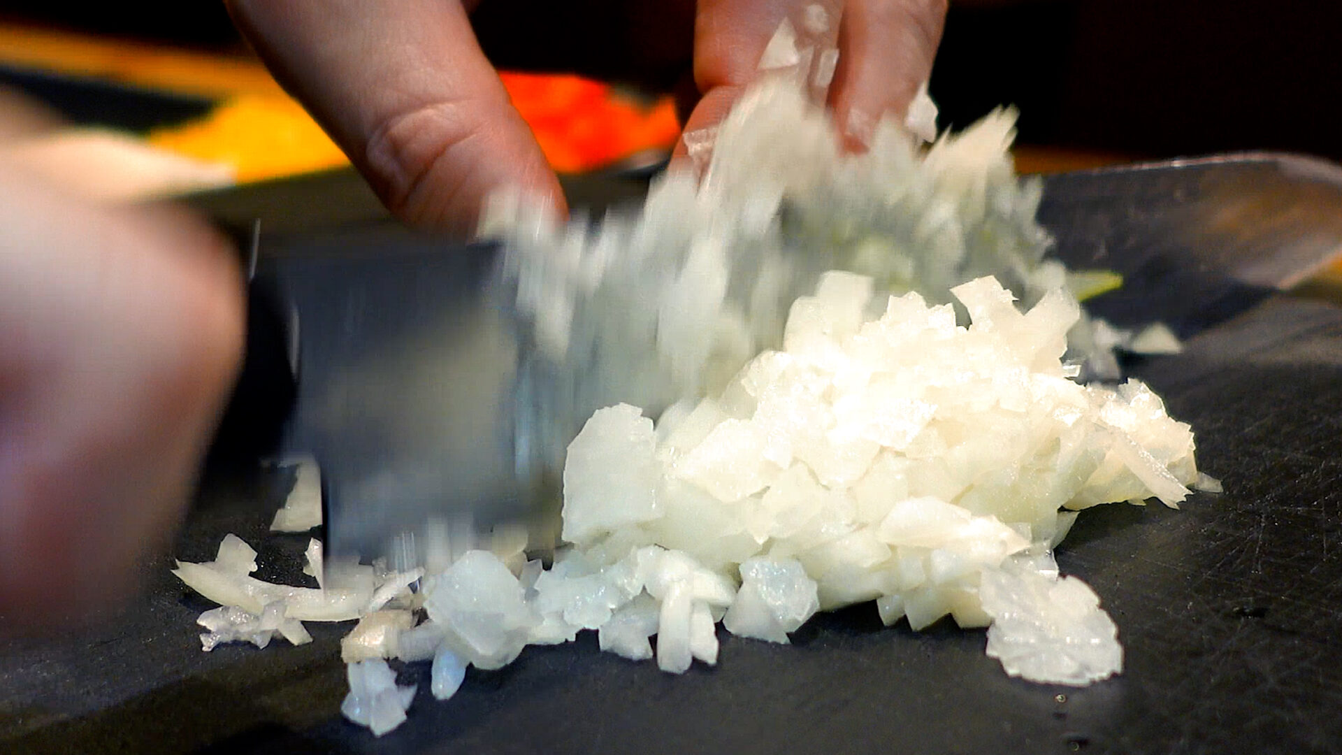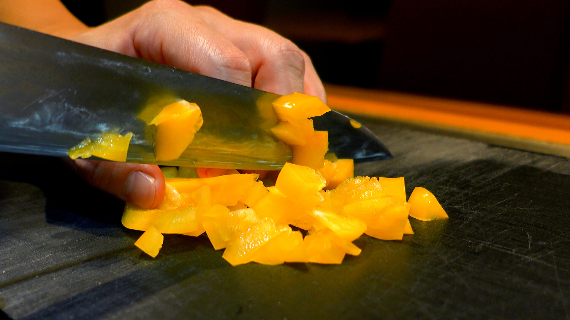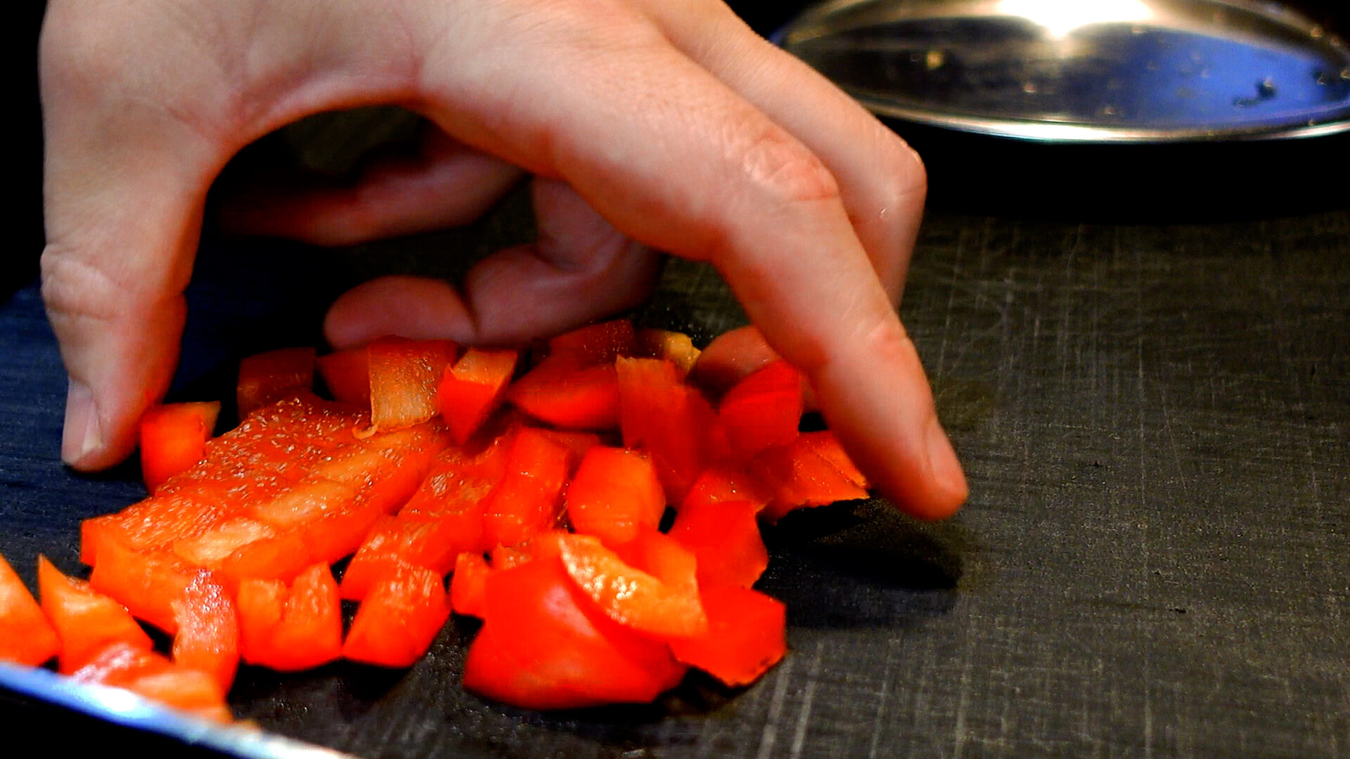 パプリカ赤・黄色はそれぞれ1cmの角切り、玉ねぎは粗みじん切り、パセリはみじん切りにする。