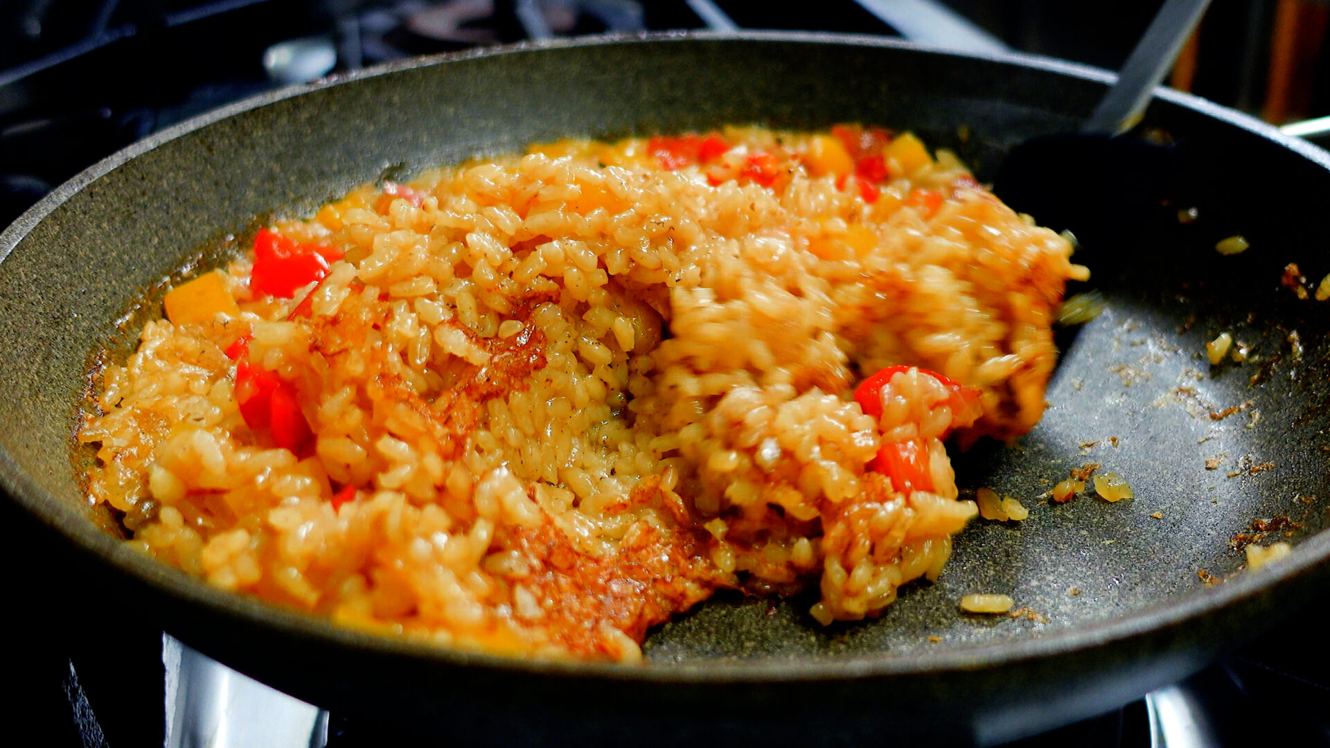 水分がなくなり、いい感じのおこげがついていたらヘラではがしながら炒め合わせる。