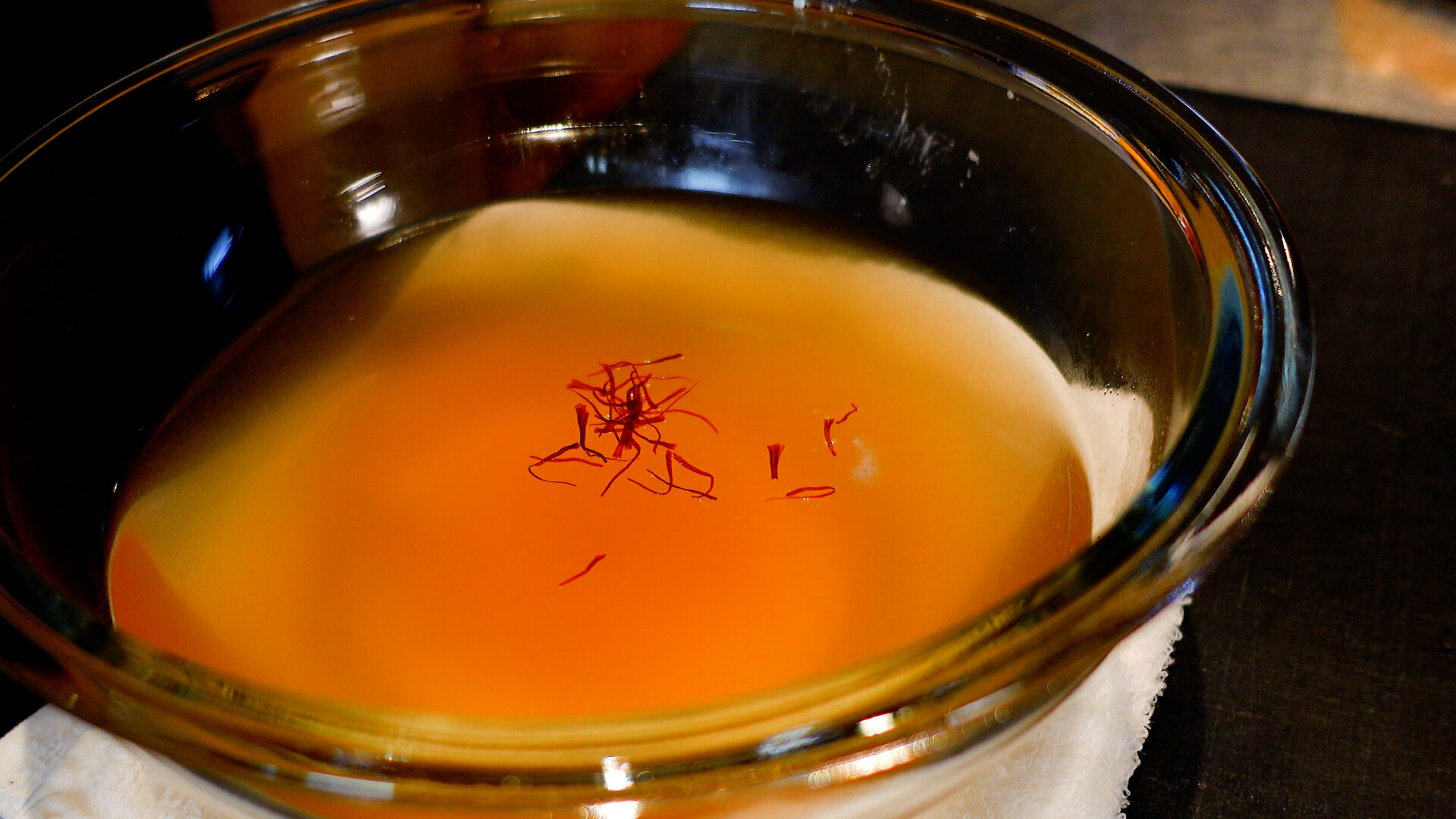 鍋に水と顆粒コンソメを加えひと煮立ちさせ、コンソメスープをつくり、サフランを加える。