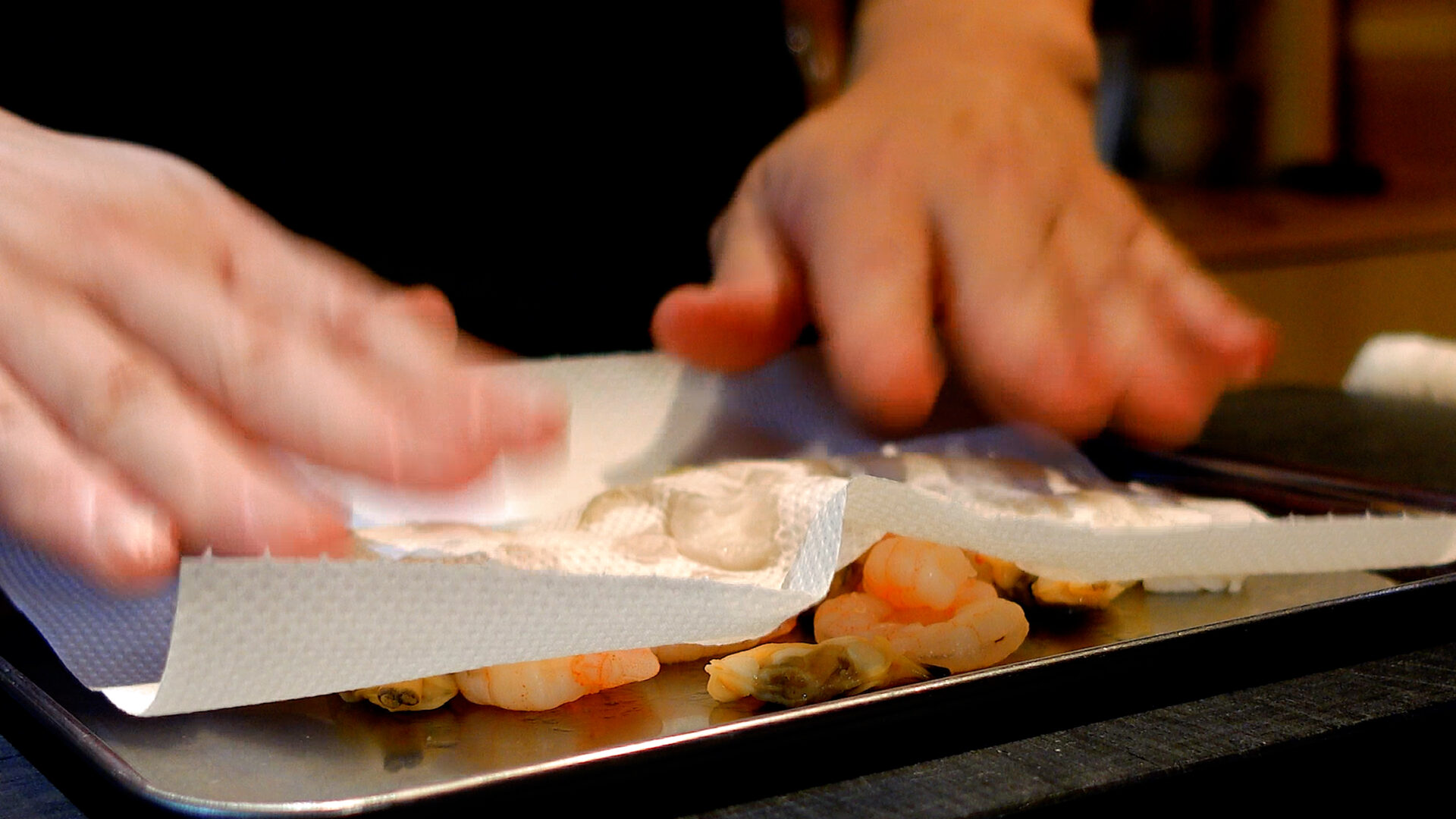 冷凍シーフードミックスは解凍し、水分をふきとる。