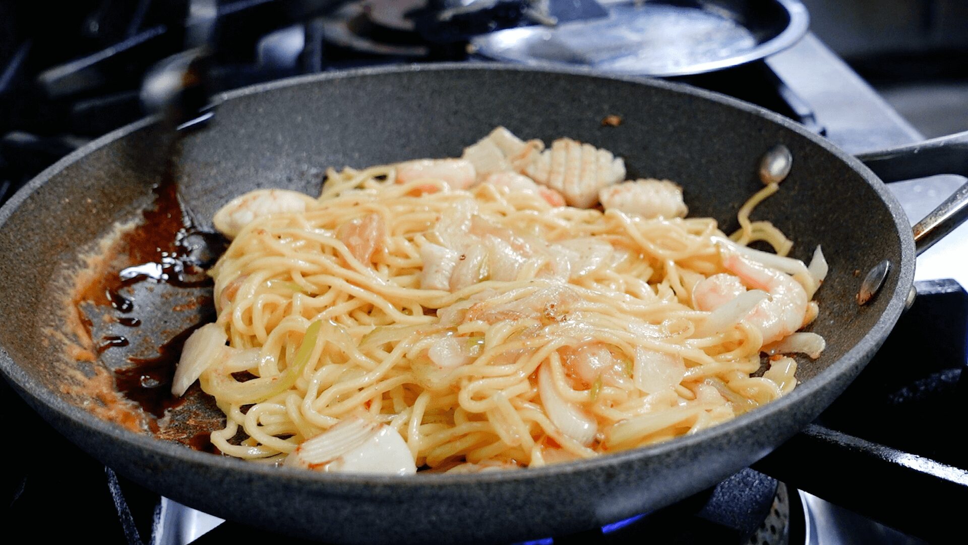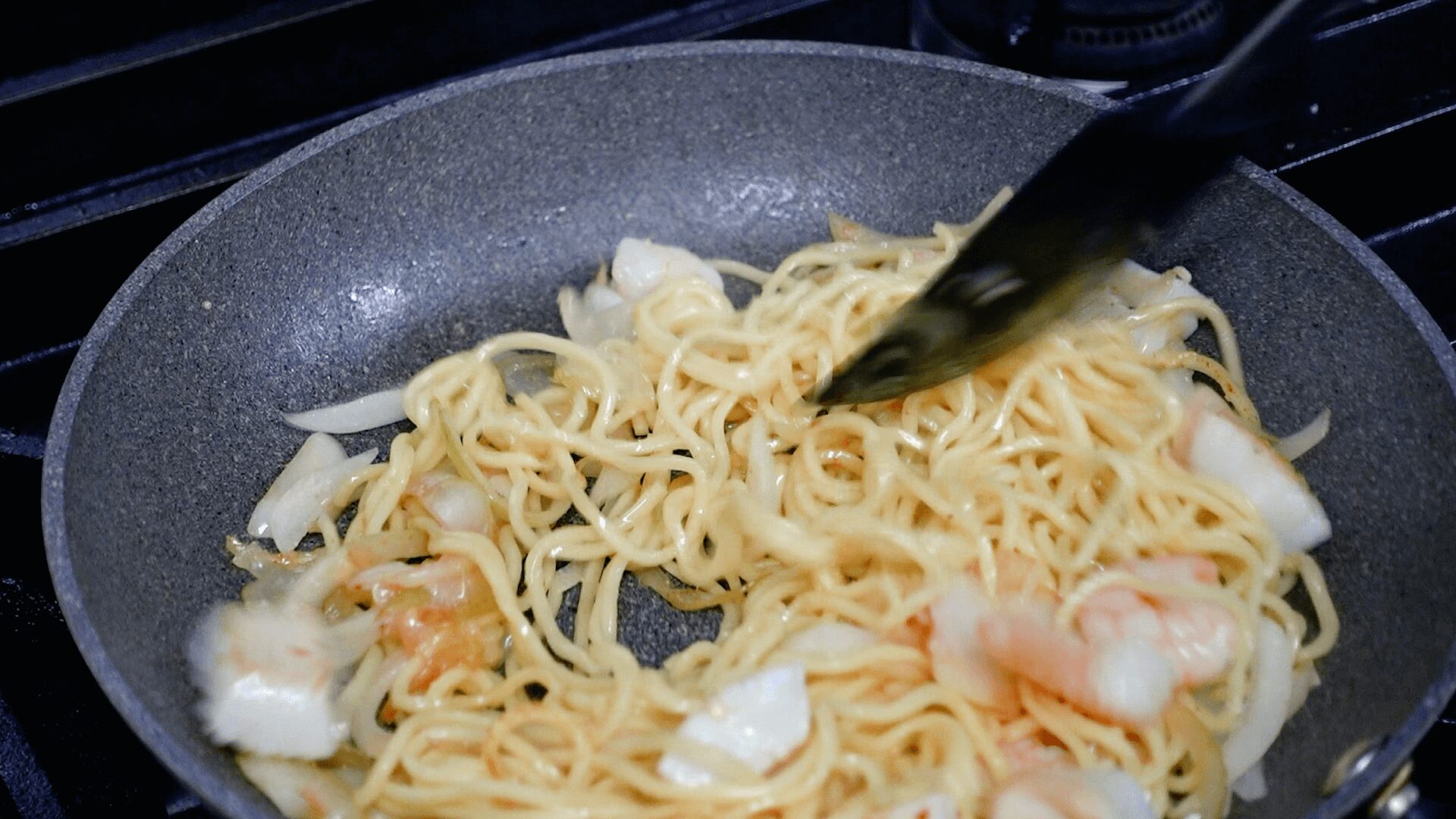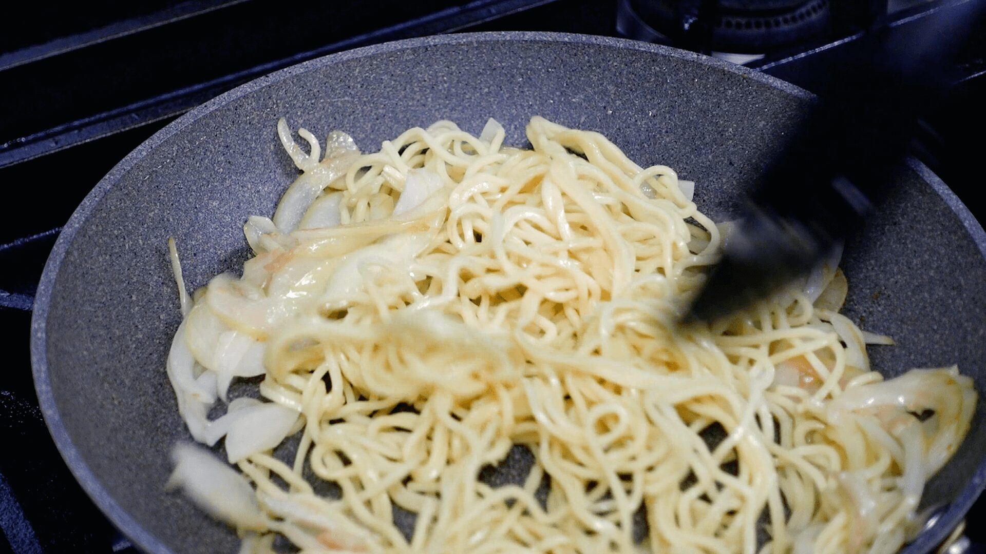 焼きそば麺を加え、さっと全体を炒め合わせる。