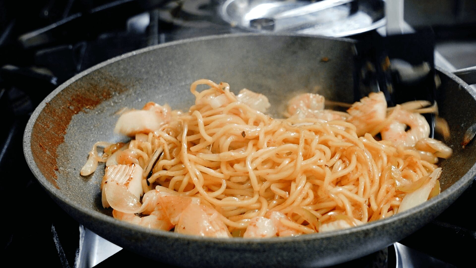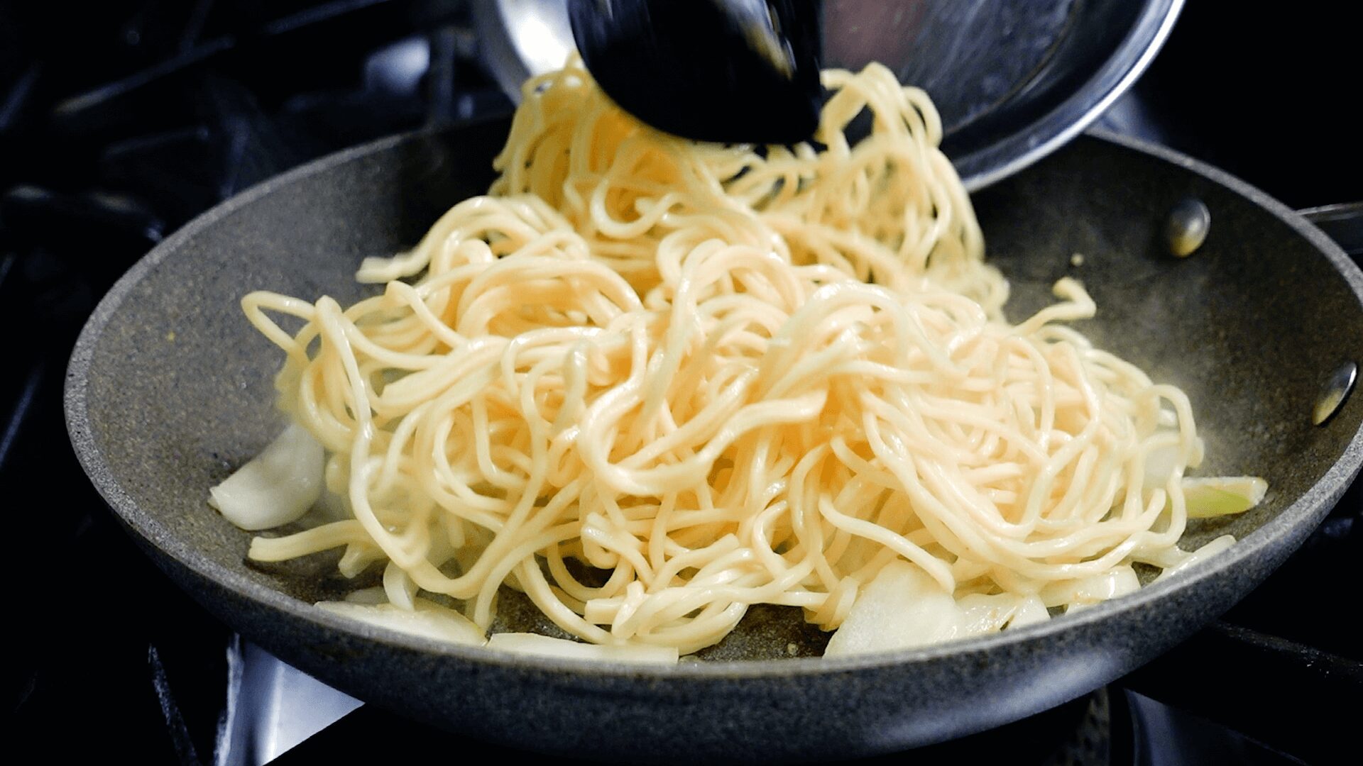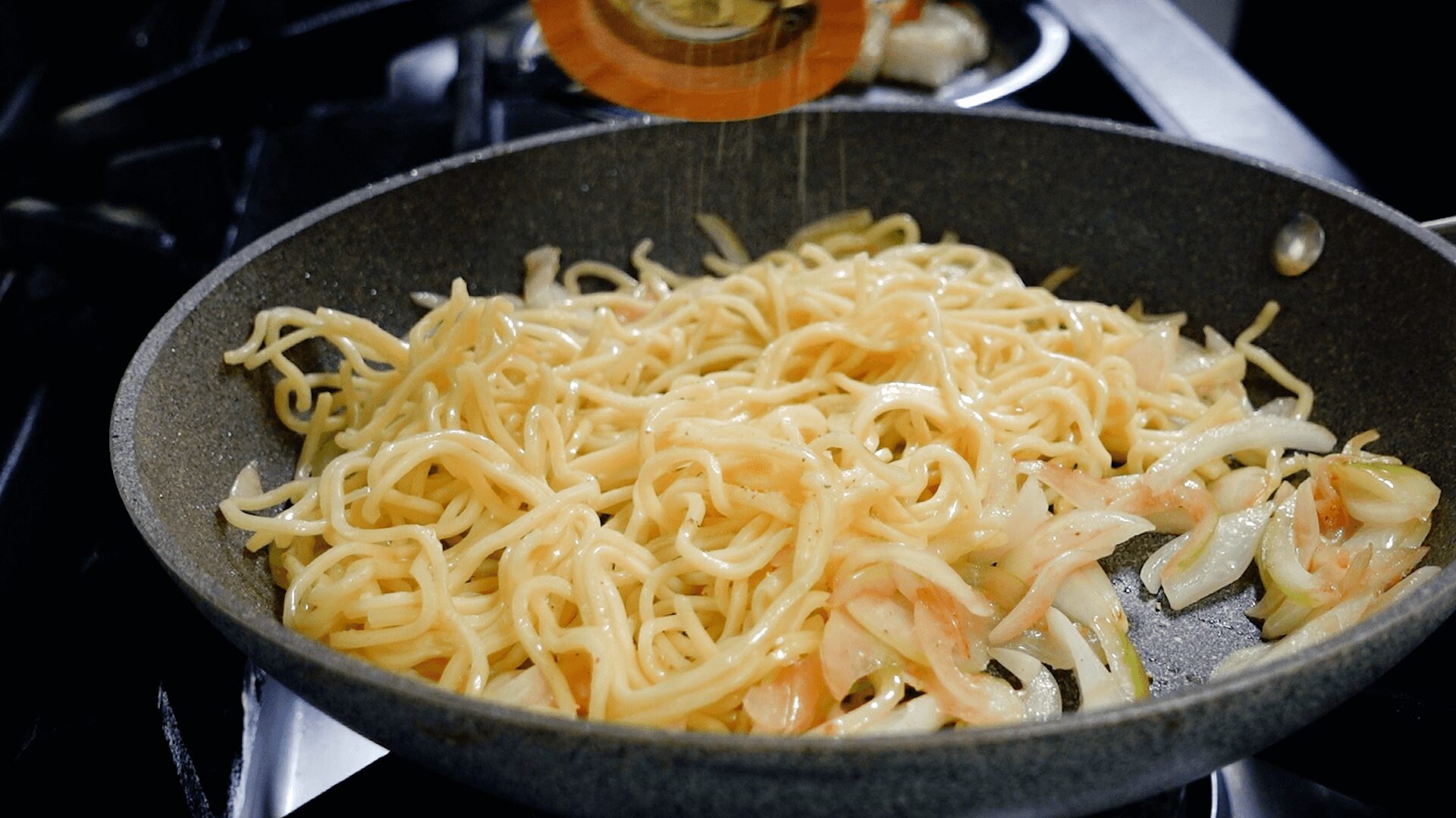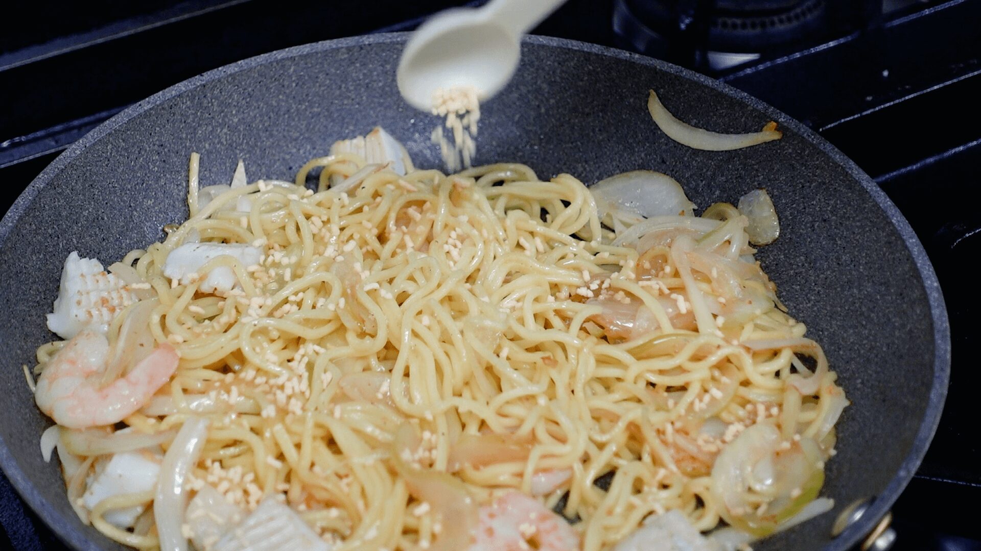 焼きそば麺を加え、さっと全体を炒め合わせる。