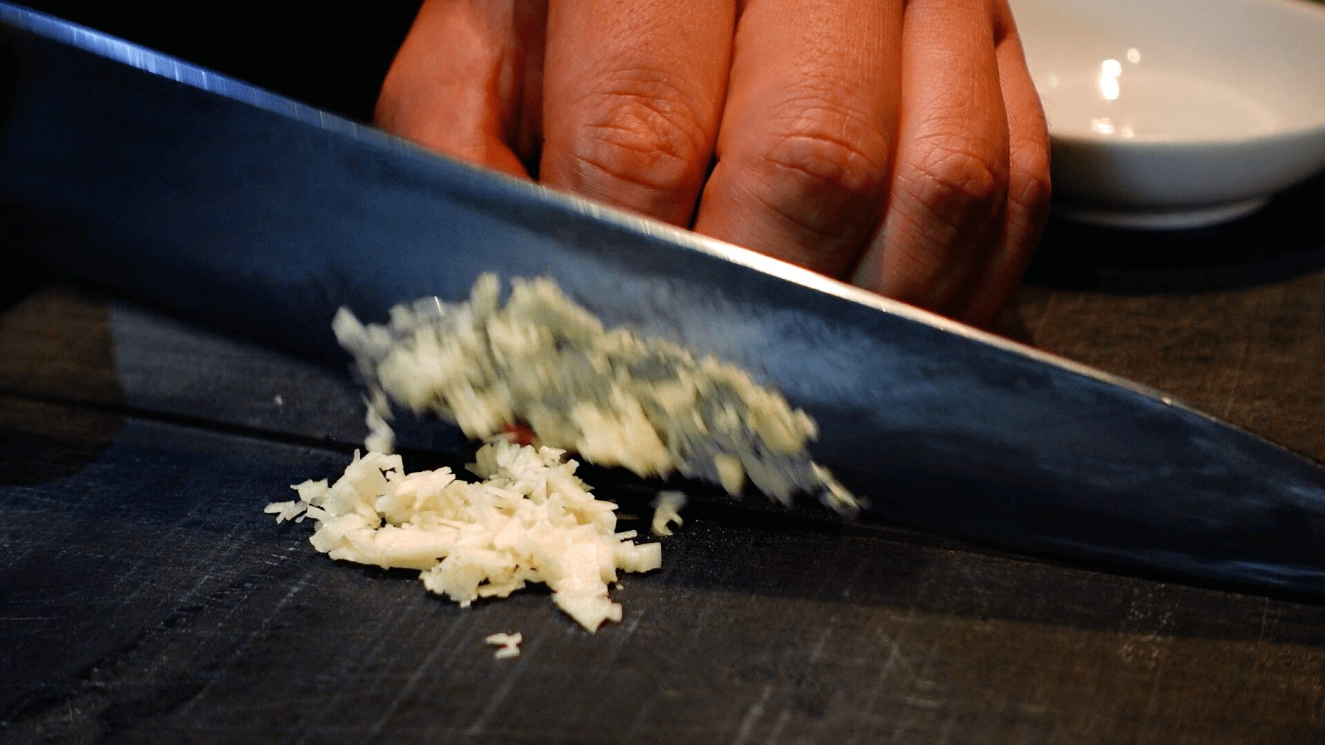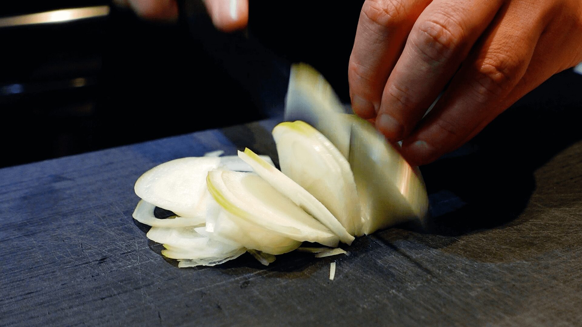 玉ねぎは薄切り、にんにくはみじん切りにする。