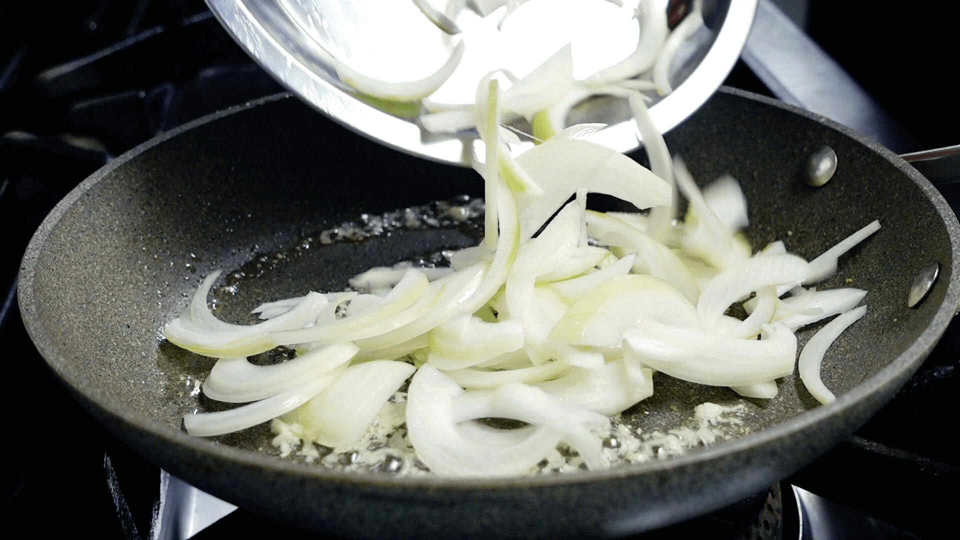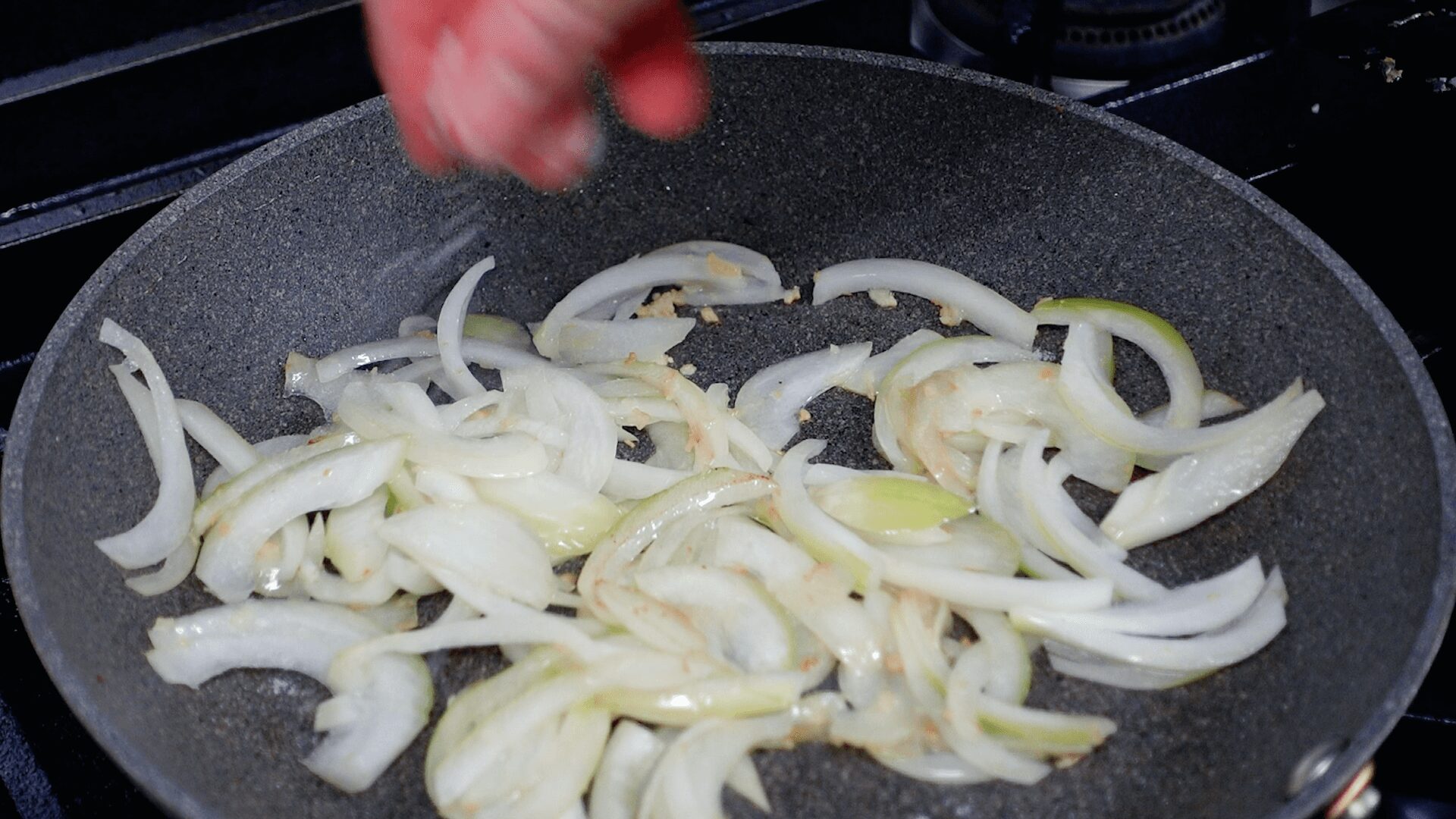 玉ねぎをしっかり炒め甘みを引き出し、最後は醤油を回しかけ香ばしく仕上げます。