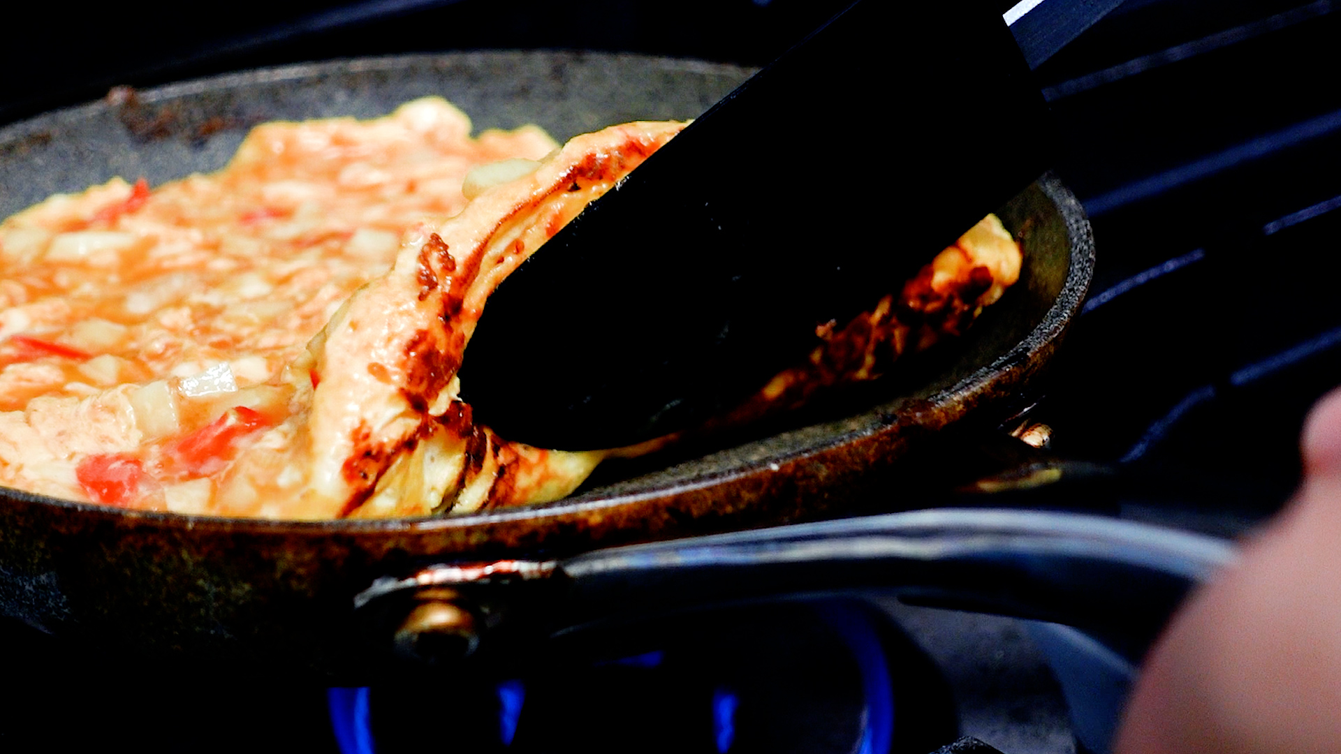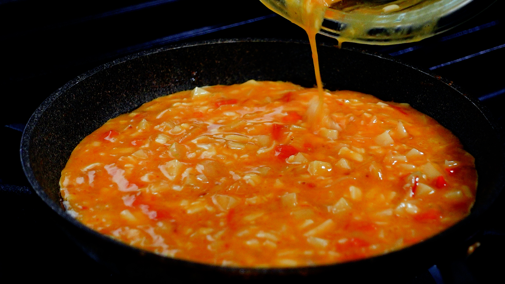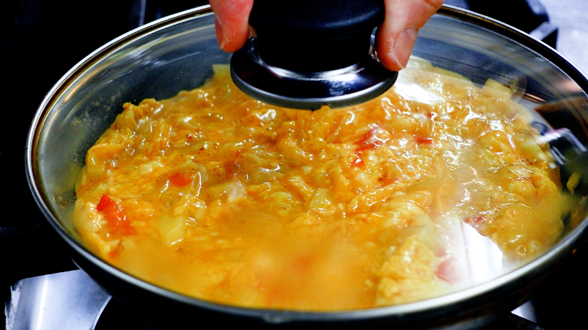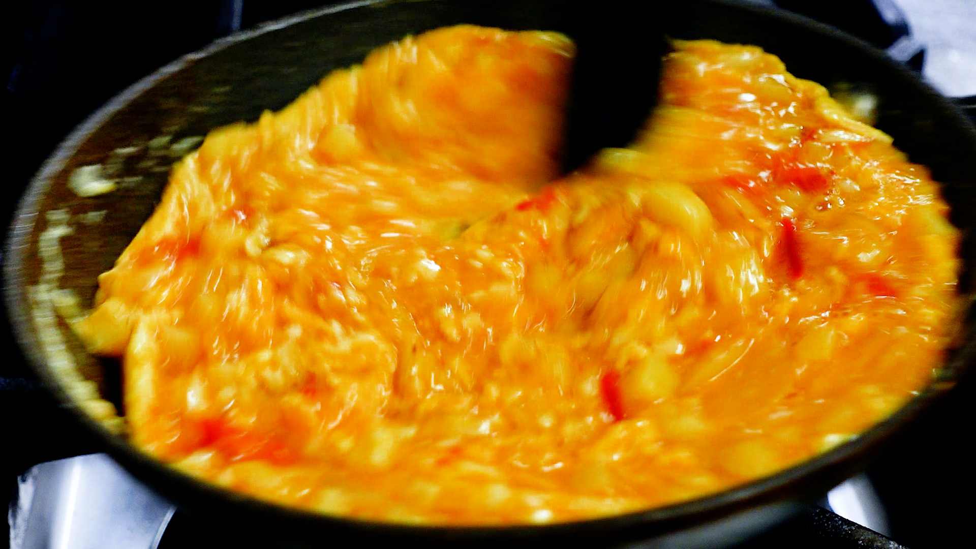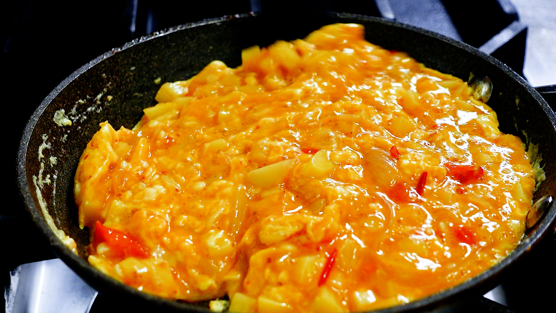 💡温かい野菜を卵に加え温度が上がっているため、意外とはやく半熟になります。火加減が強いと焦げやすいので注意!