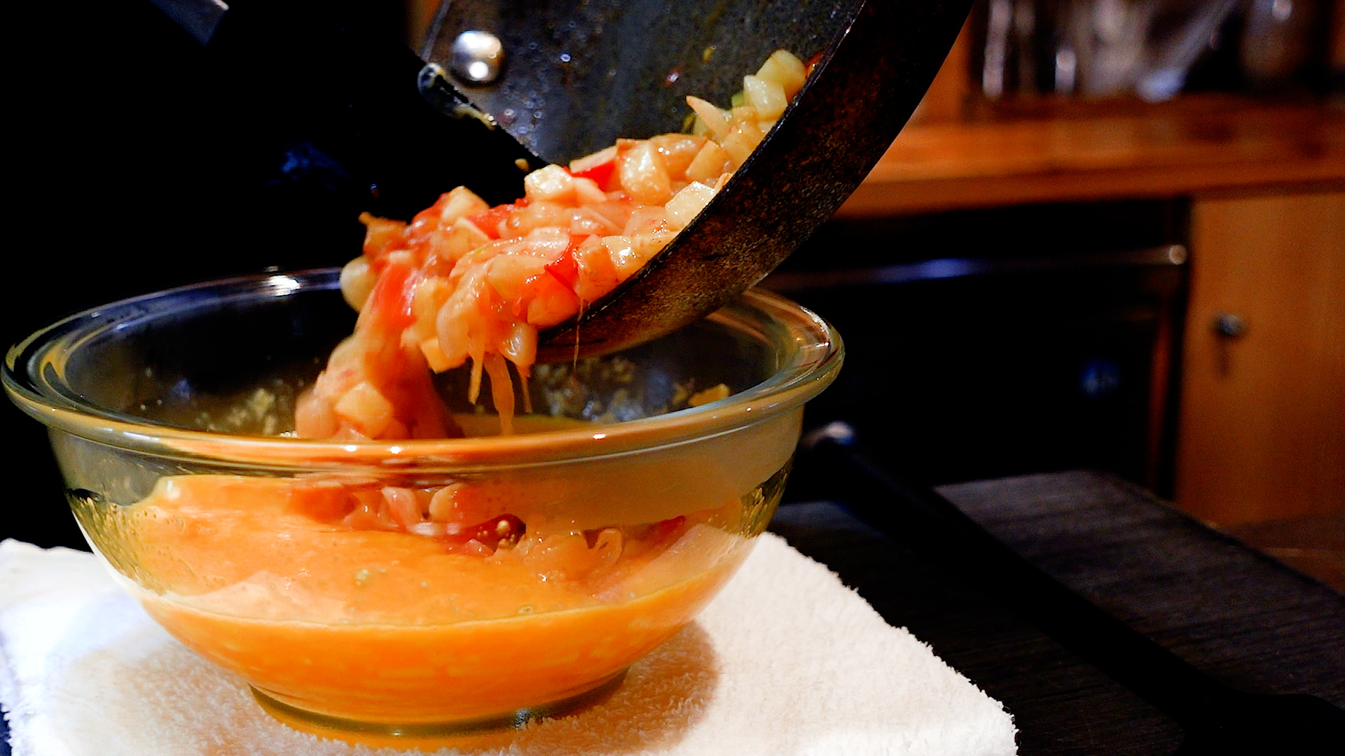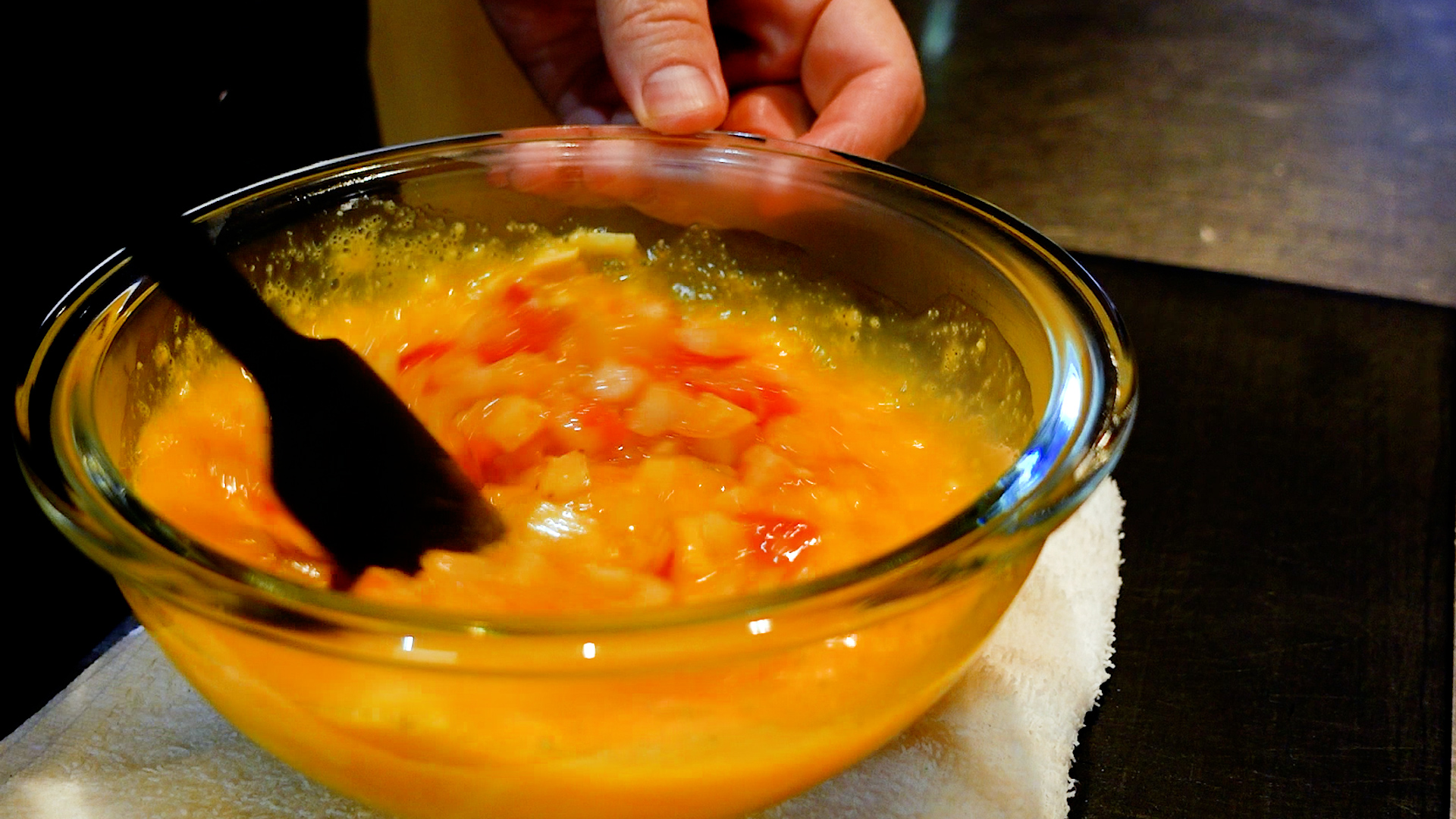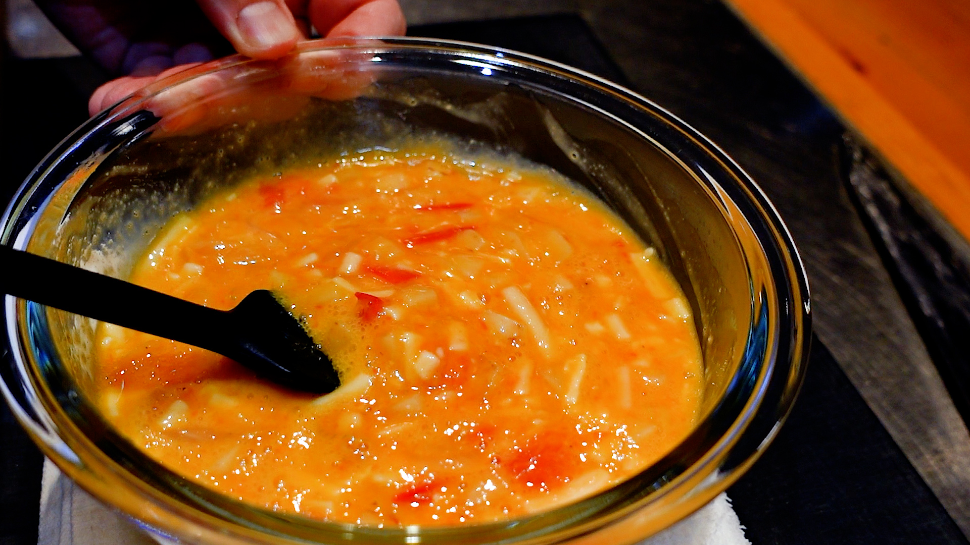 炒めた野菜を卵のボウルに加え、全体をヘラでサクッと混ぜ合わせる。