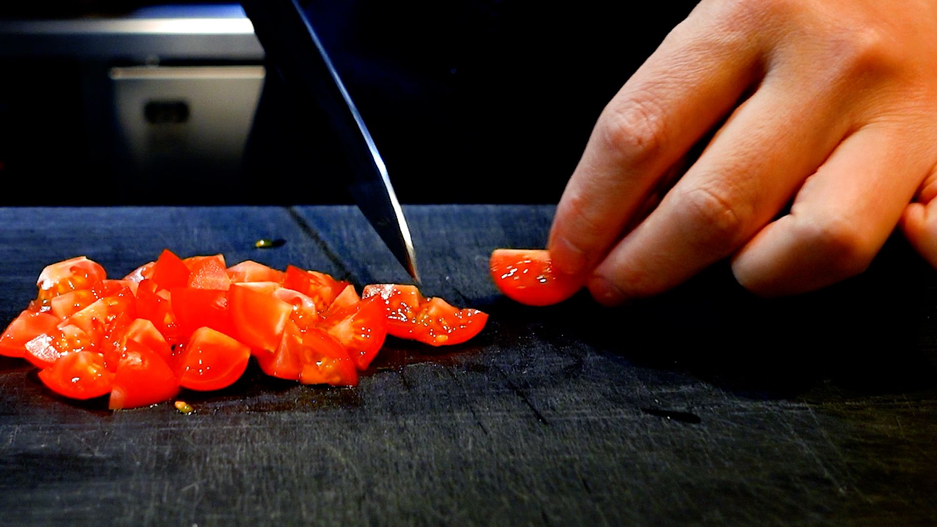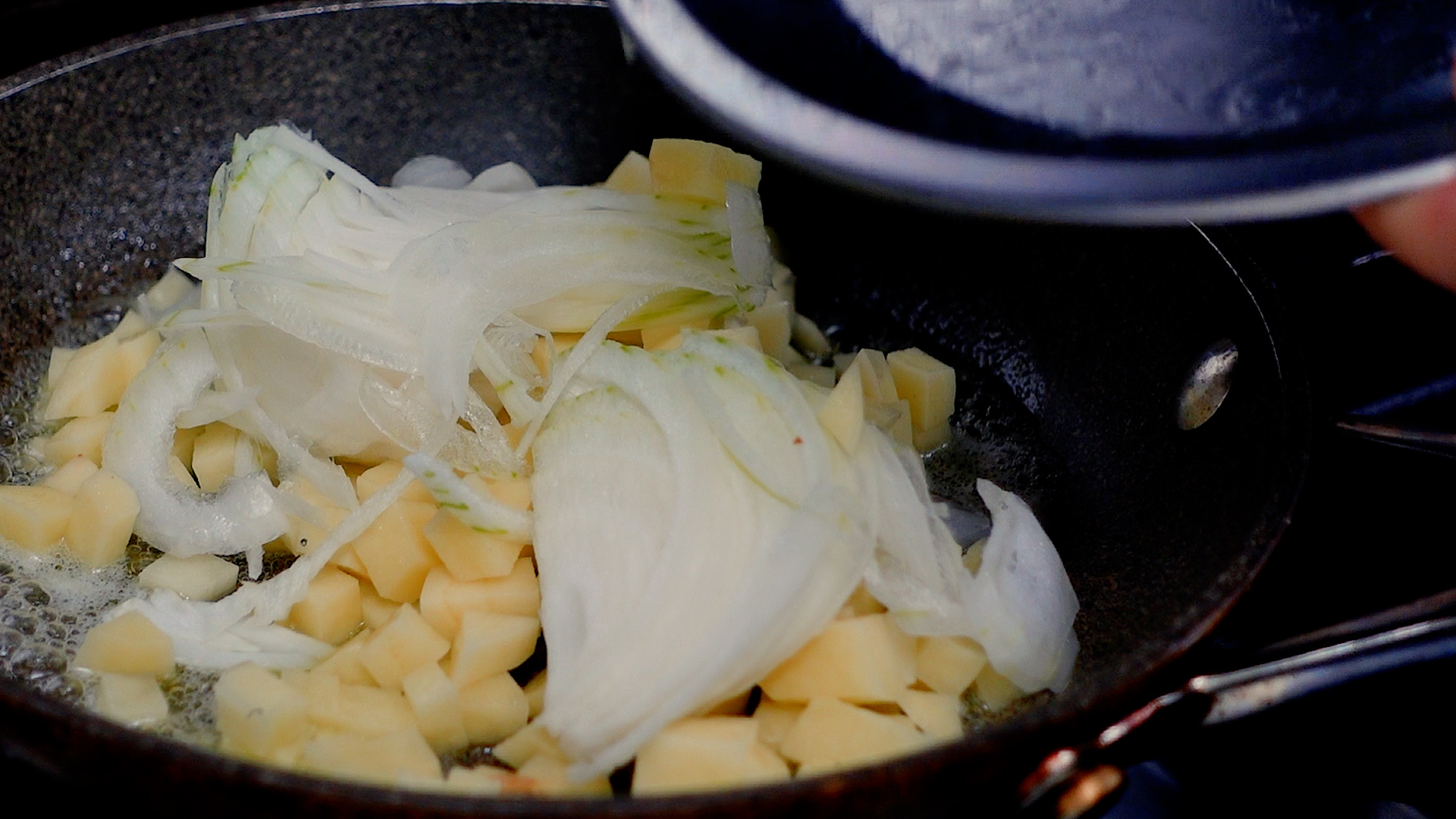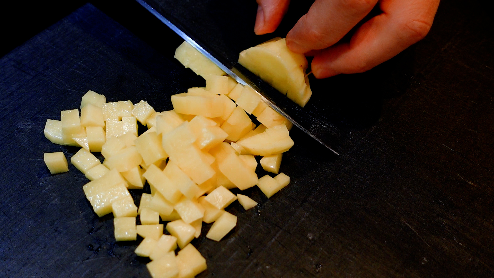 💡じゃがいもは5mm角より大きいと火の入りが心配なので、5mm以下がおすすめ。ミニトマトがなければ普通のトマトを角切りにしてもOKです。