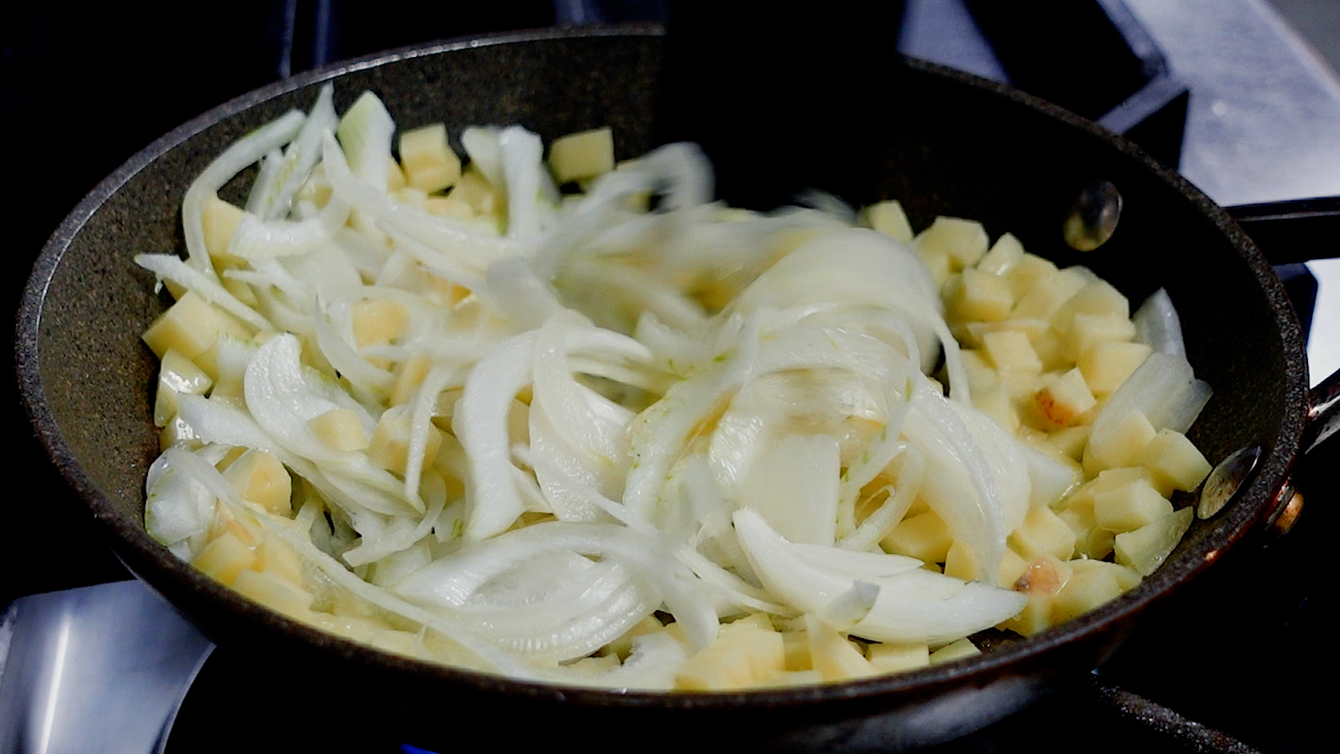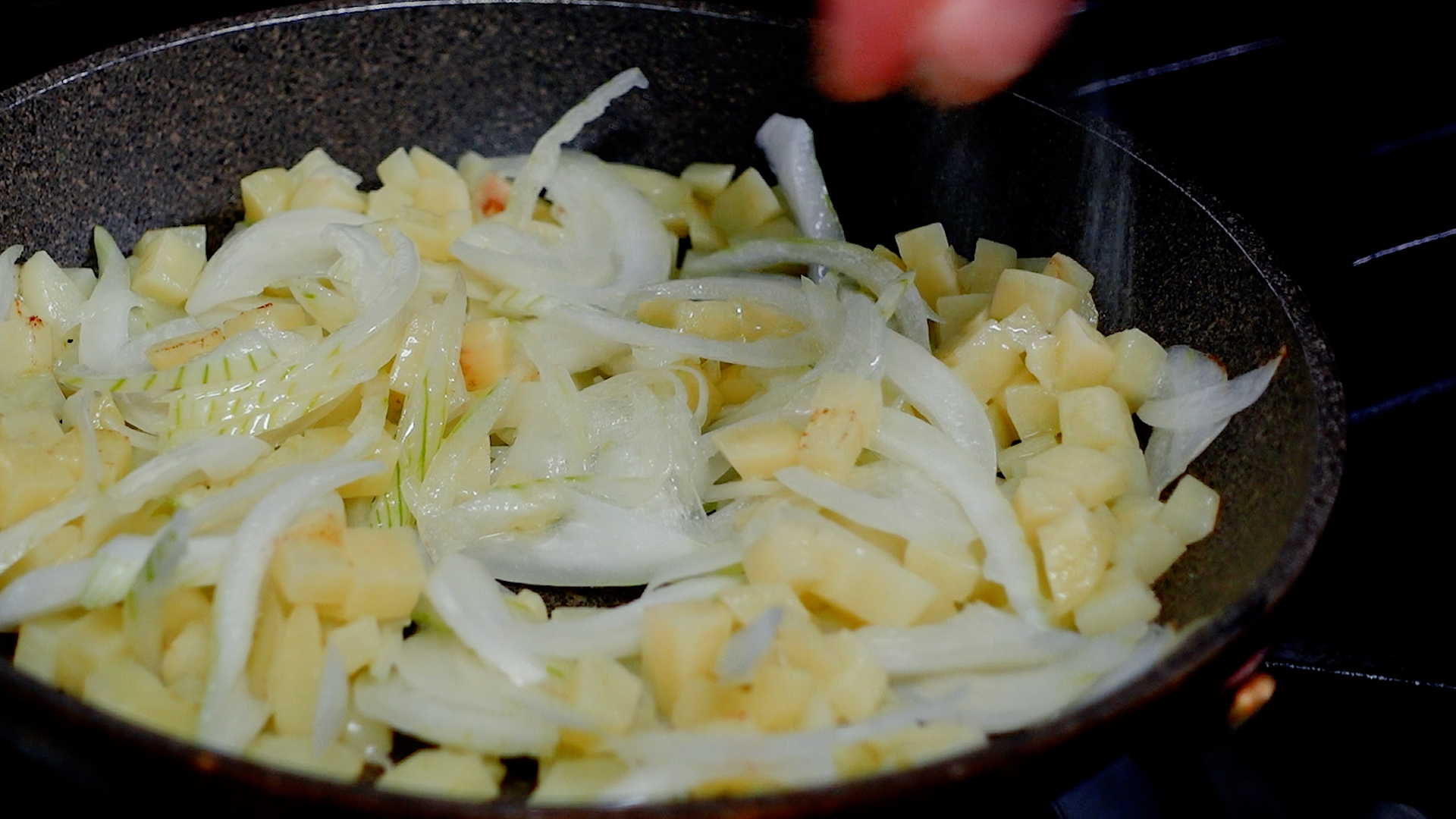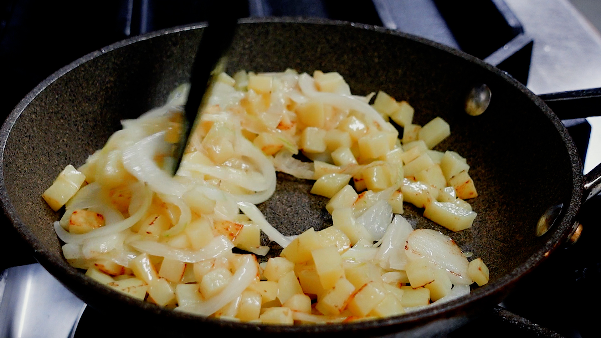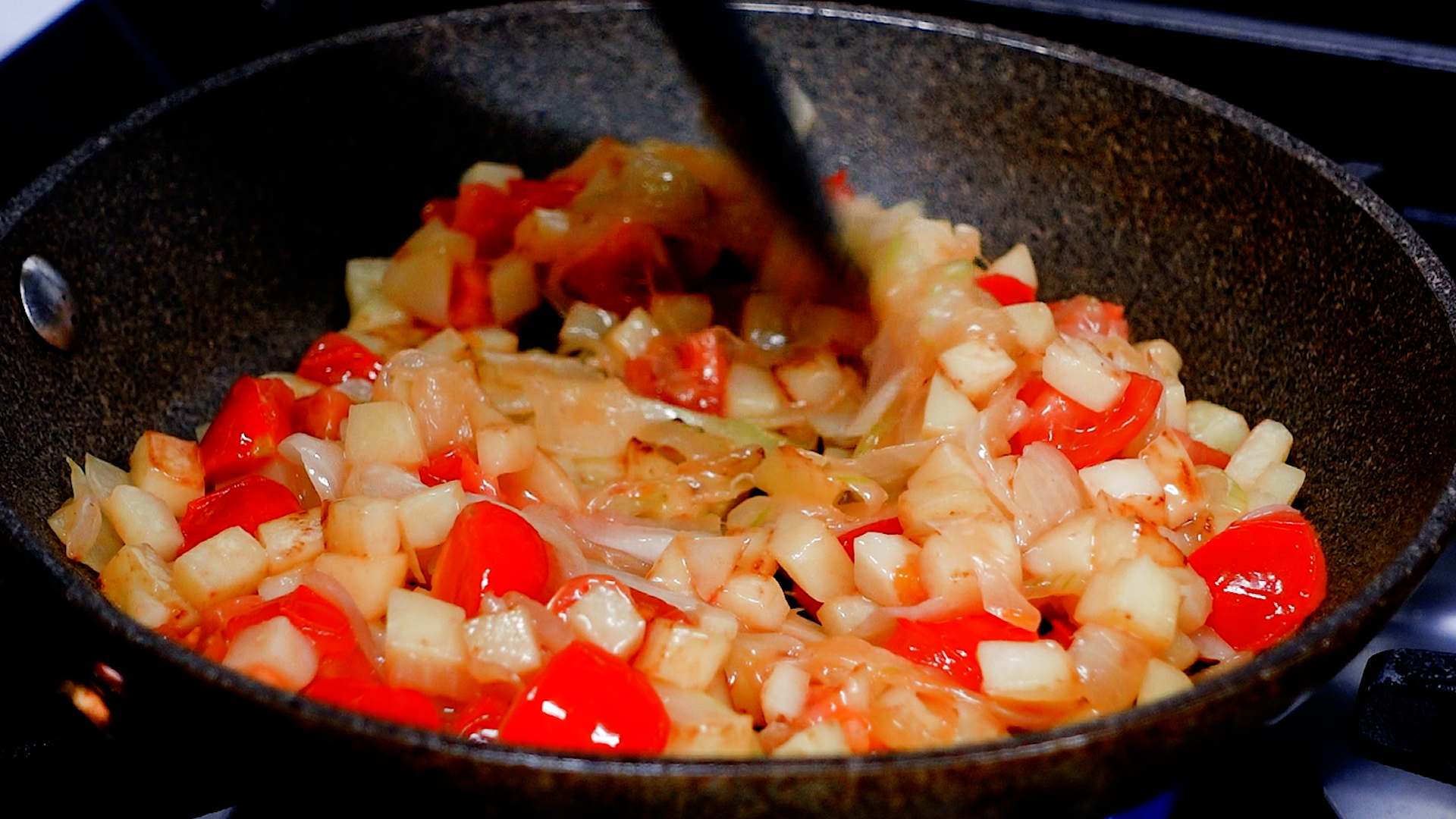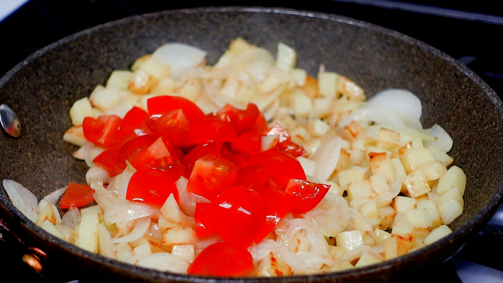 玉ねぎがしんなりし、じゃがいもに焼き目がつくまで炒める。玉ねぎがしんなりしてきたらミニトマトを加え炒める。