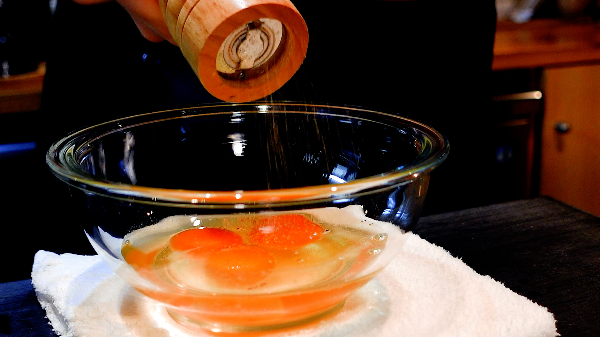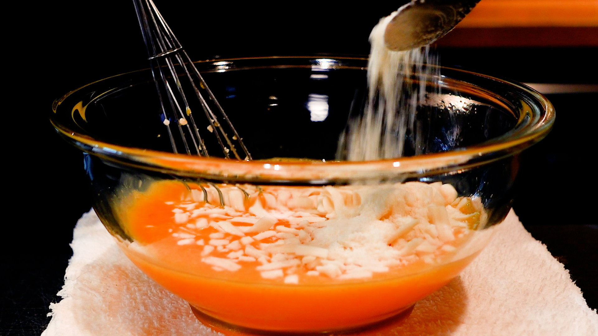 ボウルに卵を割り入れ、塩 1つまみ、こしょう 少々をして混ぜる。ミックスチーズ、粉チーズを加えさらに混ぜる。