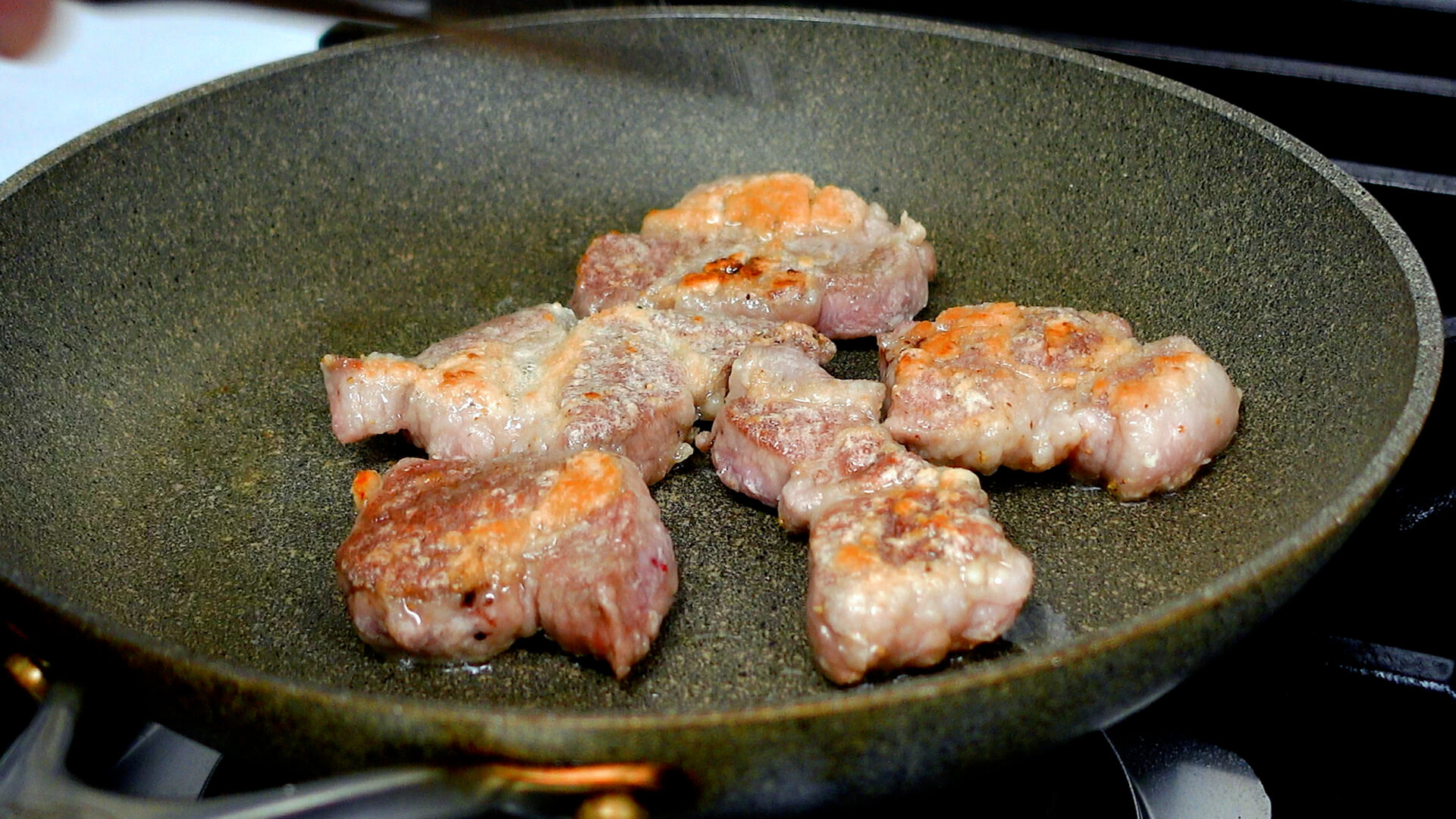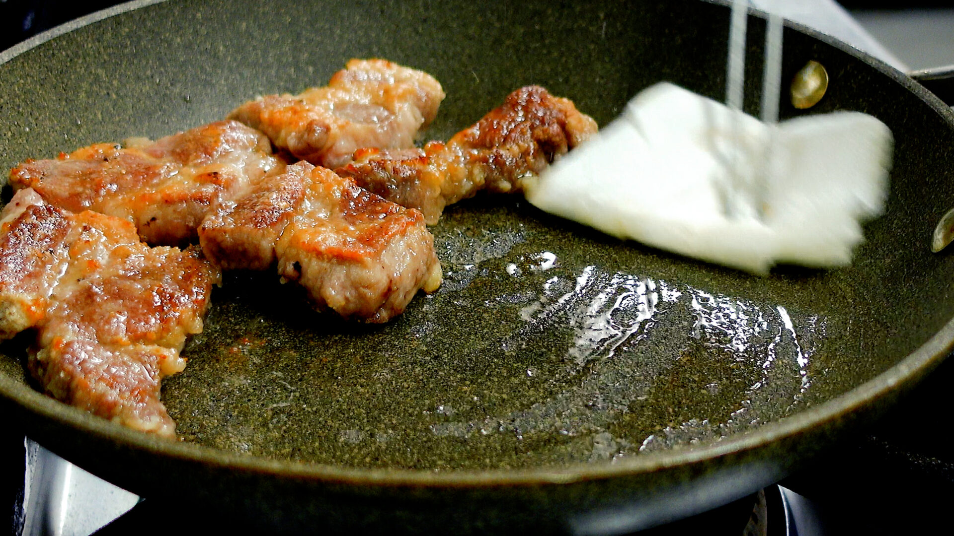 💡しっかりと焼くことでうまみが出ます。豚肉から出てくる脂はうまみにもなるので、気にならない場合はふきとらなくてもOKです。