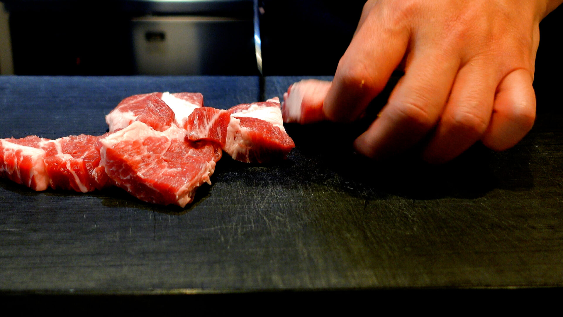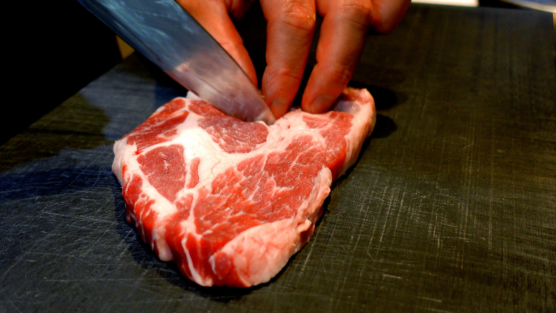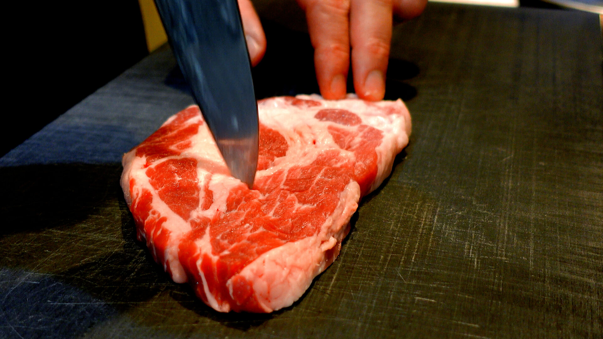 豚肩ロース肉は脂身と赤身の間の筋を切り、フォークまたは包丁で数か所穴をあける。