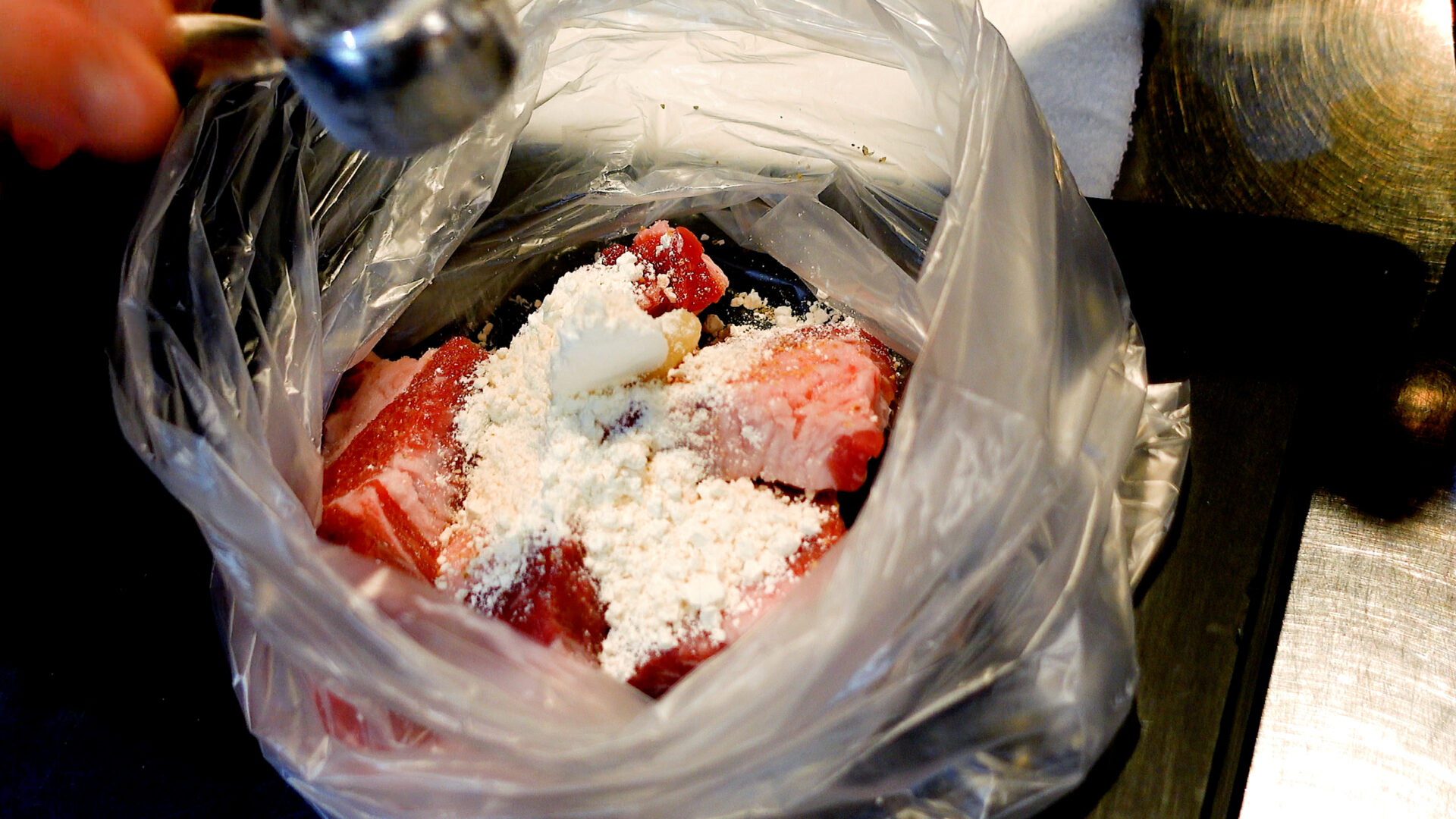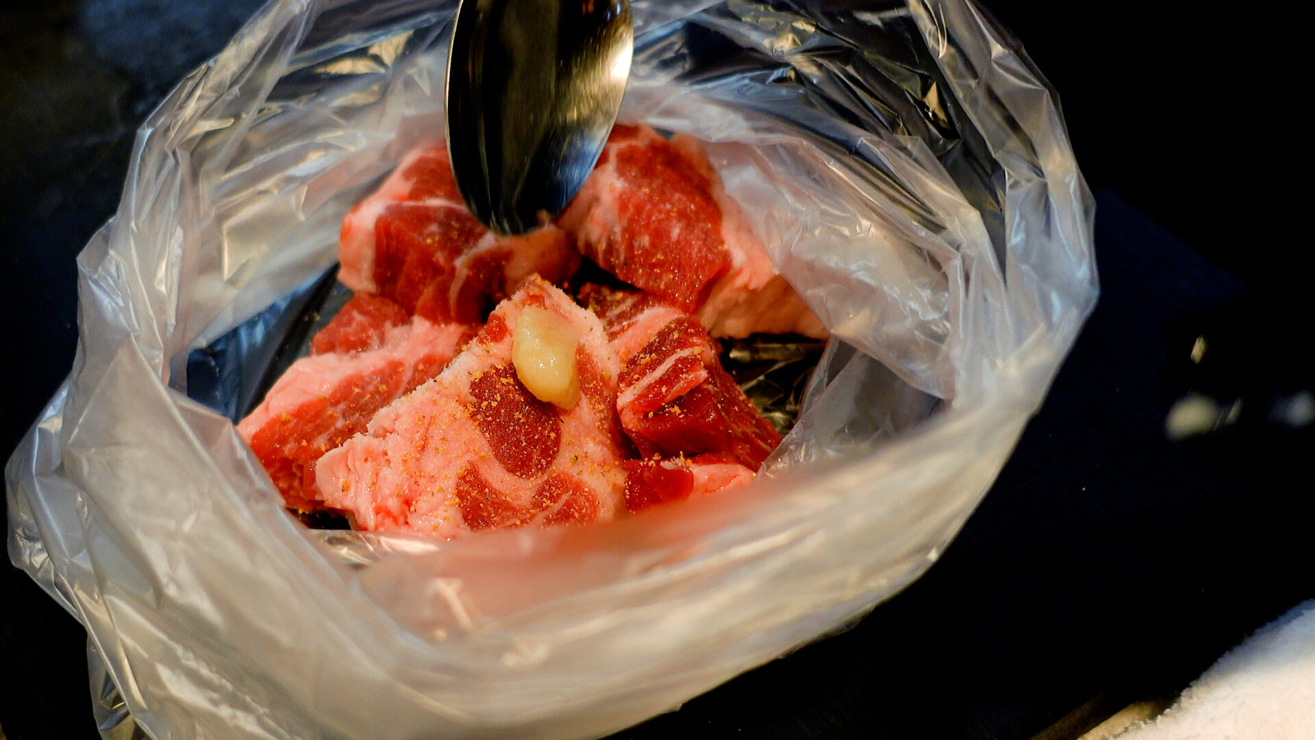 豚肉を袋に入れ◆塩 1つまみ、こしょう 少々、おろしにんにく 小さじ1/2、薄力粉 大さじ1を加え、手で揉み込み味をなじませる。
