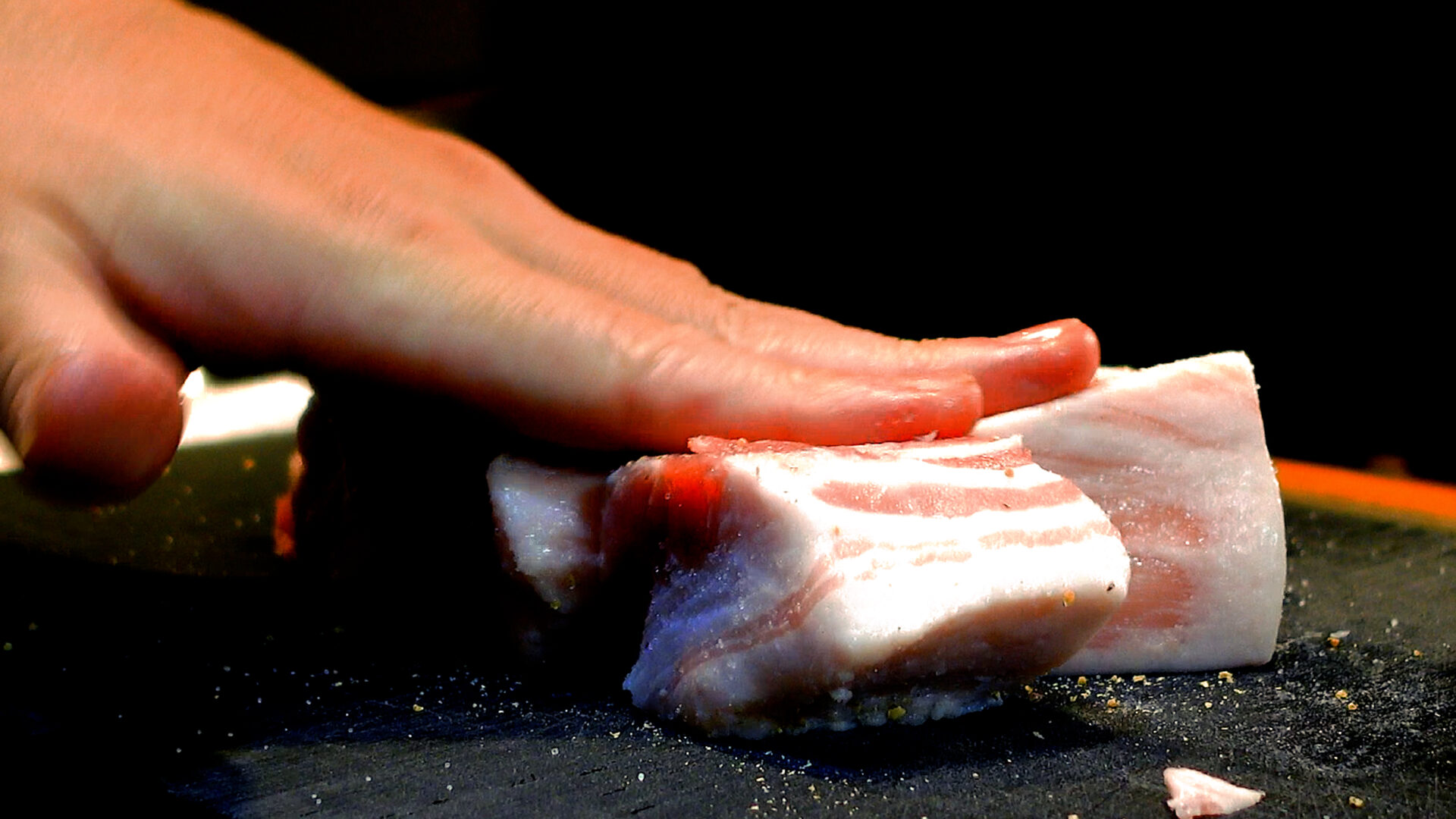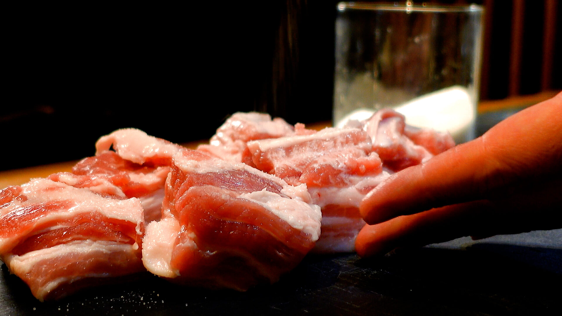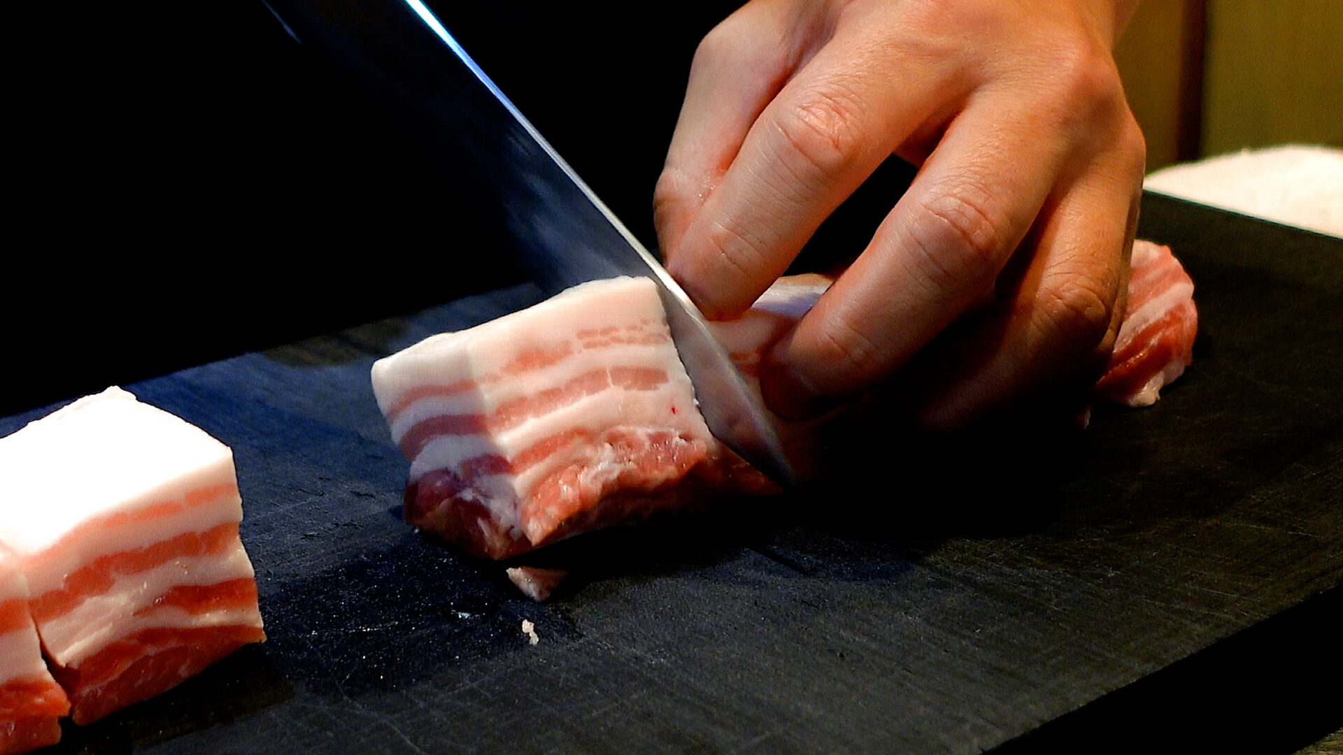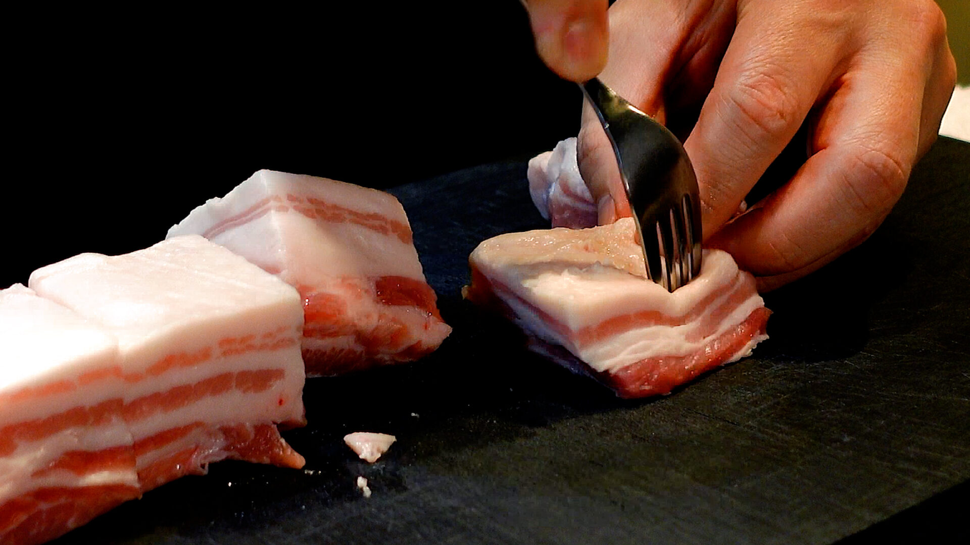 豚バラ肉ブロックは3~4cm幅に切る。フォーク、または包丁の先で数カ所穴をあける。