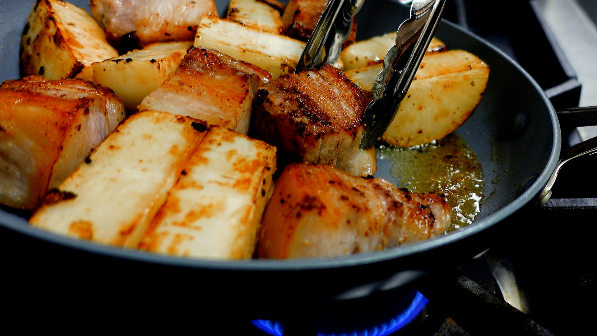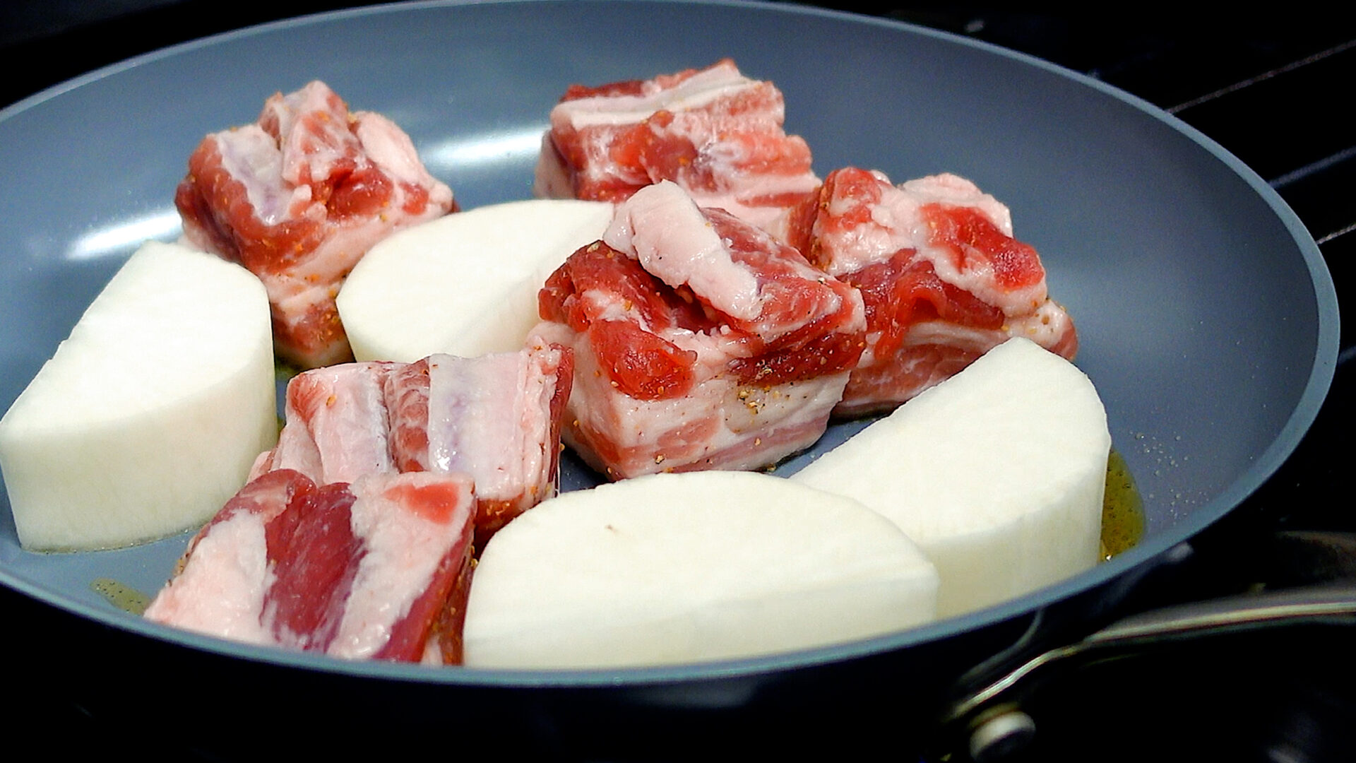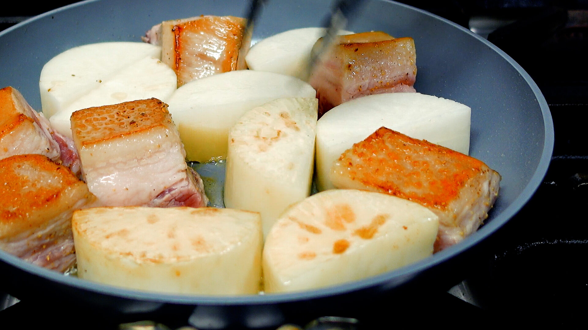 焼け始めたら弱火にし、豚肉、大根全面に焼き目をつける(豚肉から油が出てきたら、ある程度ふきとる)。