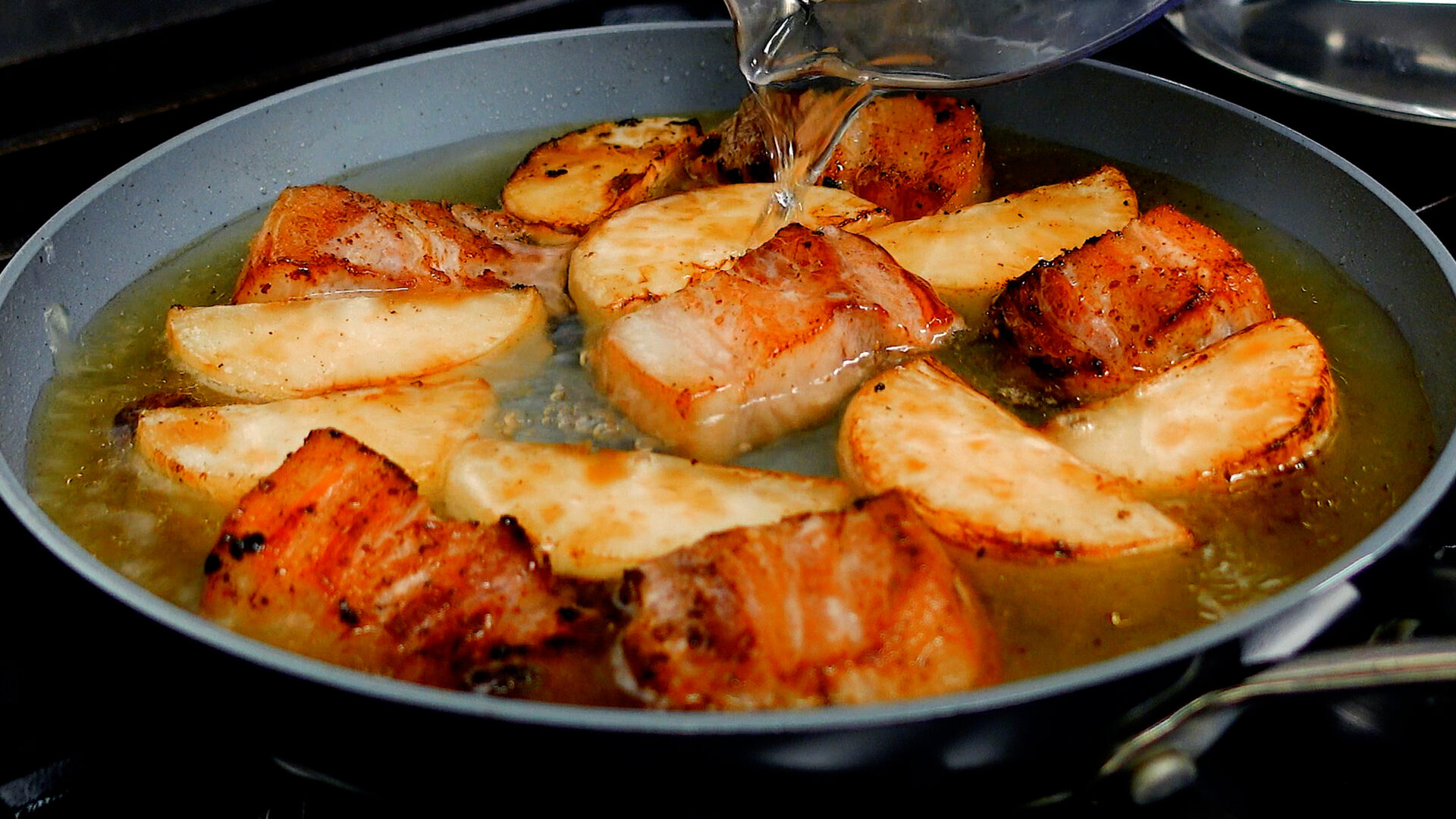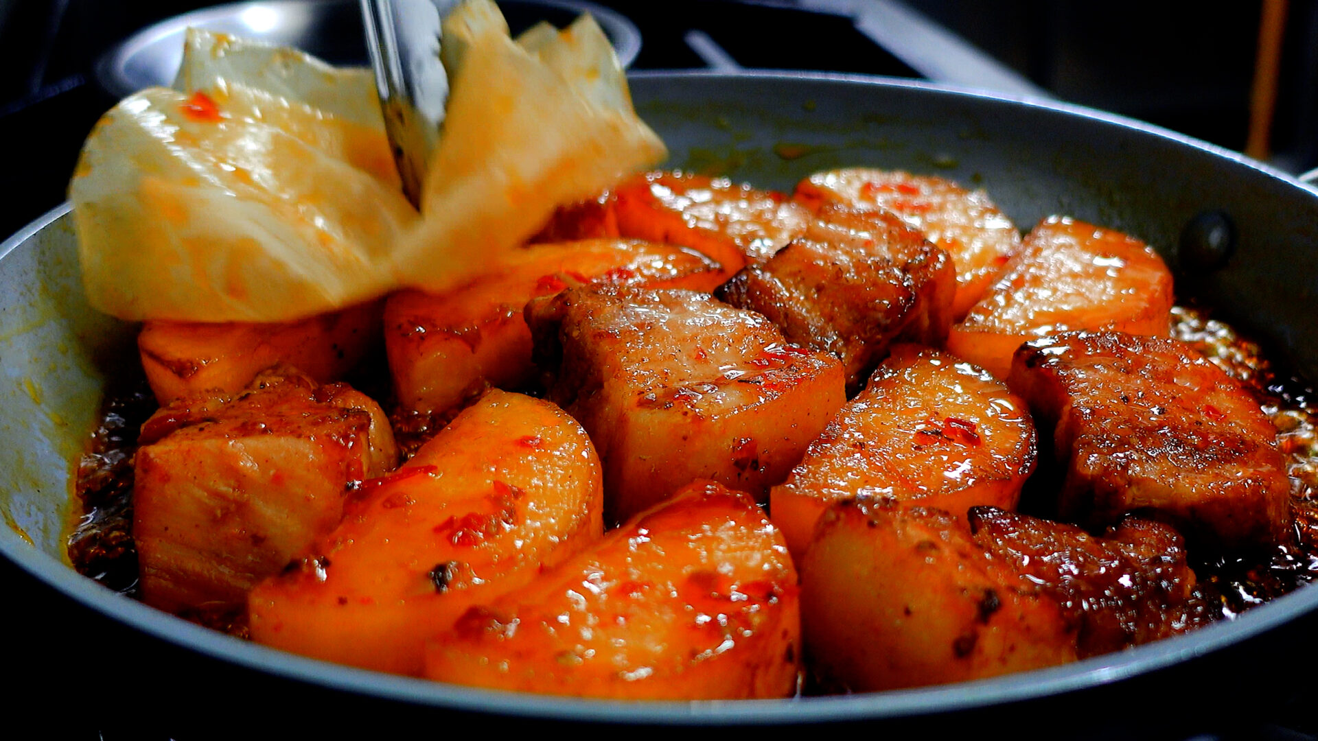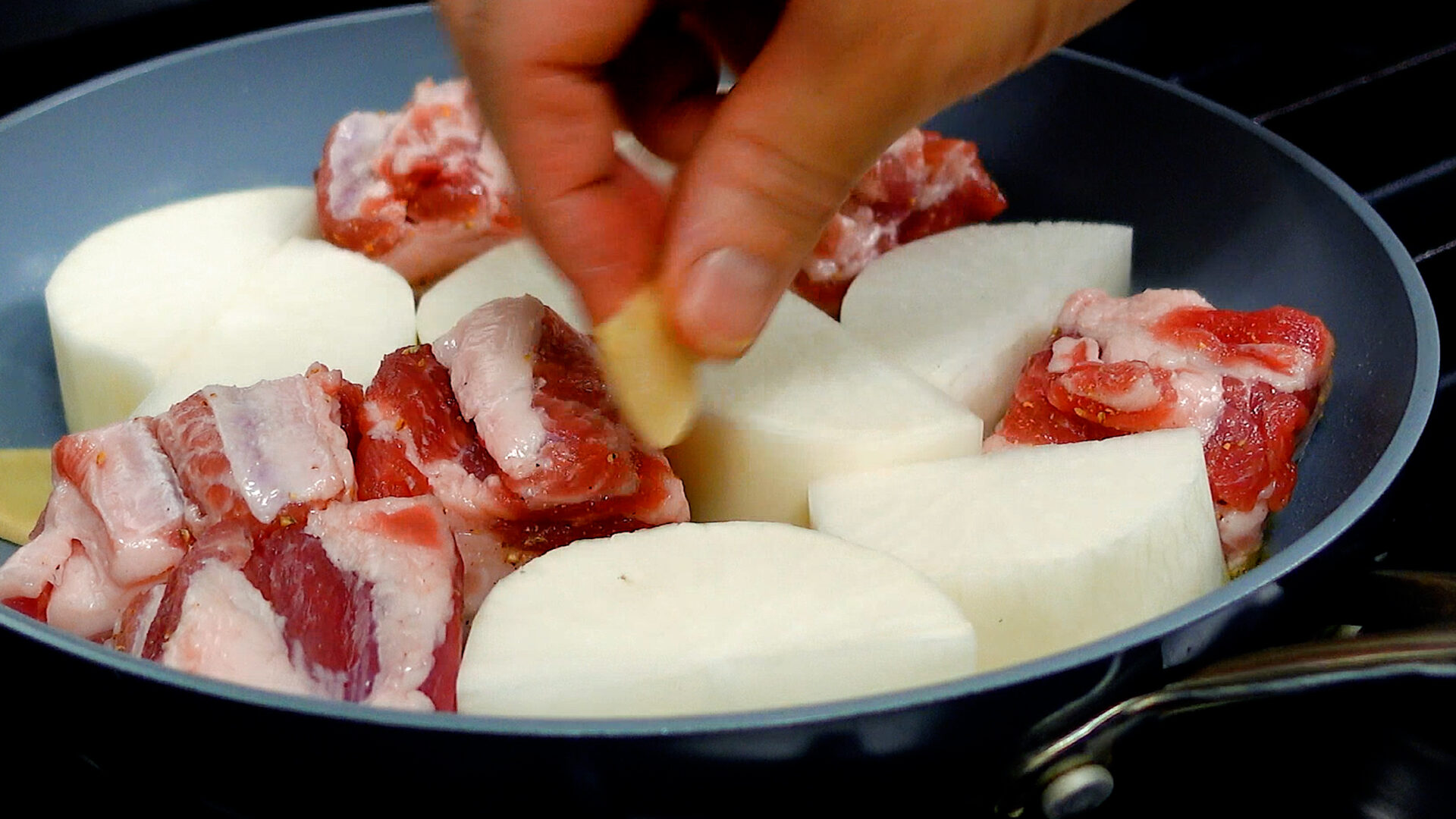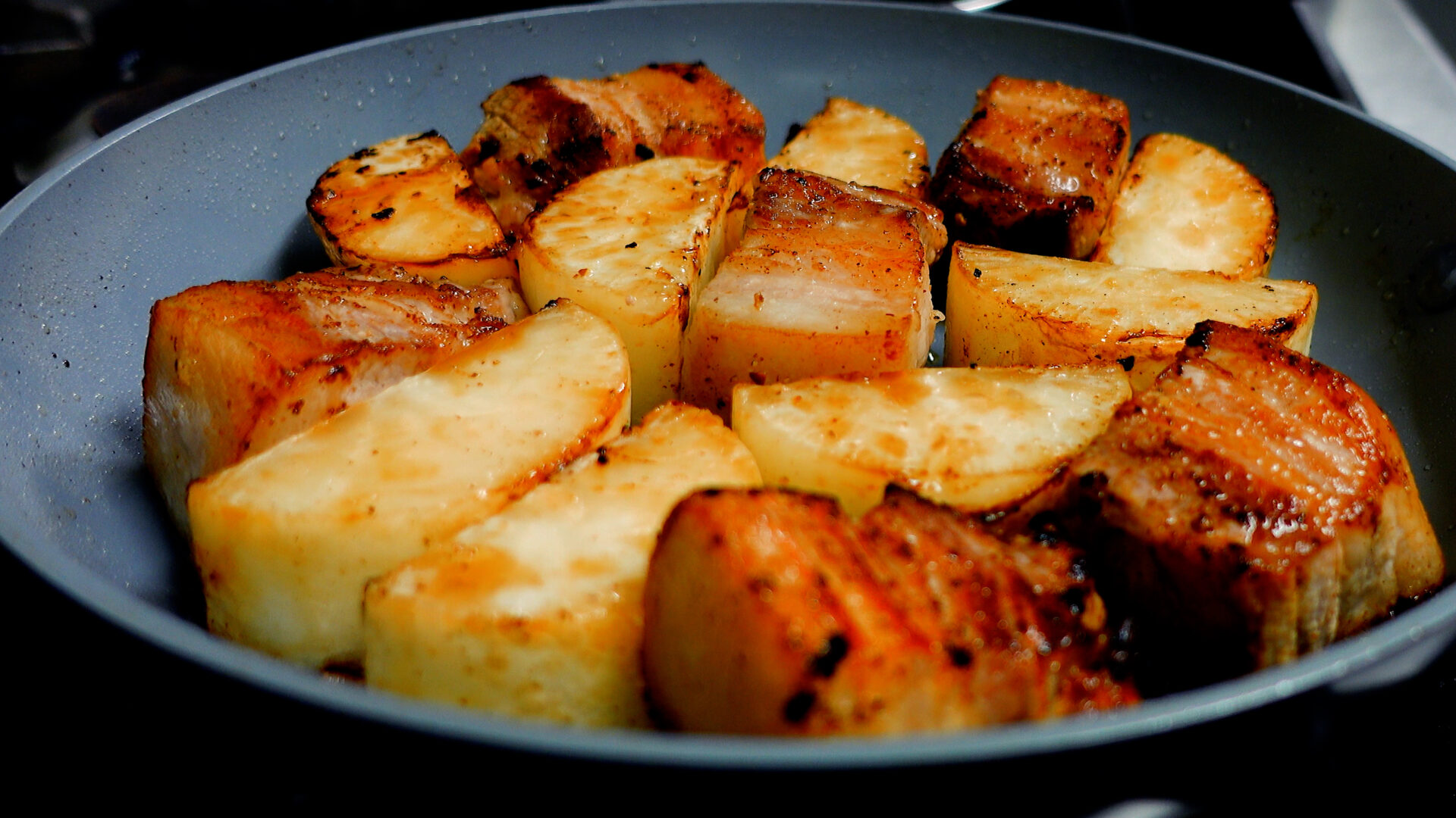 焼け始めたら弱火にし、豚肉、大根全面に焼き目をつける(豚肉から油が出てきたら、ある程度ふきとる)。