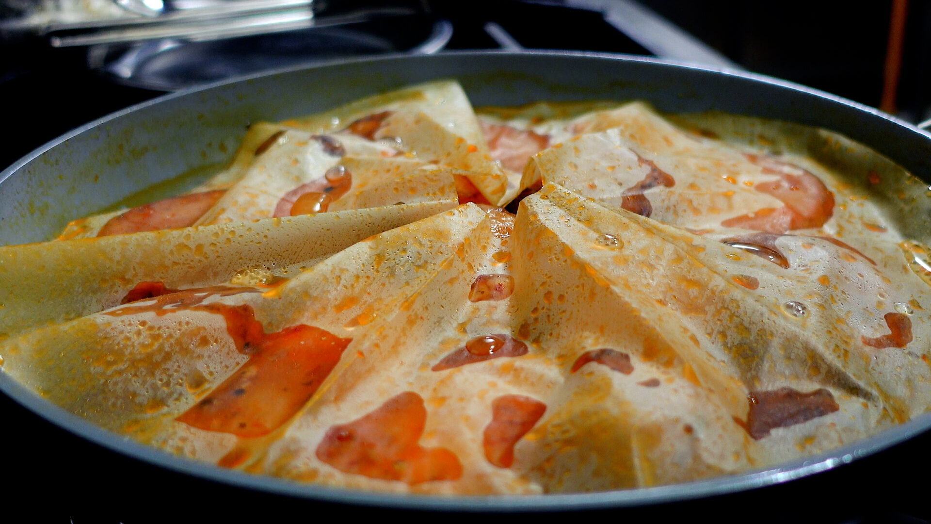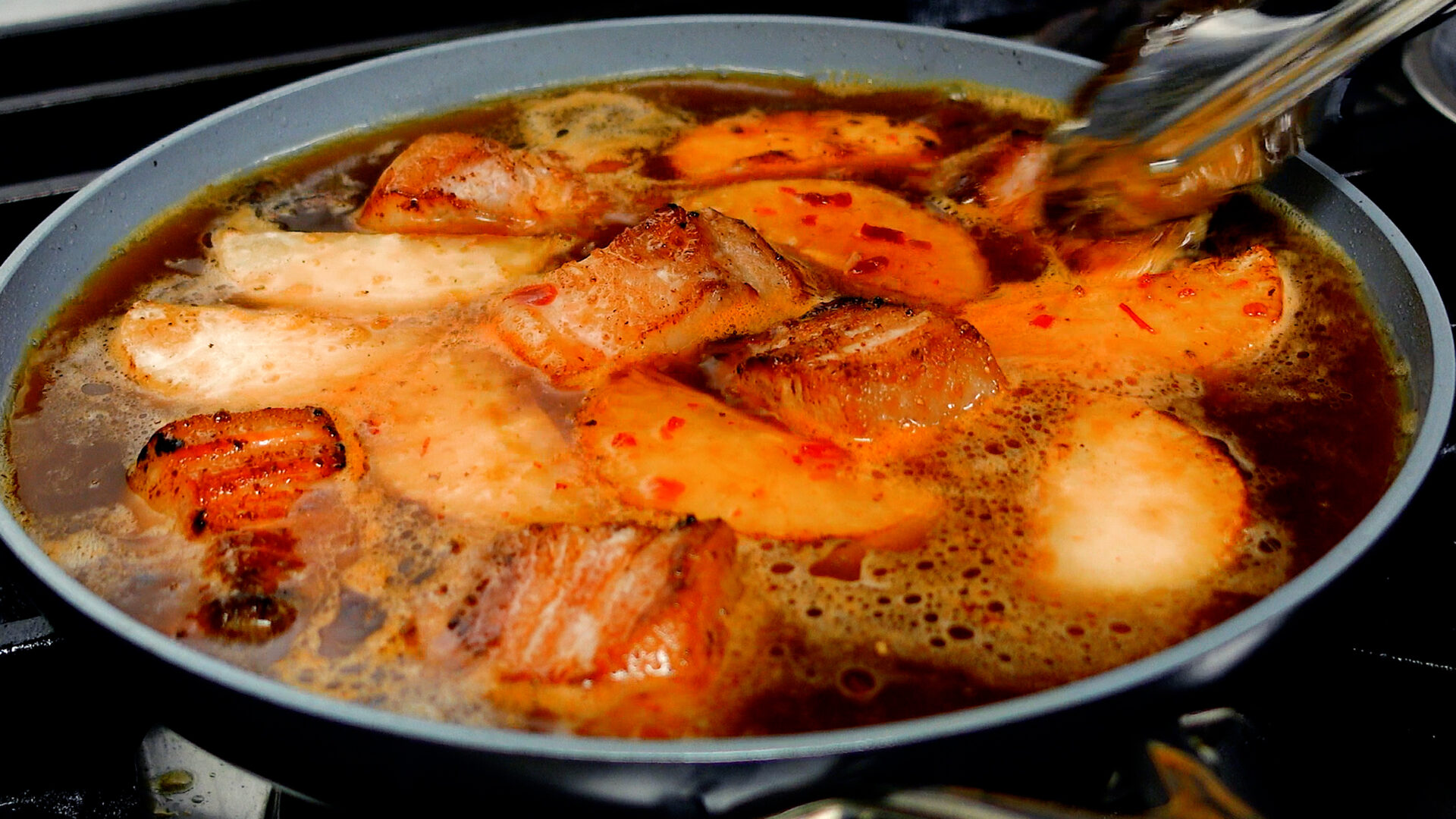 💡今回使っているのは26cmのフライパンです。蓋をするときは、ふきこぼれないように少しずらしてください!煮詰めすぎた場合は水を足してのばします。
