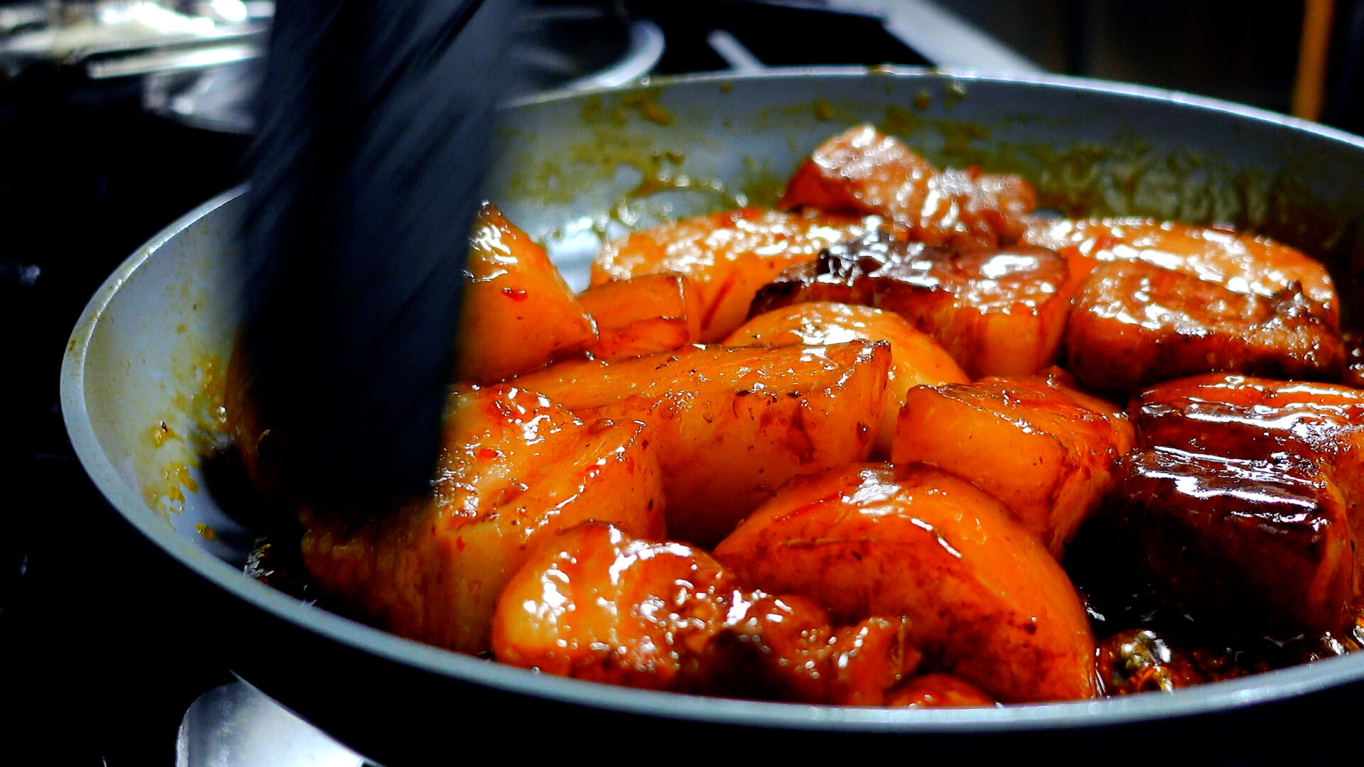 仕上げにヘラでタレを絡め、皿に盛る。