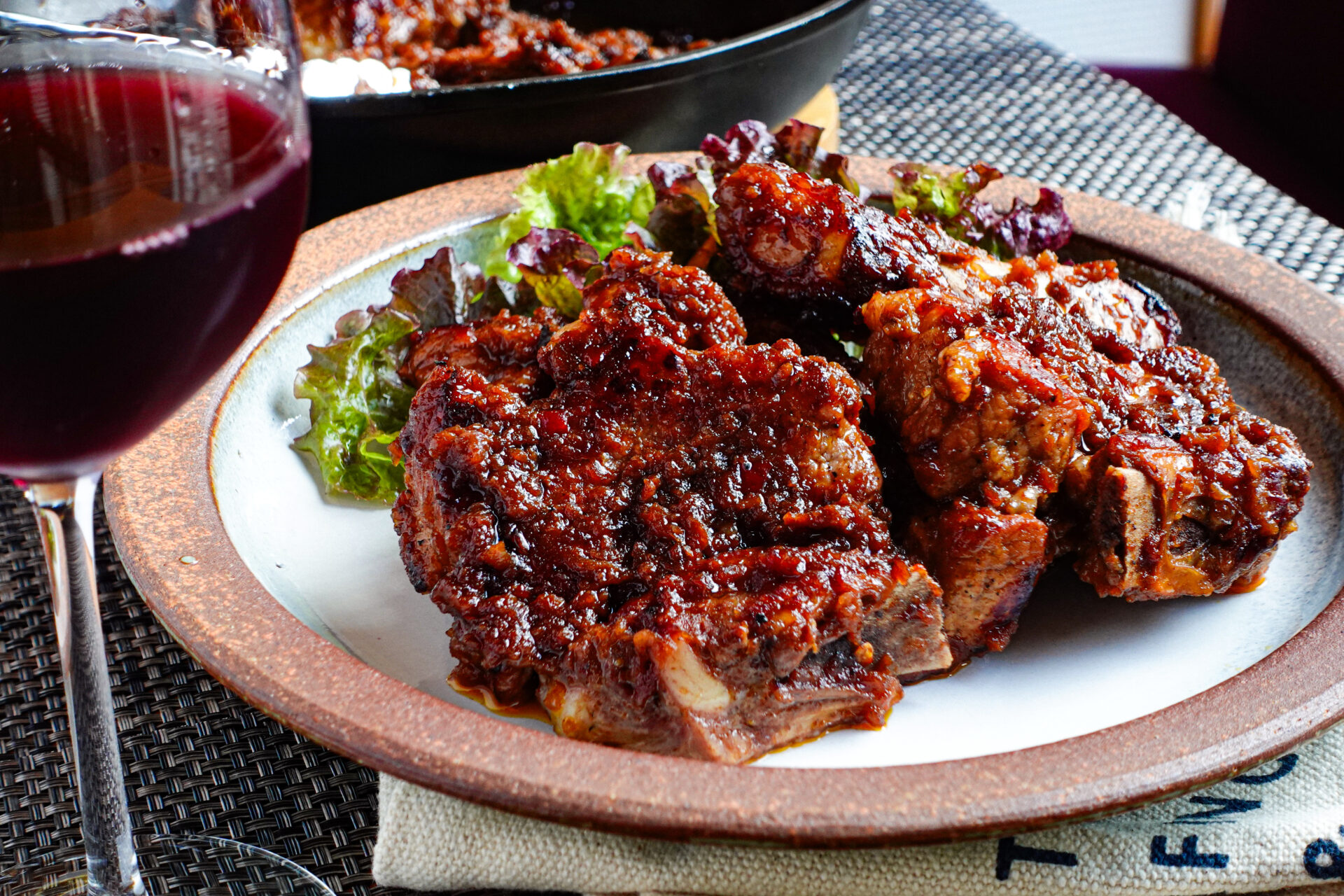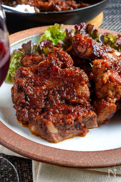 赤ワインのコク、コチュジャンのピリ辛が効いたタレが豚肉とベストマッチ👍️