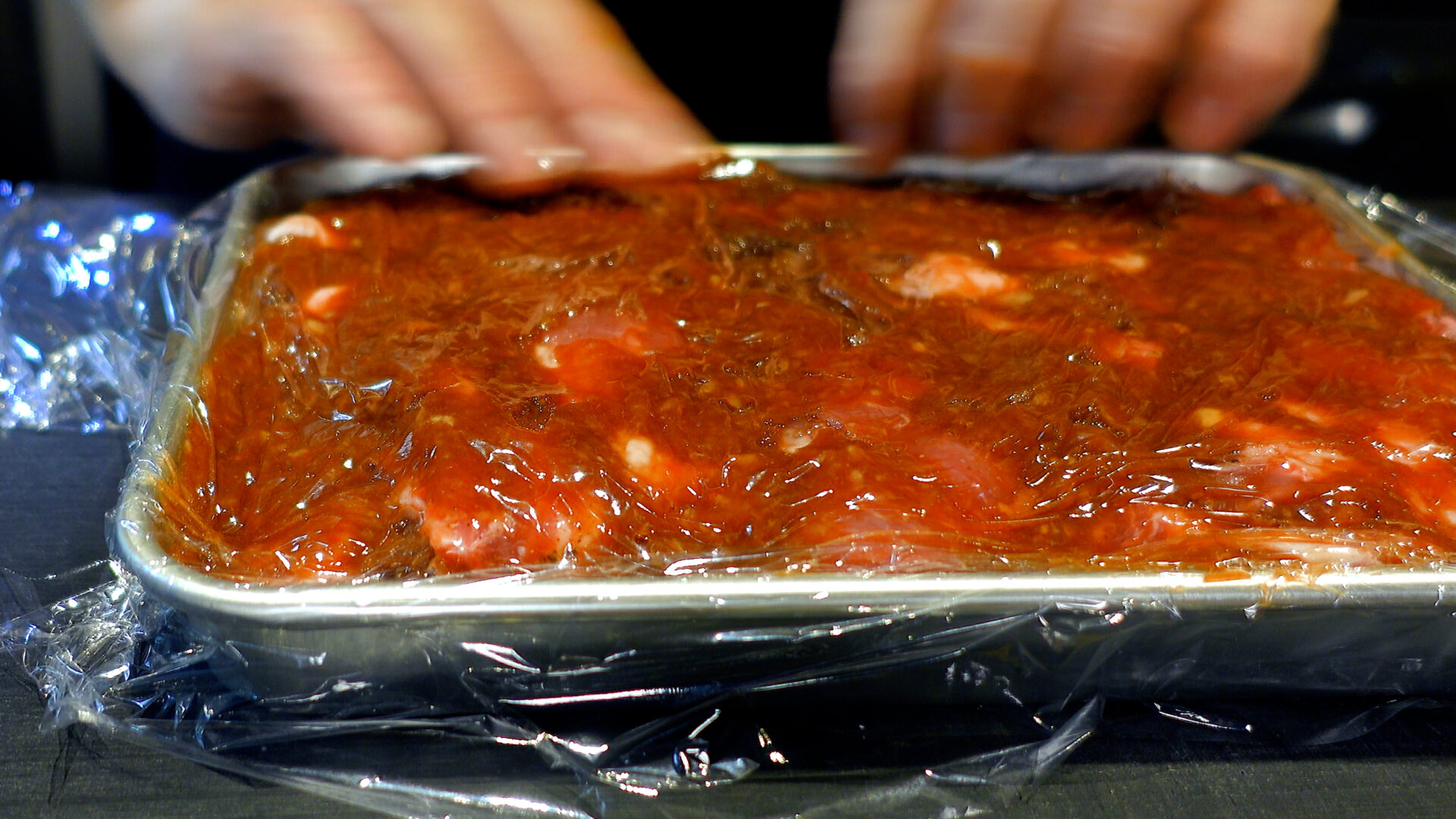 残りのタレを上から塗るようにかける。ラップをして冷蔵庫で3時間から一晩おき、味を染み込ませる。