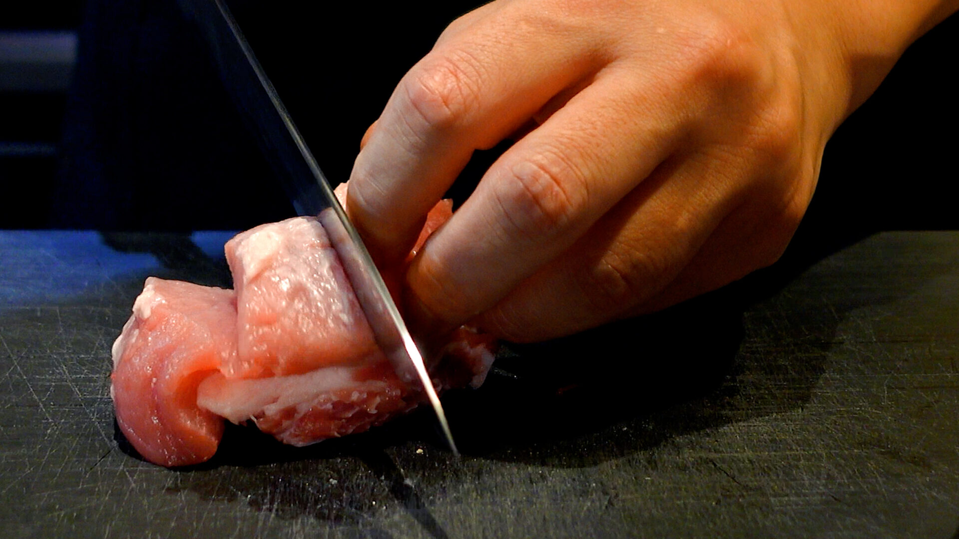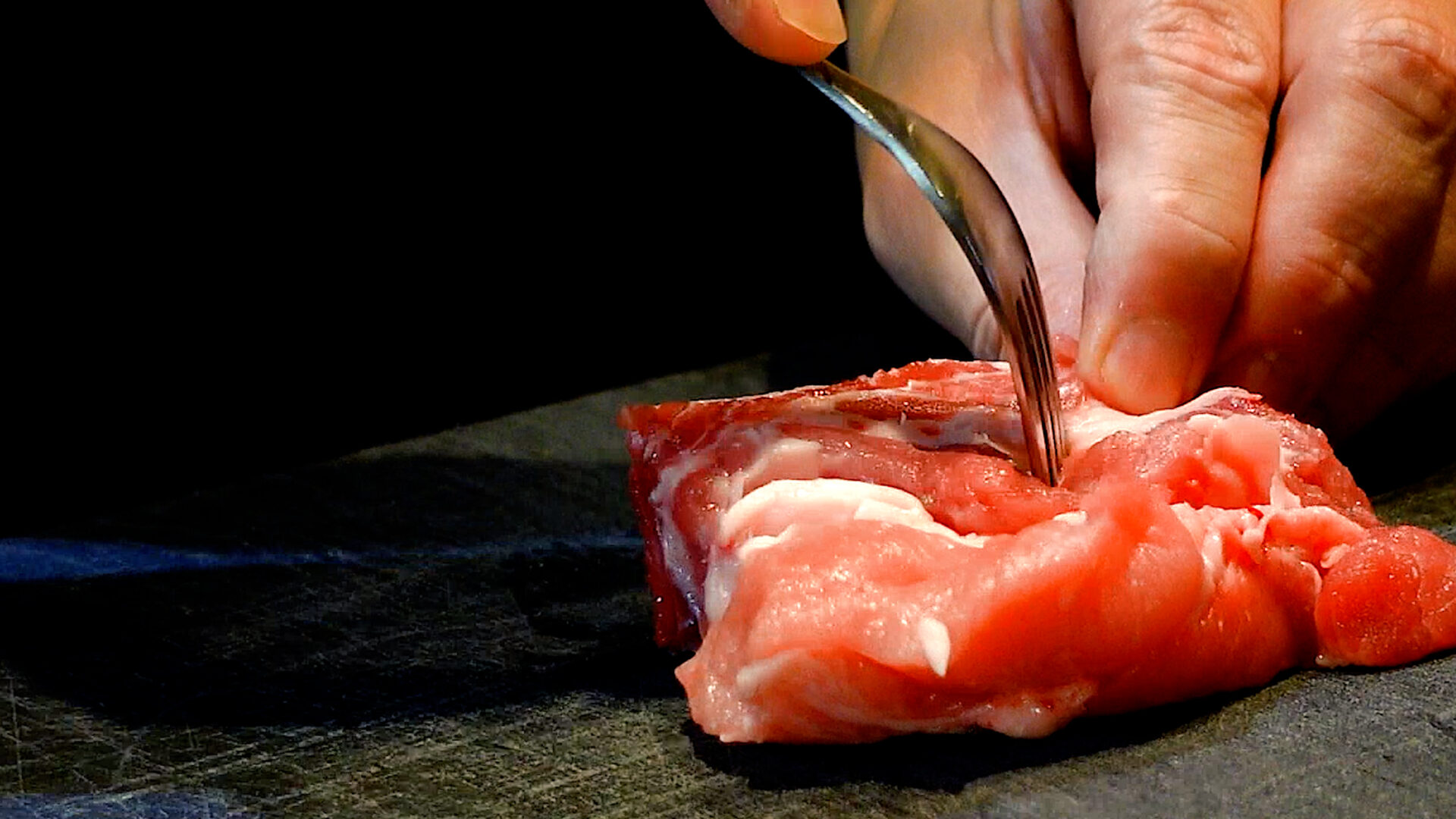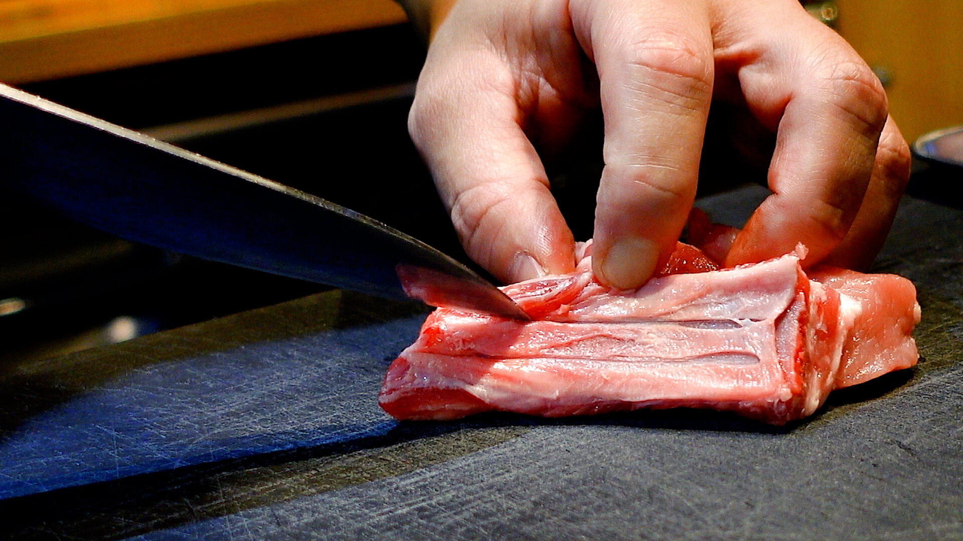 💡骨の膜に切り込みを入れることで、加熱時に肉が骨に引っ張られるのを防ぎます。