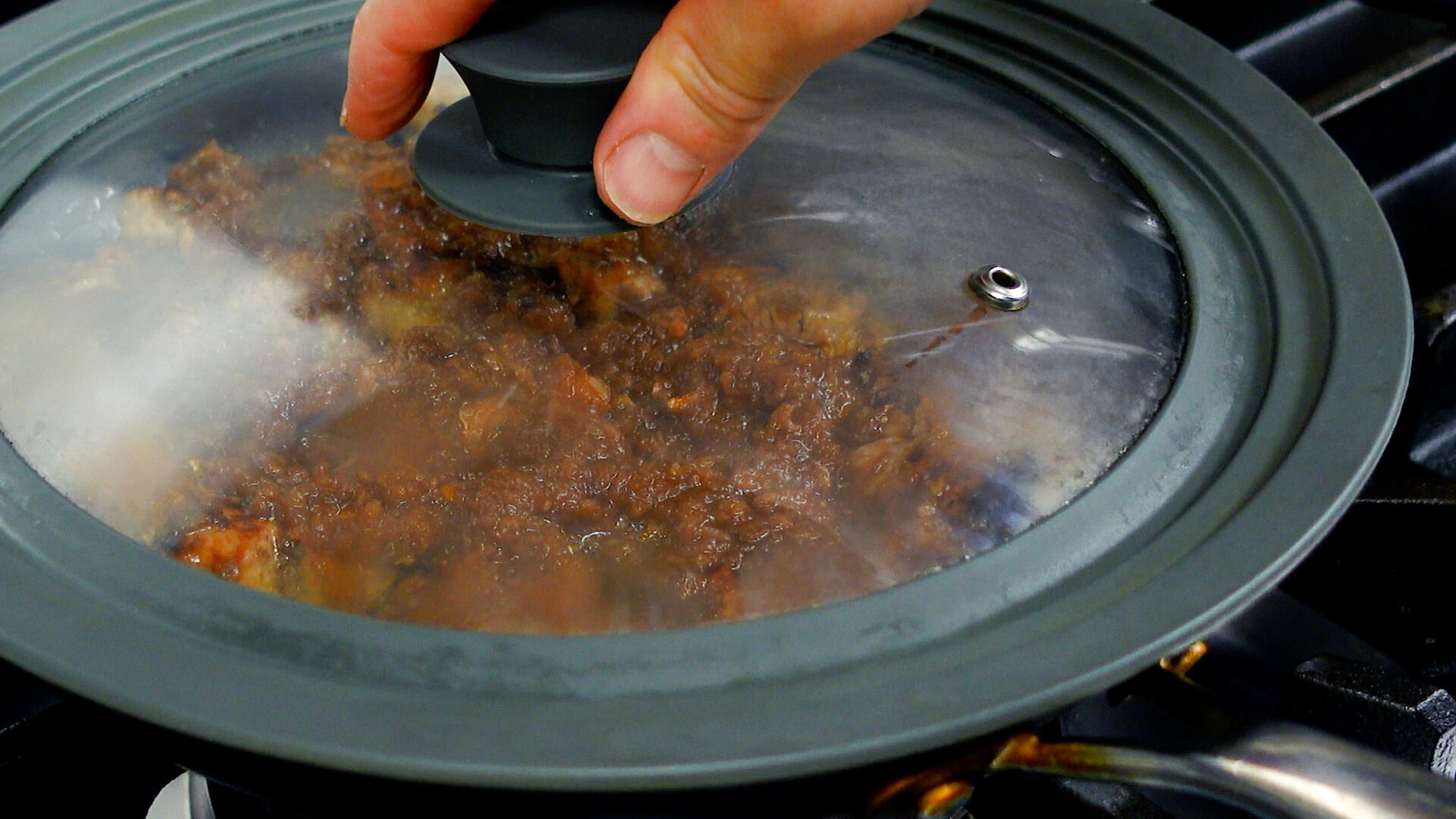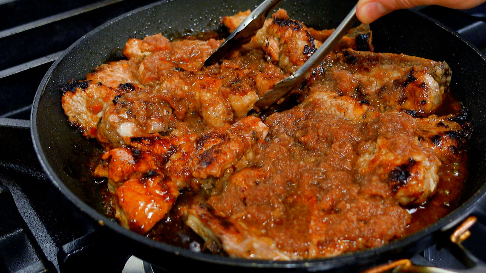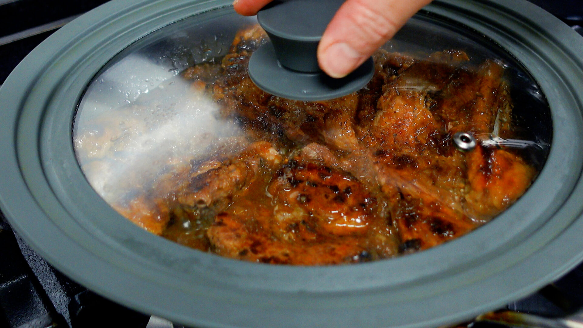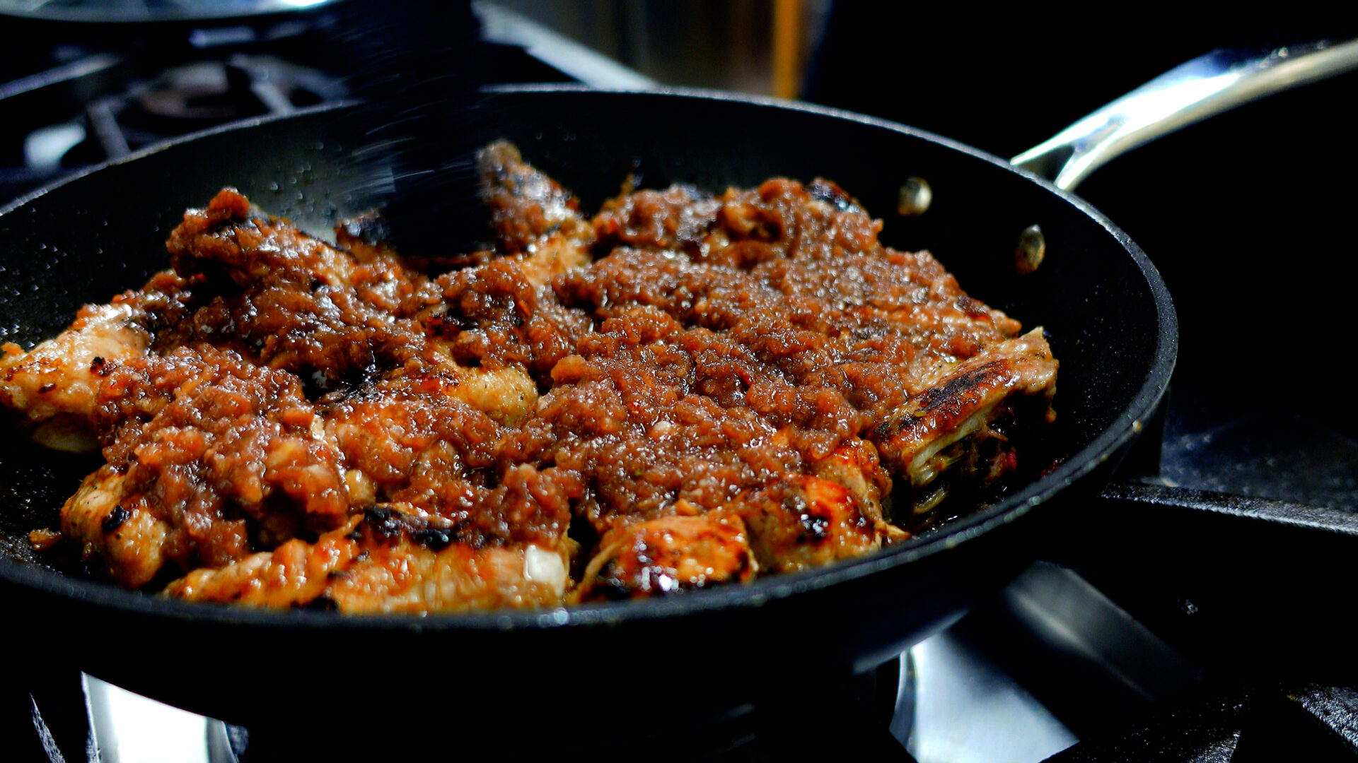 焼き目がついたらタレを全て加える。弱火に落とし、蓋をして15分蒸し焼きにする(5分おきに上下を入れ替え、タレを絡める)。