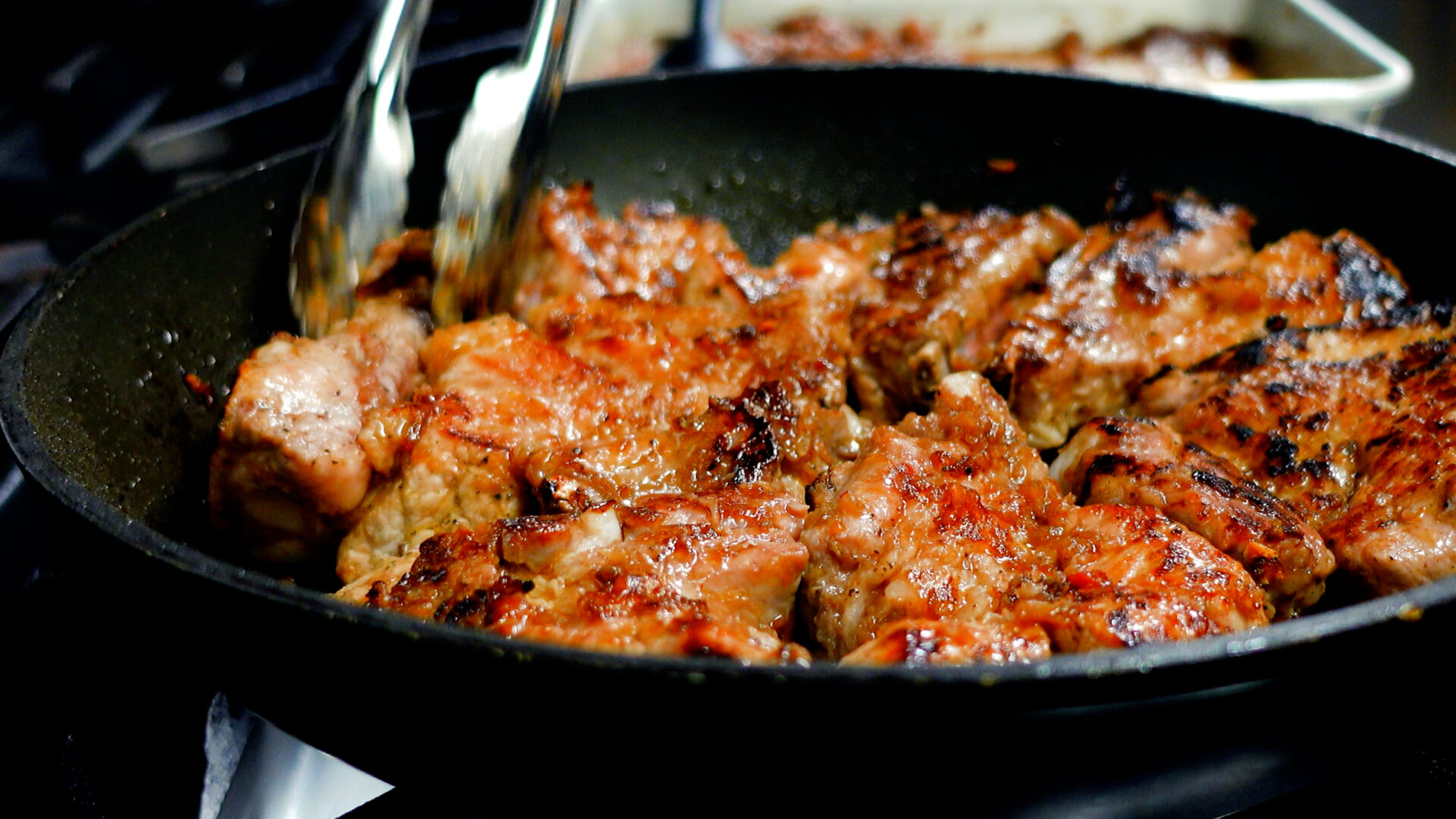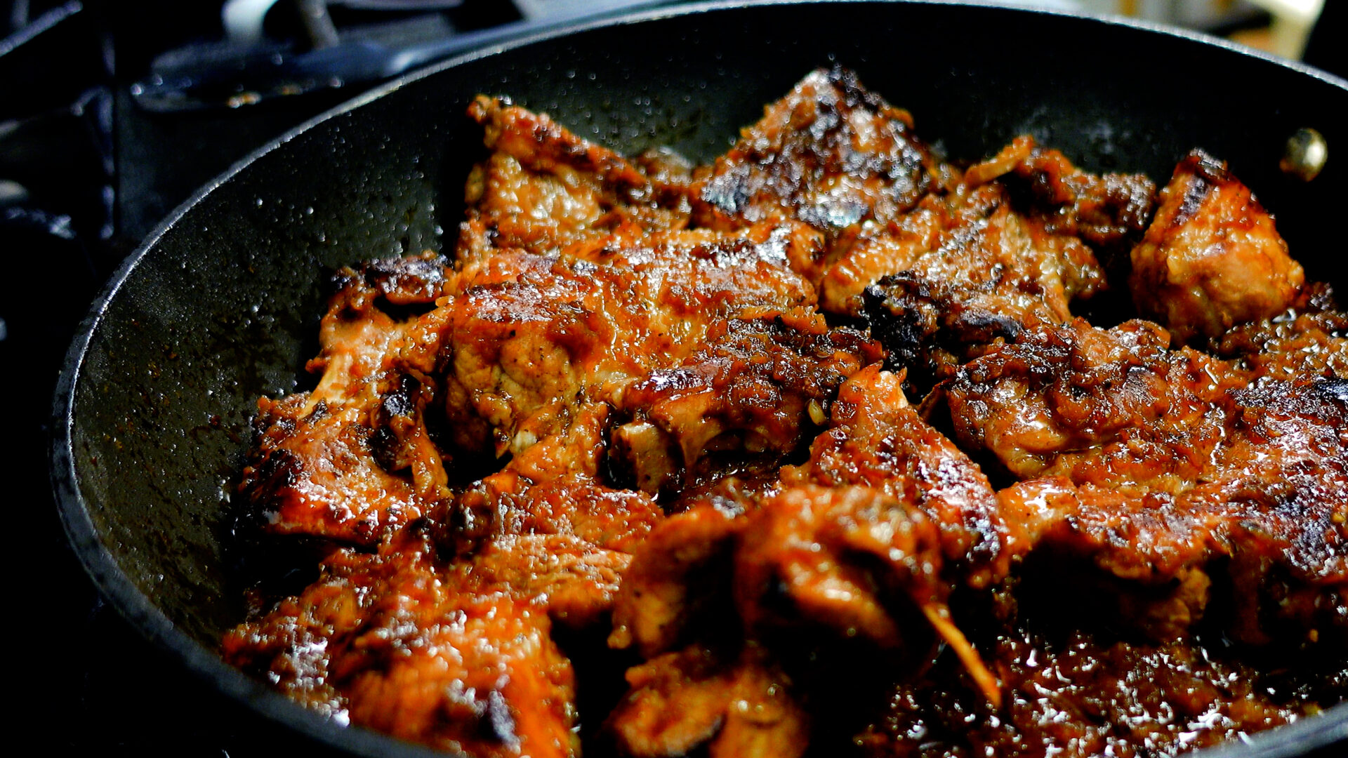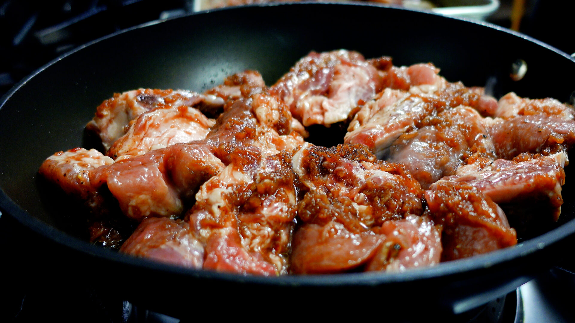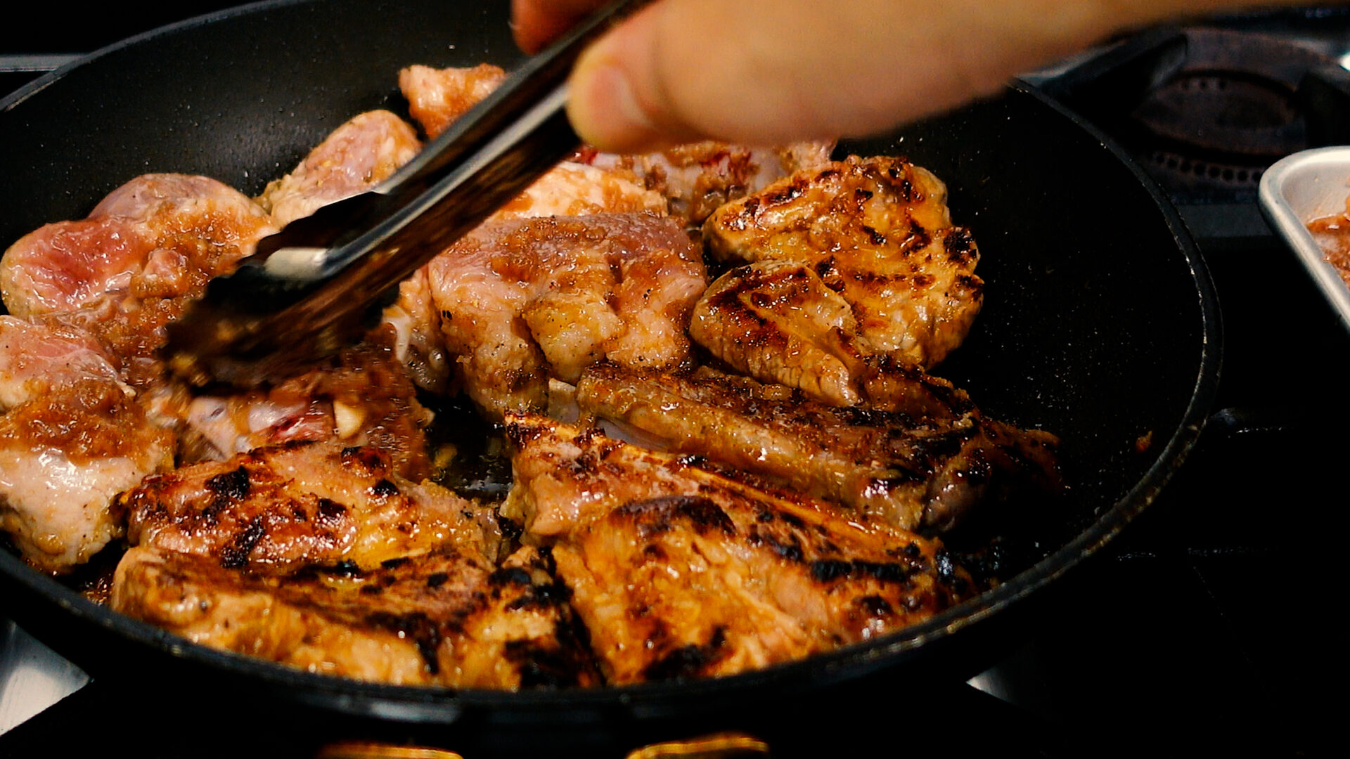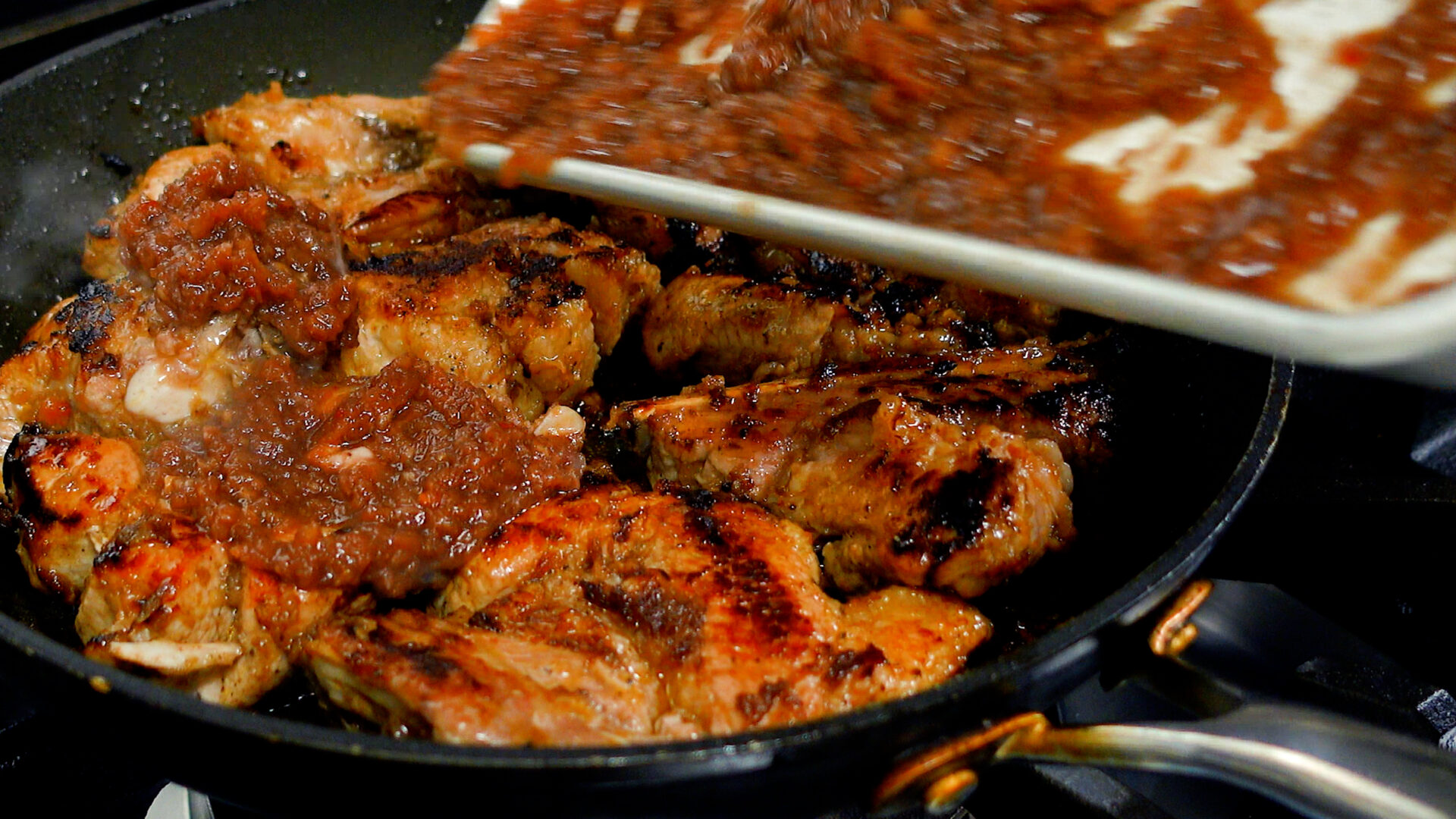 焼き目がついたらタレを全て加える。弱火に落とし、蓋をして15分蒸し焼きにする(5分おきに上下を入れ替え、タレを絡める)。
