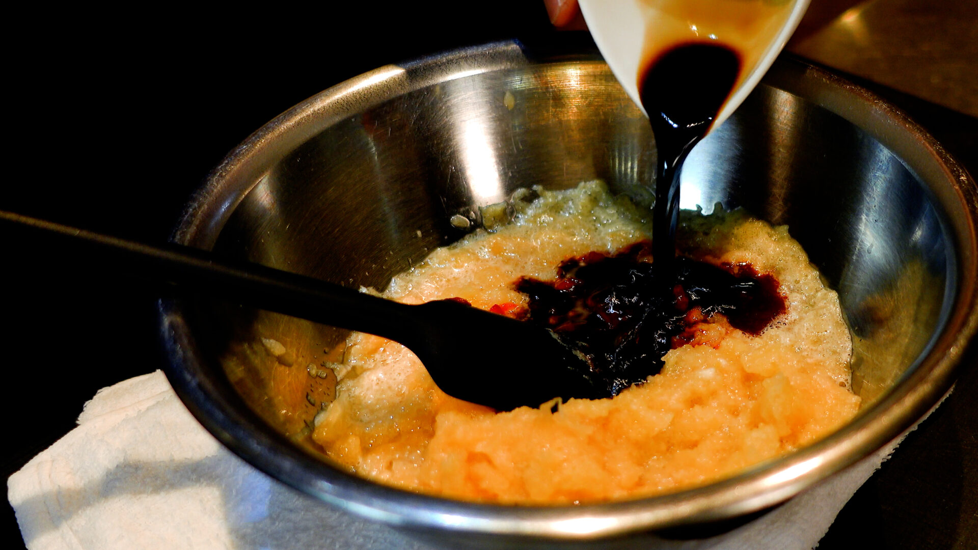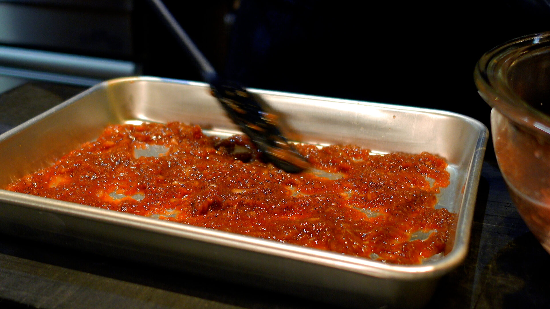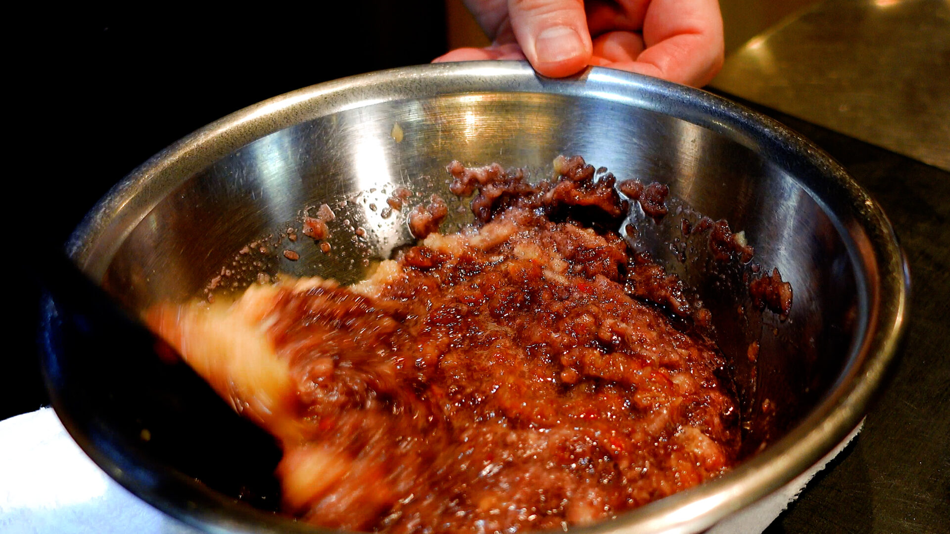 ◆コチュジャン 大さじ2、豆板醤 大さじ1、醤油 大さじ1、はちみつ 大さじ1/2、おろしにんにく 1片分、おろし生姜 1かけ分、粗熱をとっておいた赤ワインを加え混ぜ合わせる。