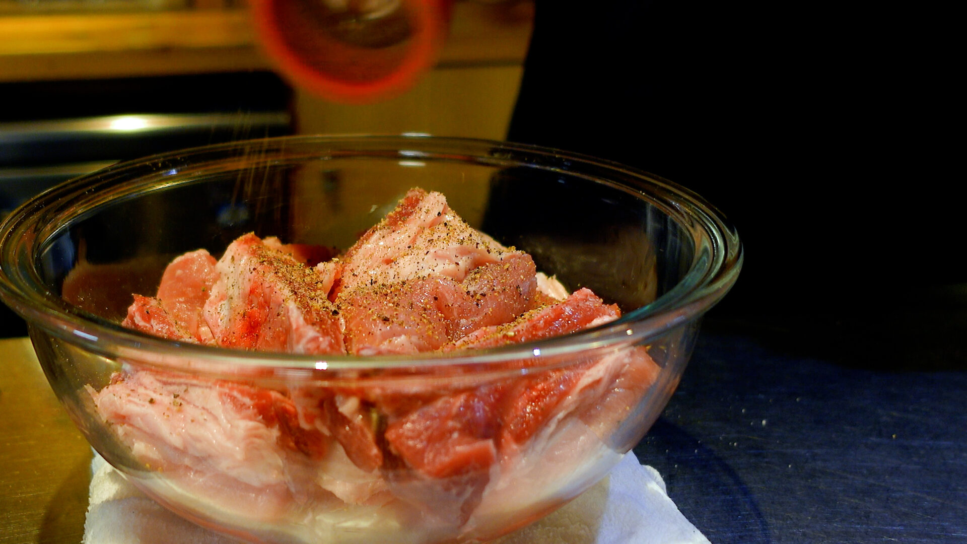 ボウルにうつし、塩、粗挽き黒こしょうで下味をつける。ごま油を加え手でしっかりと揉み込み、15分おく。
