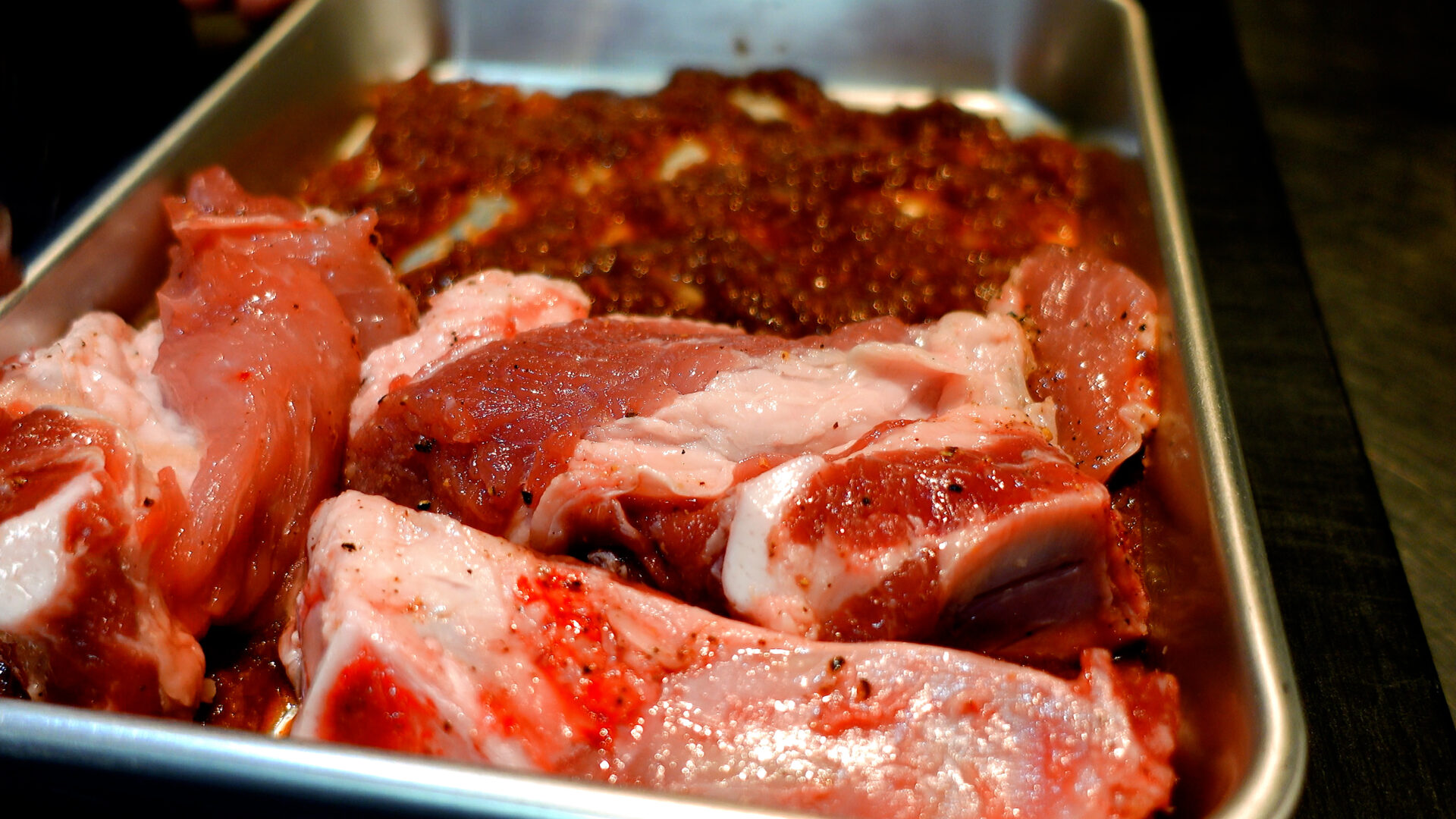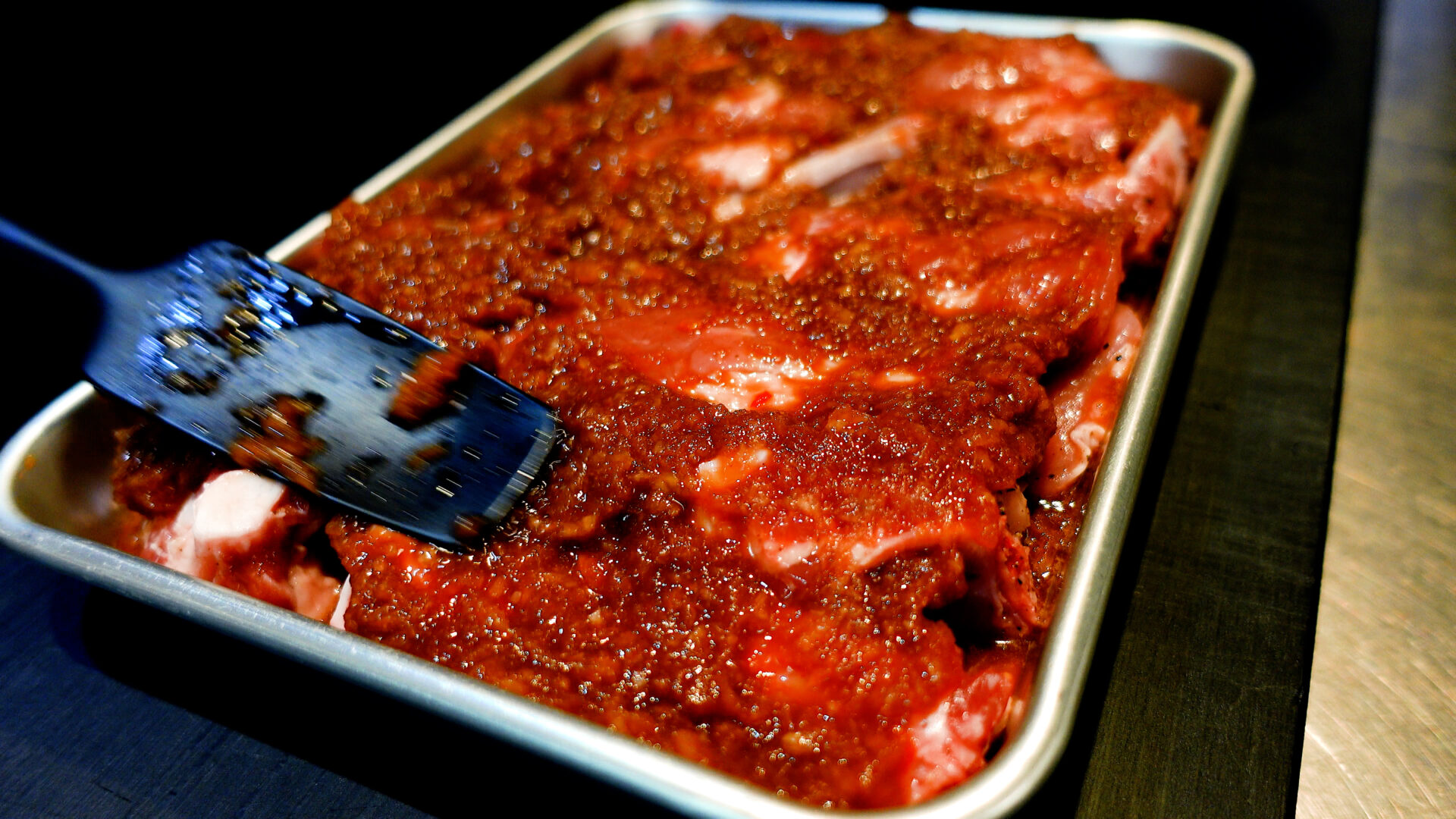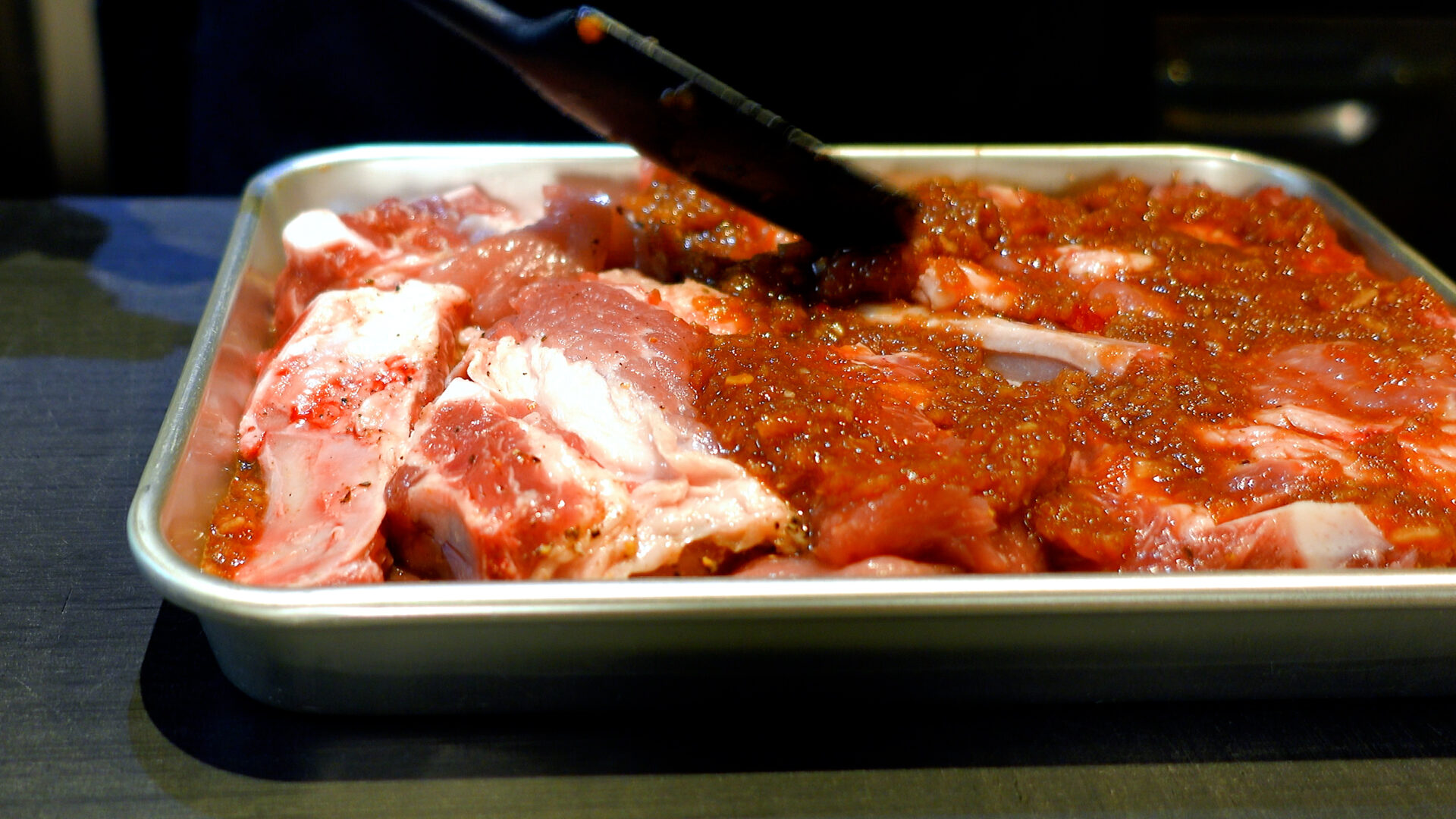 バットにタレの半量を広げ、スペアリブを並べる。