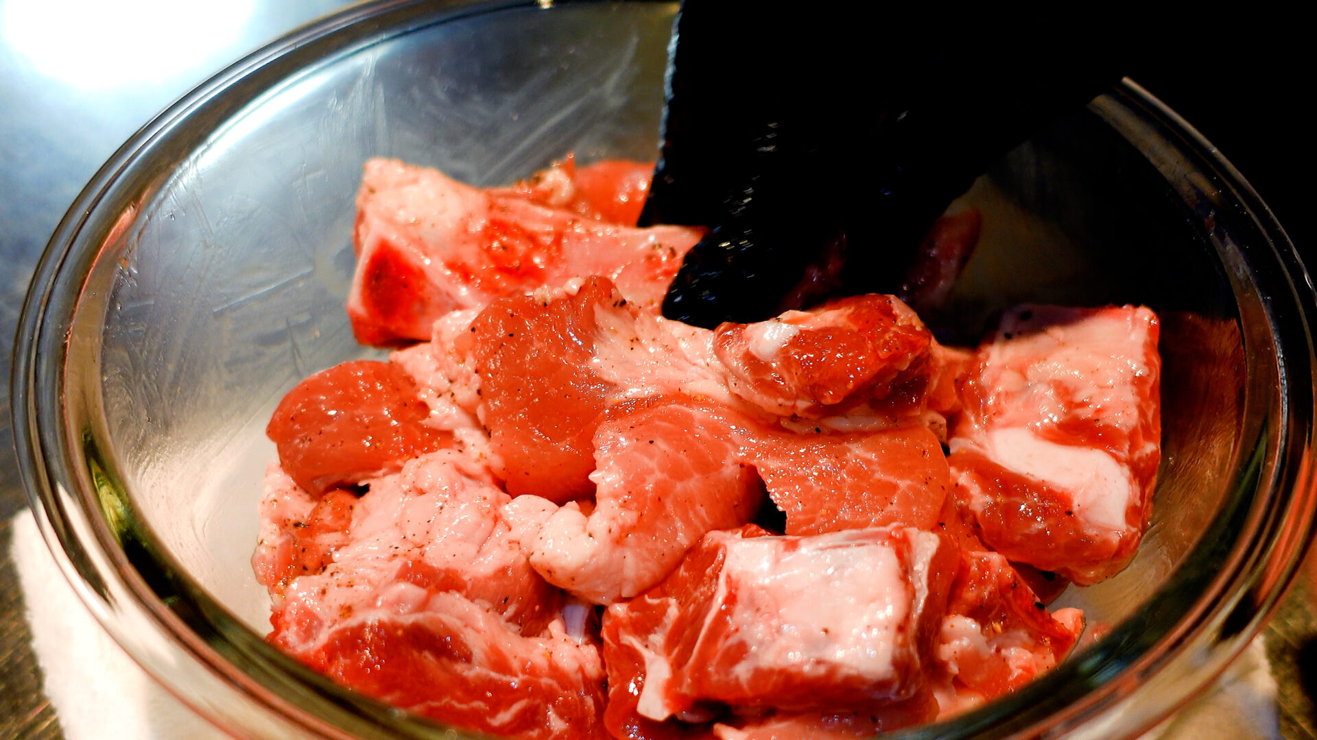 スペアリブの骨側に切り込みを入れる。肉全体にフォークで穴をあける。