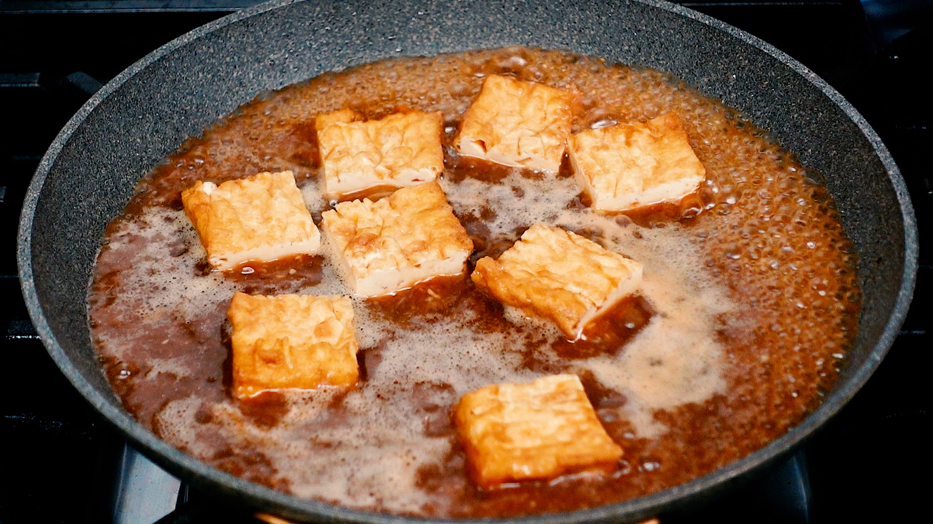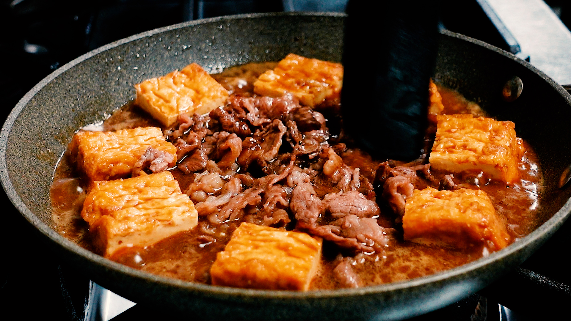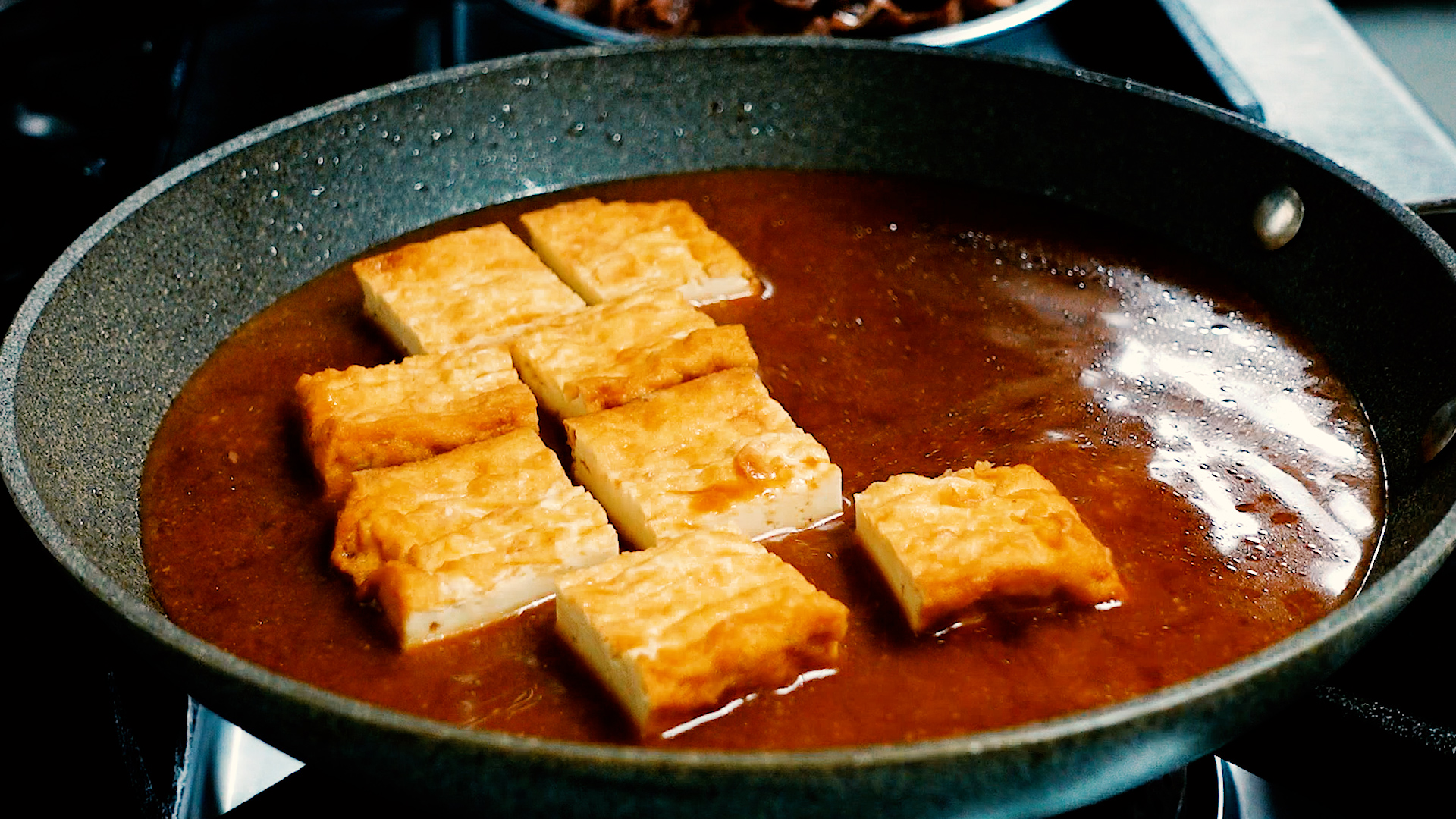 フライパンは洗わず、合わせておいたつゆ、厚揚げを加え中火にかける。