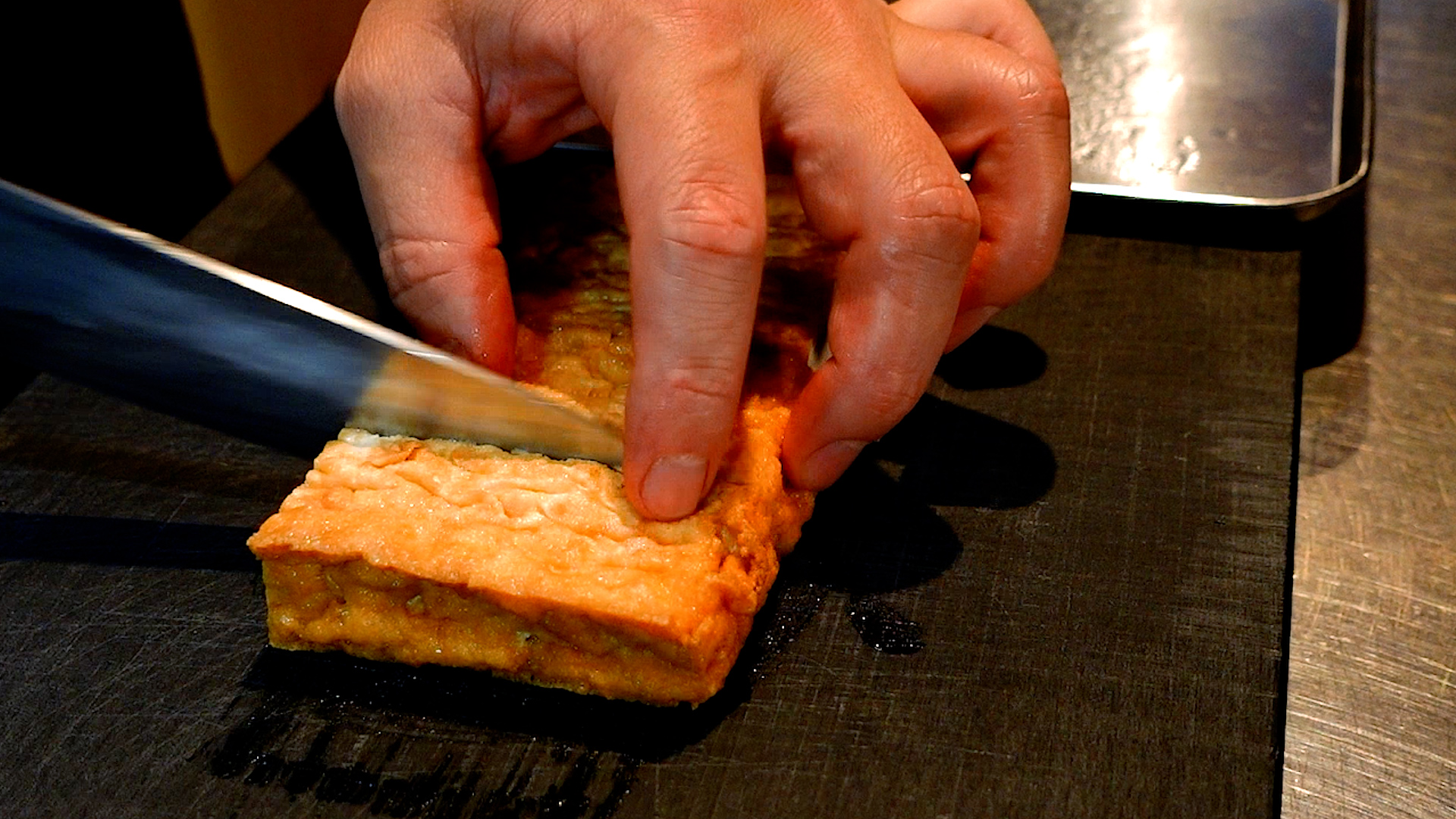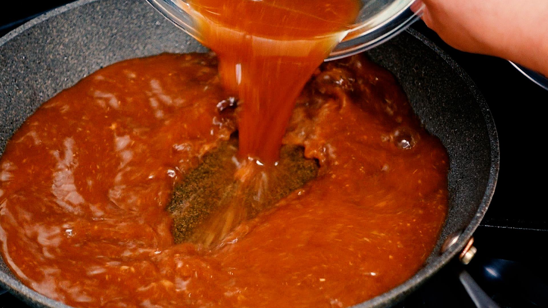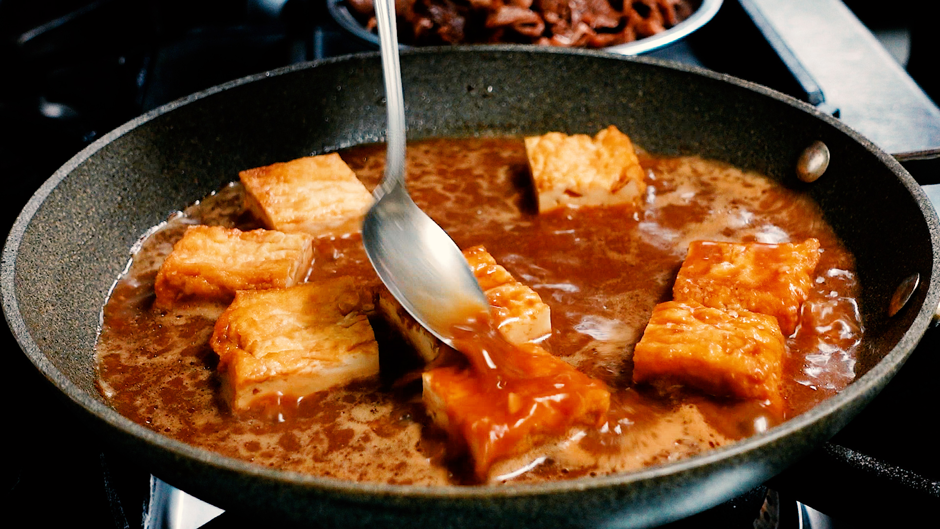 フライパンは洗わず、合わせておいたつゆ、厚揚げを加え中火にかける。