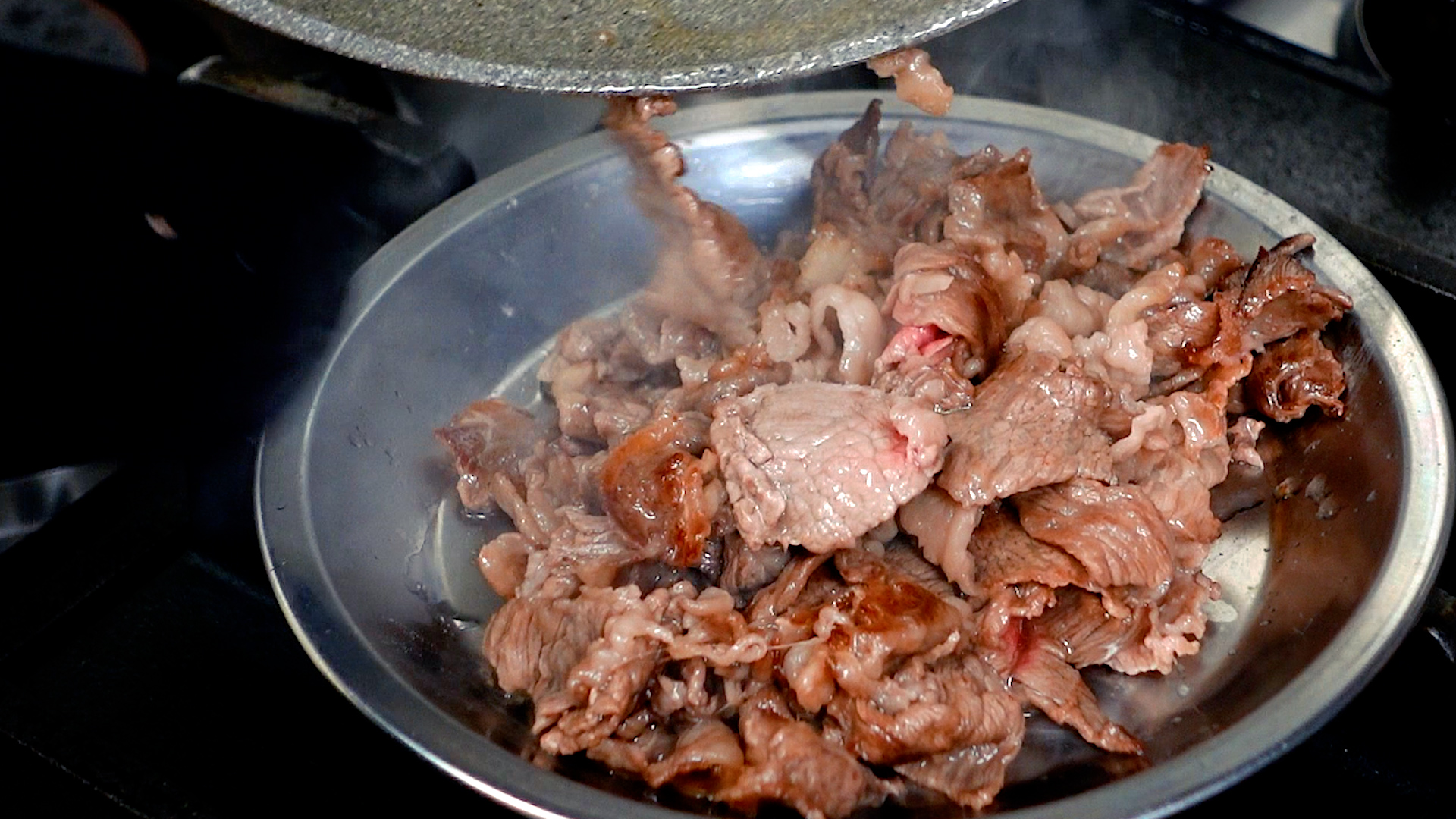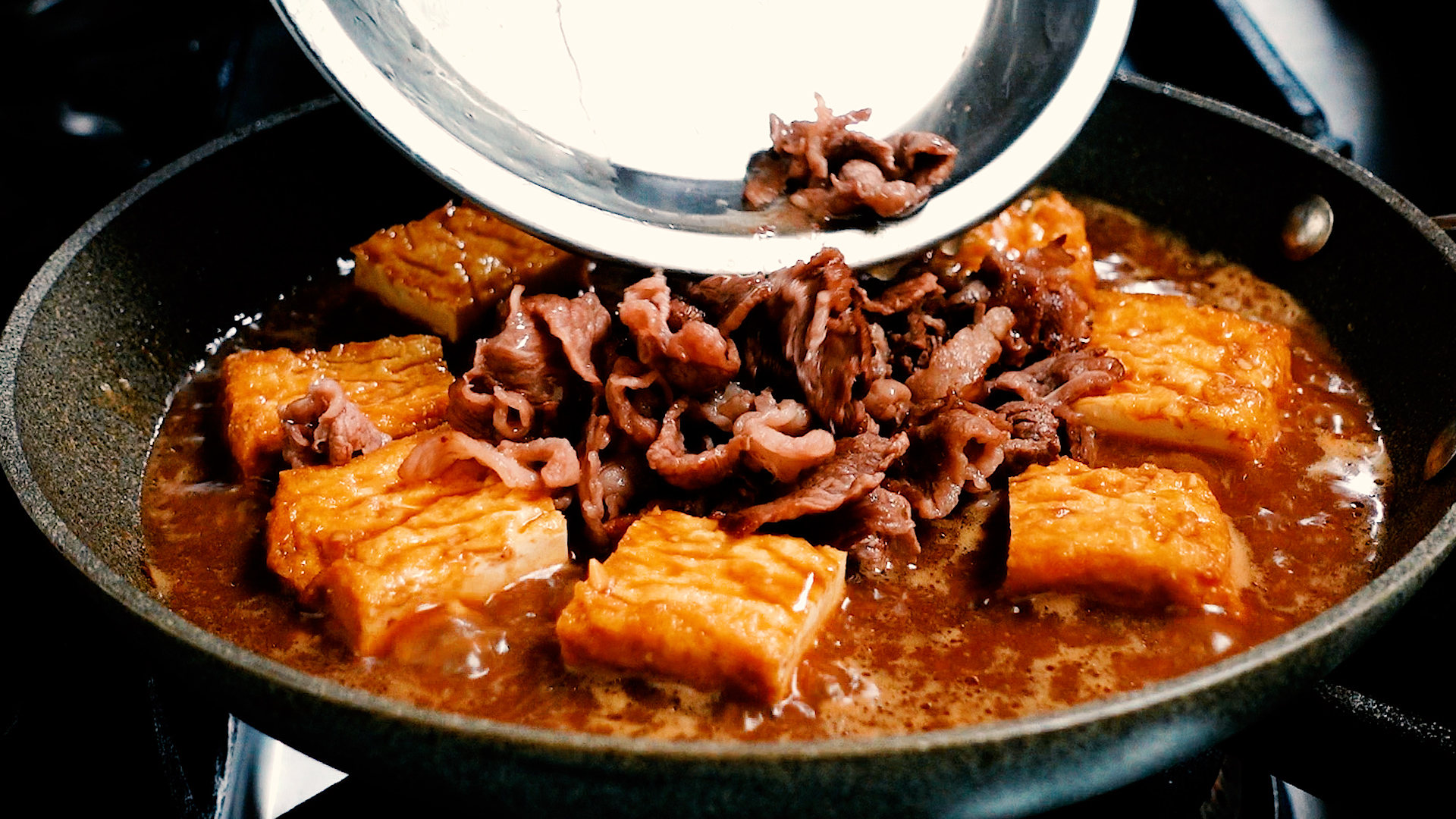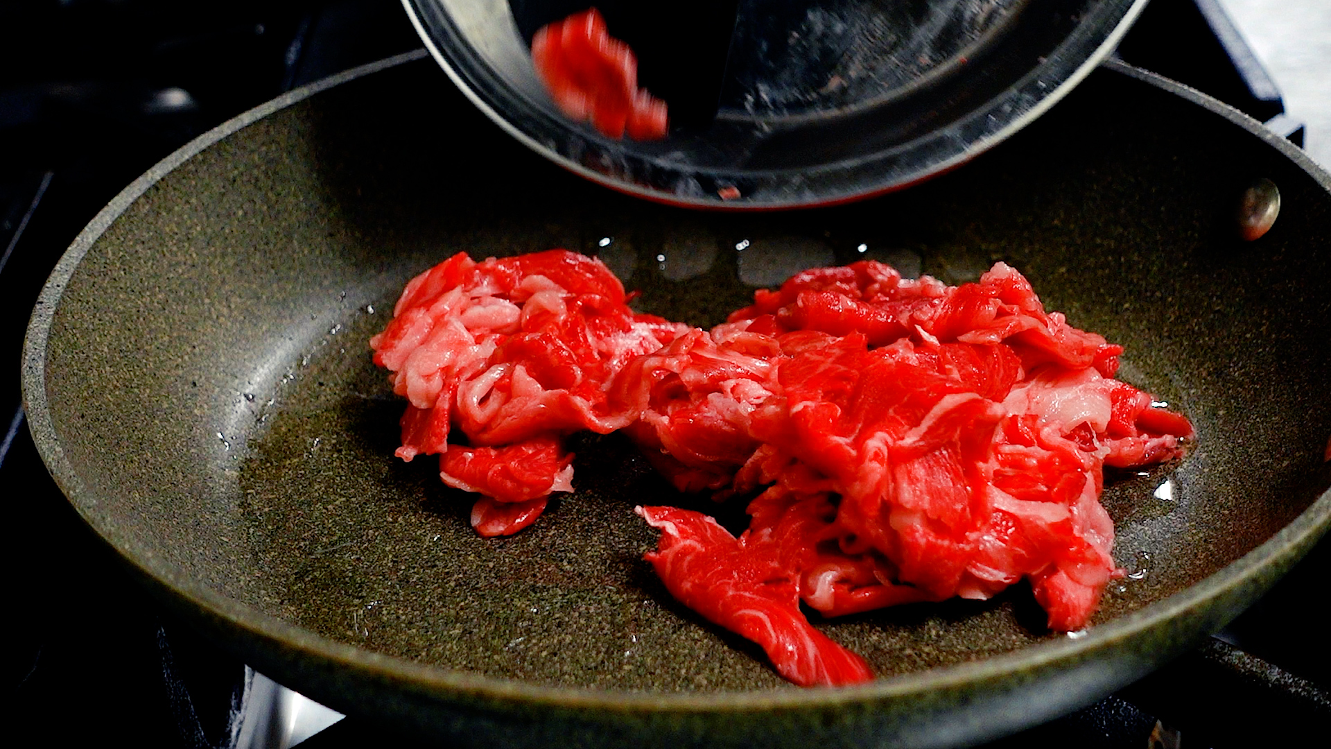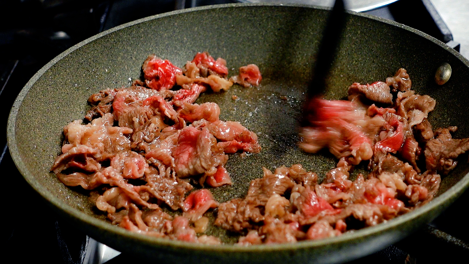 💡牛肉を先に炒めうまさを引き出し、フライパンに残ったうまみとつゆを合わせおいしさアップ!