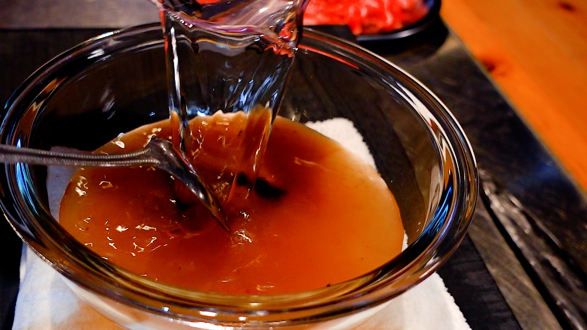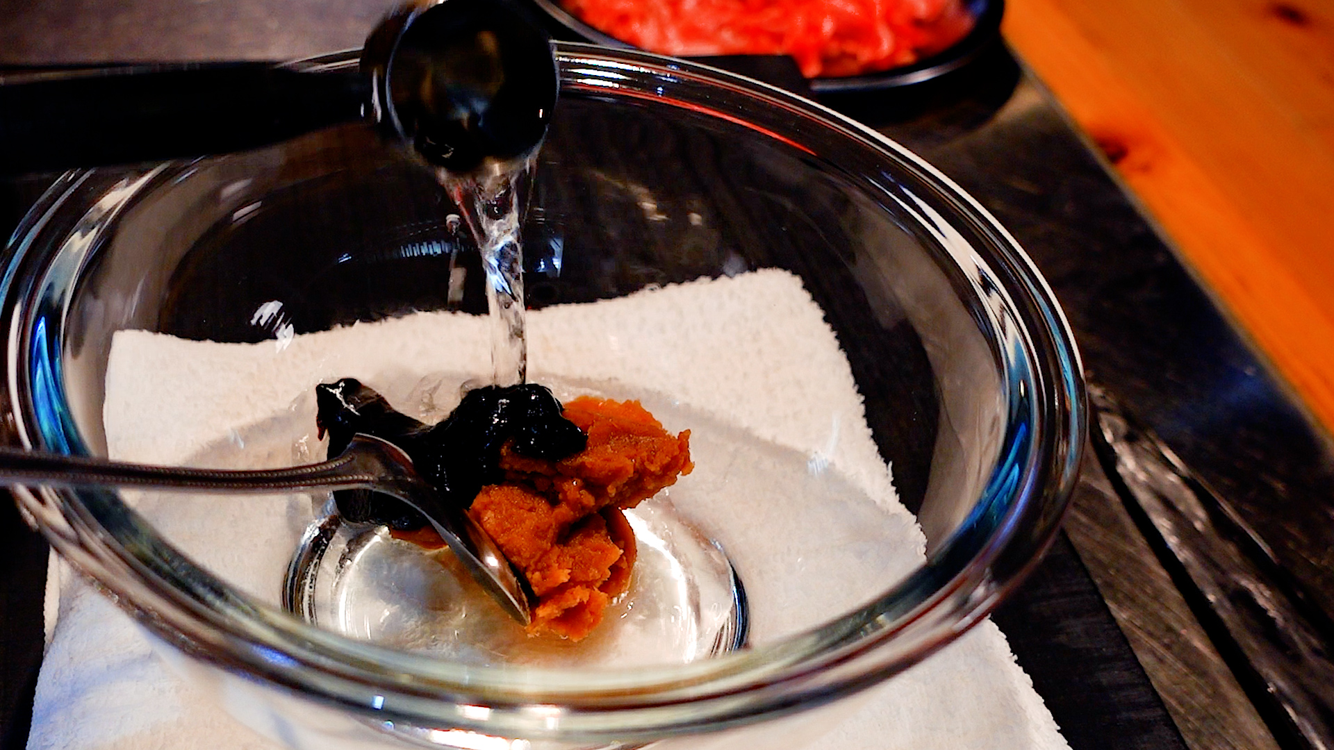 ボウルに◆みそ 大さじ2、甜麺醤 大さじ1、料理酒 大さじ1、砂糖 小さじ1、白だし 大さじ1/2、水 300mlを入れよく混ぜ、みそを溶かす。