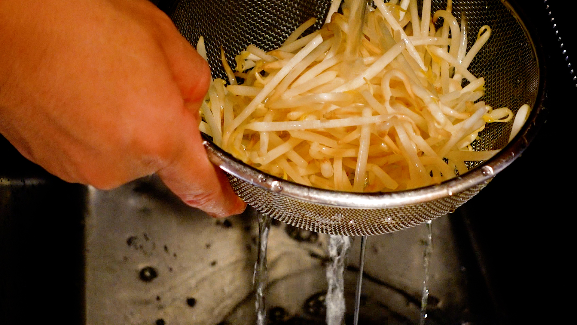豚バラ肉薄切りは食べやすい大きさに切る。もやしは洗い、水気を切る。