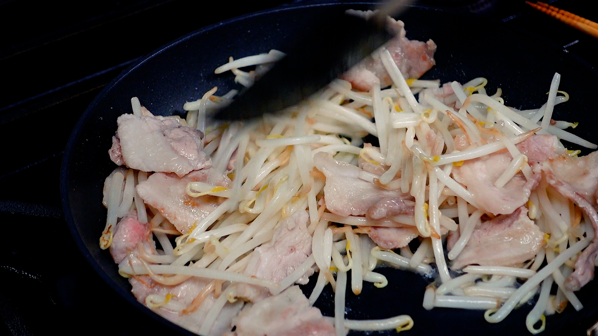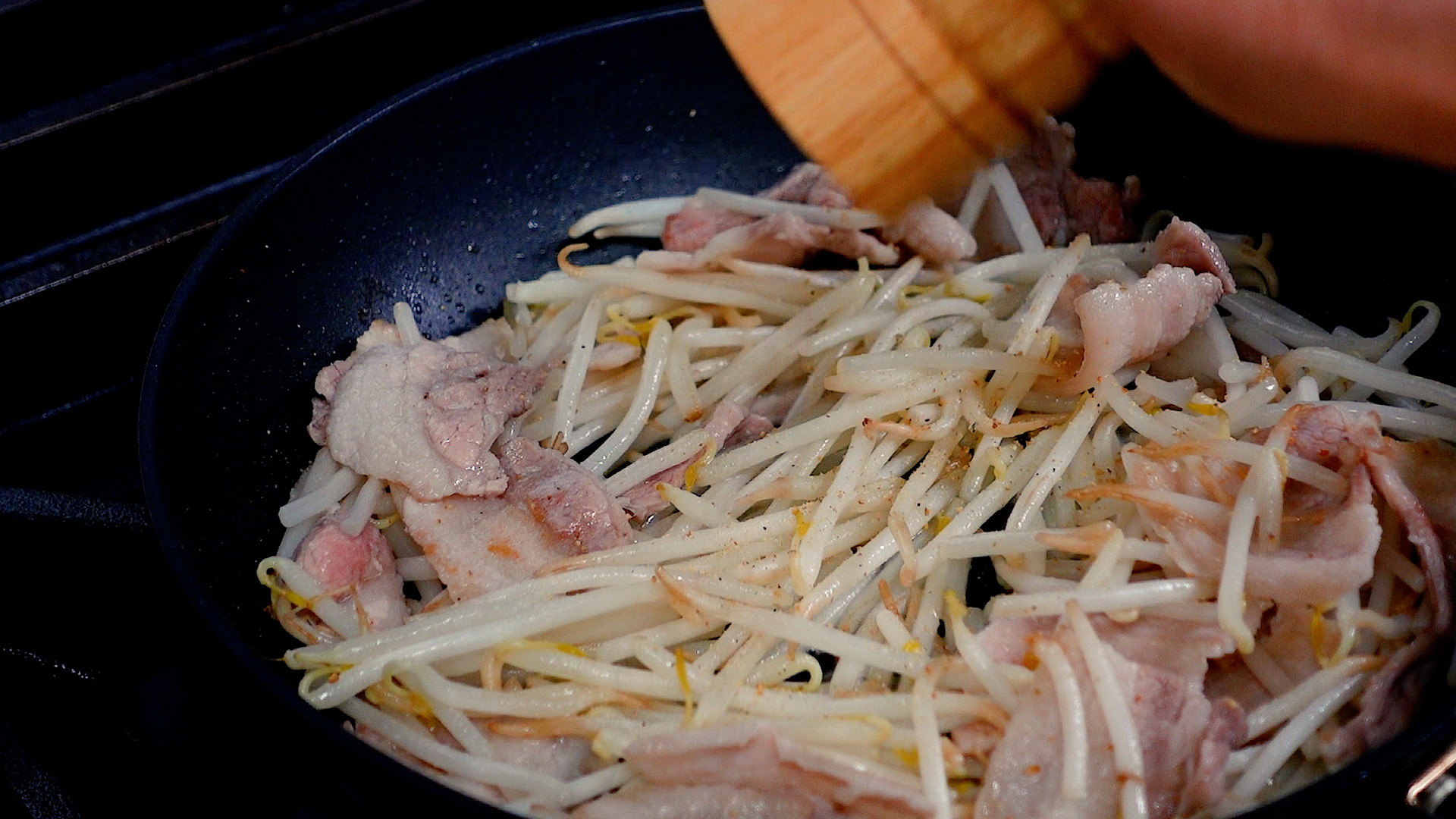 豚肉に7割ほど火が入ったらもやしを加え炒める。しんなりしてきたら塩 1つまみ、こしょう 少々をし、もやしの水分がなくなるまで炒める。